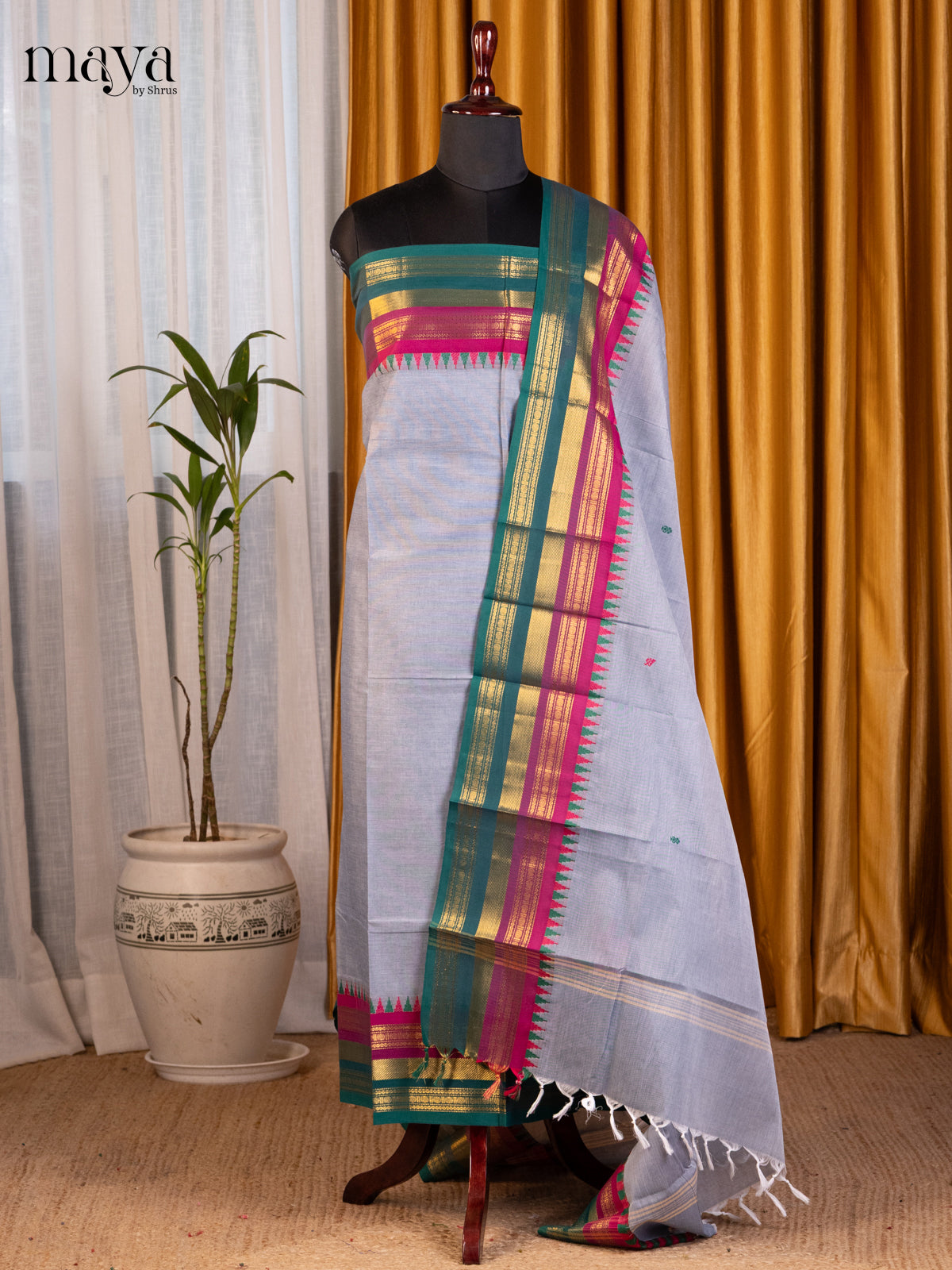 Pretty Lite Blue Unstitched Chettinad Top & Dupatta is crafted with elegant plain top featuring a striking contrast pink zari border for a touch of sophistication and charm.
