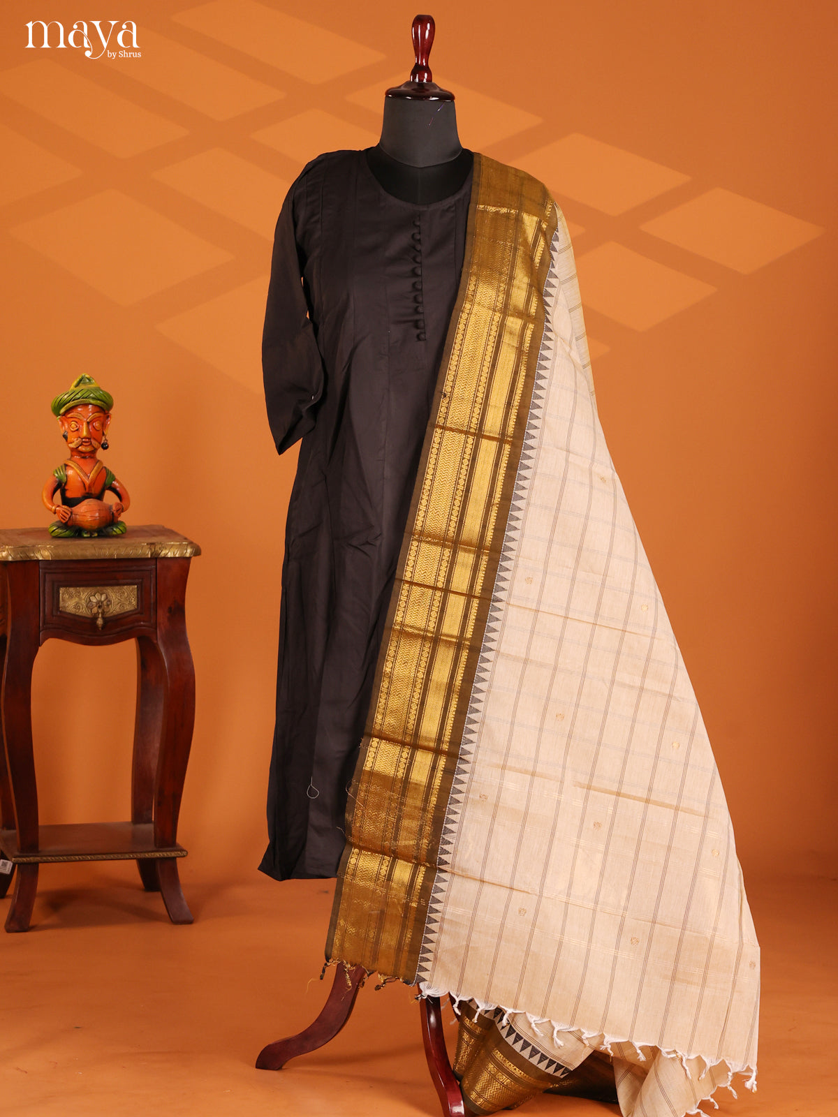 Charming Cream Chettinad Cotton Dupatta adorned with stripes pattern ,classic Mehandi Green zari borders.