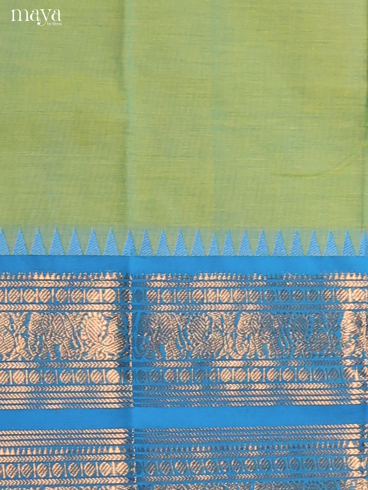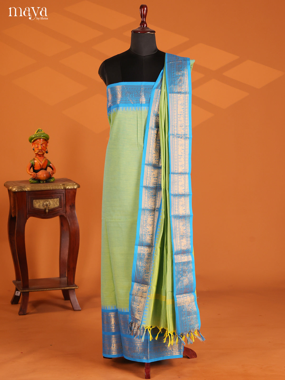 Elegant Pista Green Unstitched Chettinad Top & Dupatta is crafted from exquisite Chettinad cotton, adorned with a rich contrast blue zari border that adds a refined touch of elegance and traditional charm.