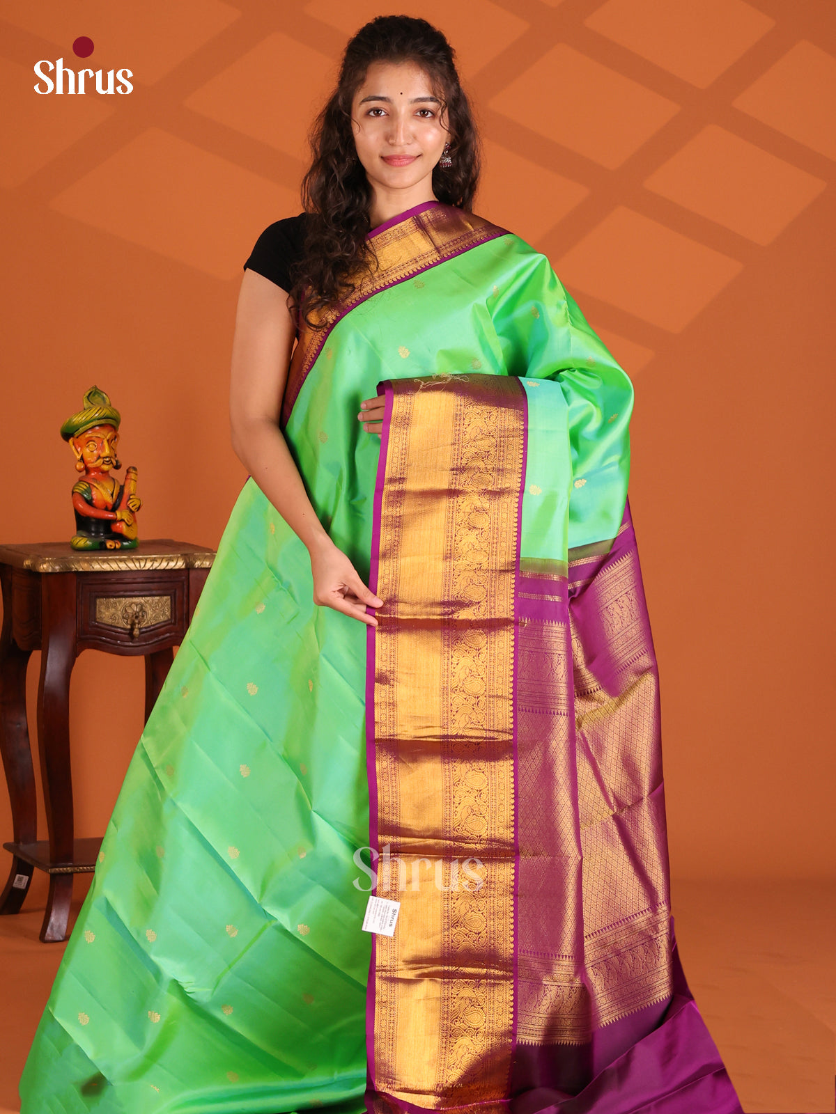 Exquisite Pista Green Kanchipuram Silk Saree captivates with intricately woven zari buttas that lend a graceful rhythm to the body. The elegant contrast Purple zari border adorned with peacock in floral vines adds a regal charm, while the richly woven brocade pallu elevates its timeless appeal. Paired with a plain Purple contrast blouse featuring a zari border, this ensemble blends tradition with refined sophistication. For those seeking timeless elegance, this is one of the finest examples of bridal kanjivaram silk sarees, crafted to leave a lasting impression.