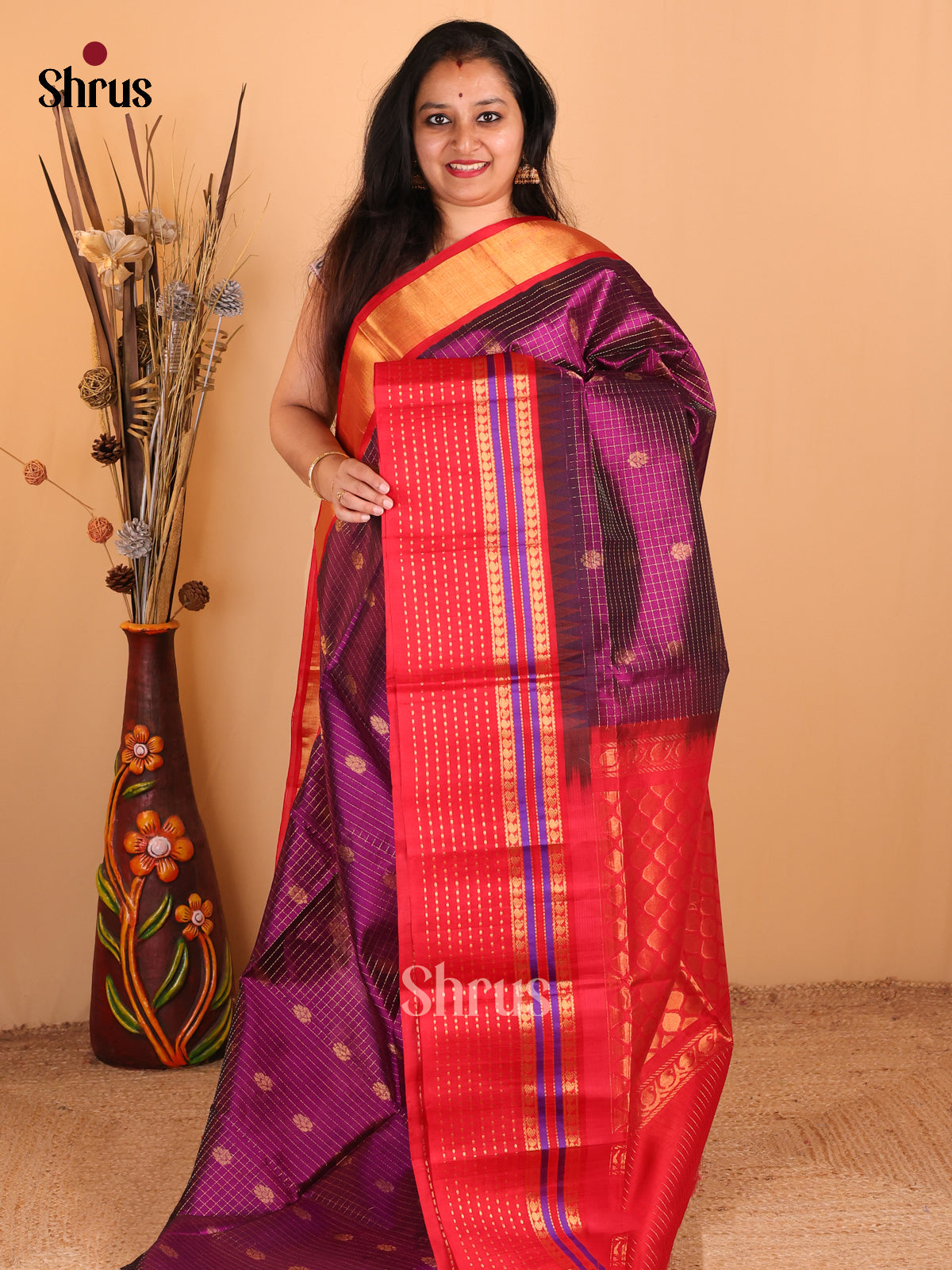 Chic Violet Silk Cotton Saree with Zari Checks Adorned With Red Border & Pallu With Zari