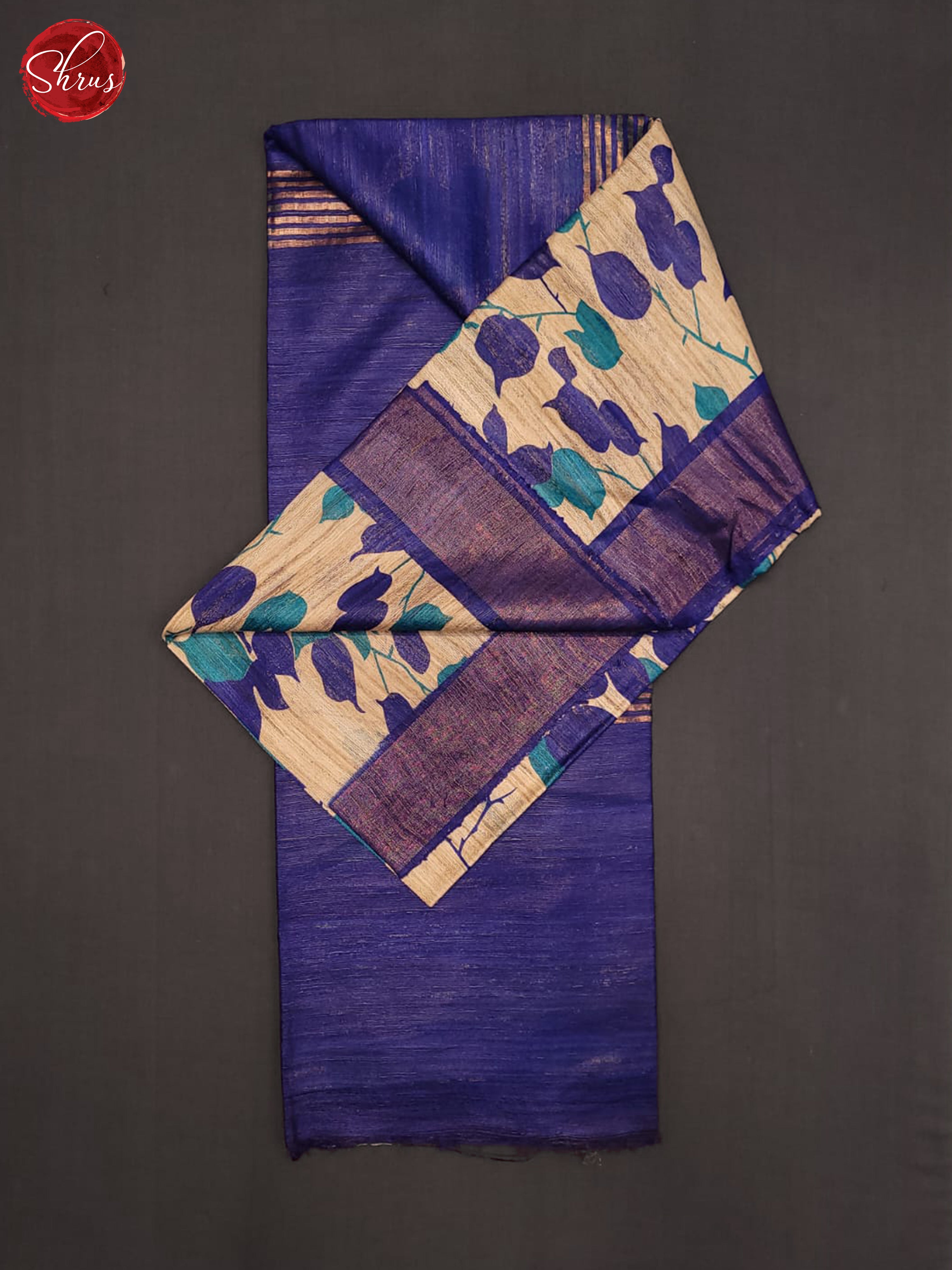 Pretty beige Tussar saree enchants with floral print on the body & bounded with contrast blue zari woven border .The rich contrast blue zari striped Pallu & contrast blue blouse with border completes the ensemble