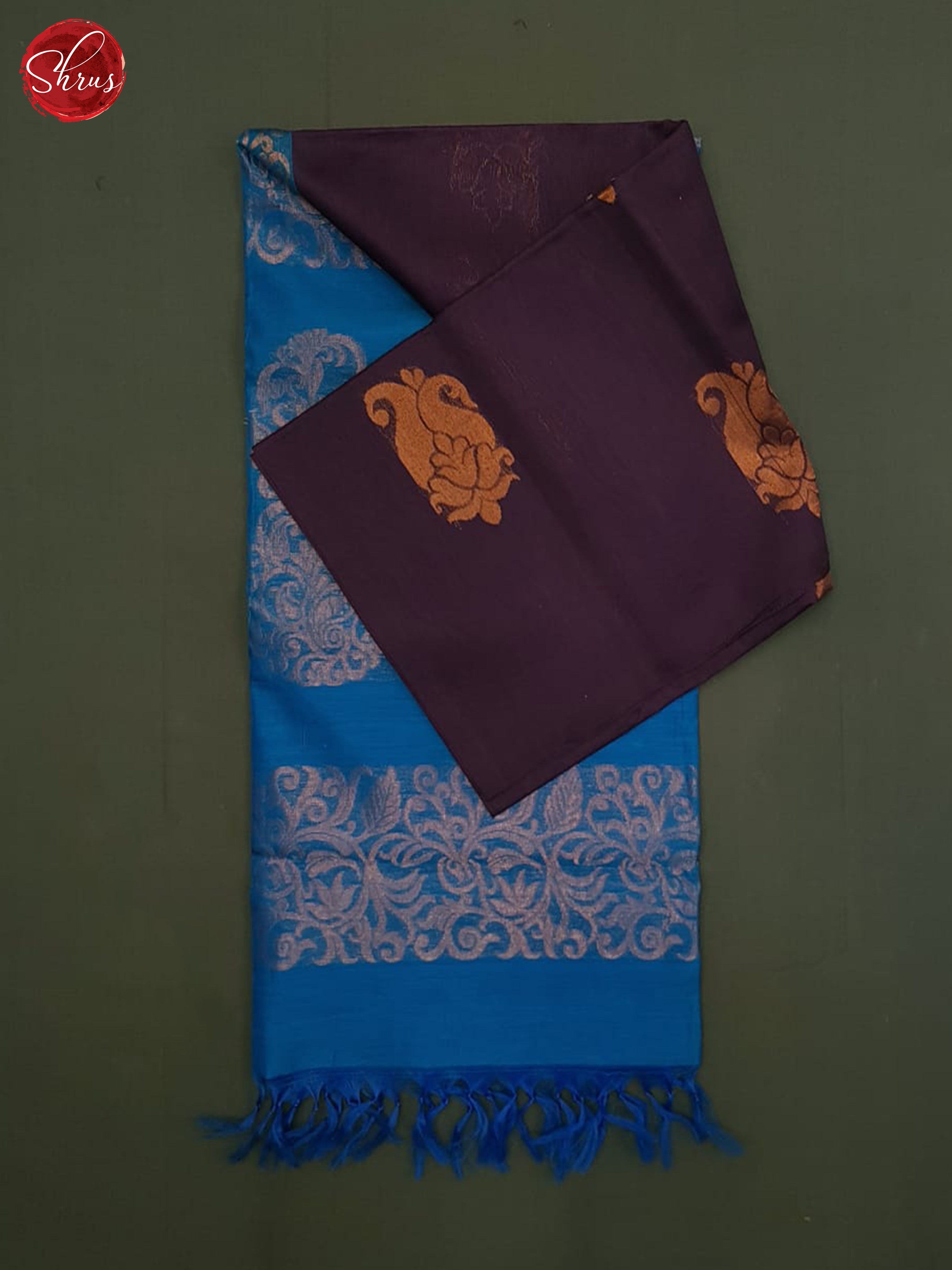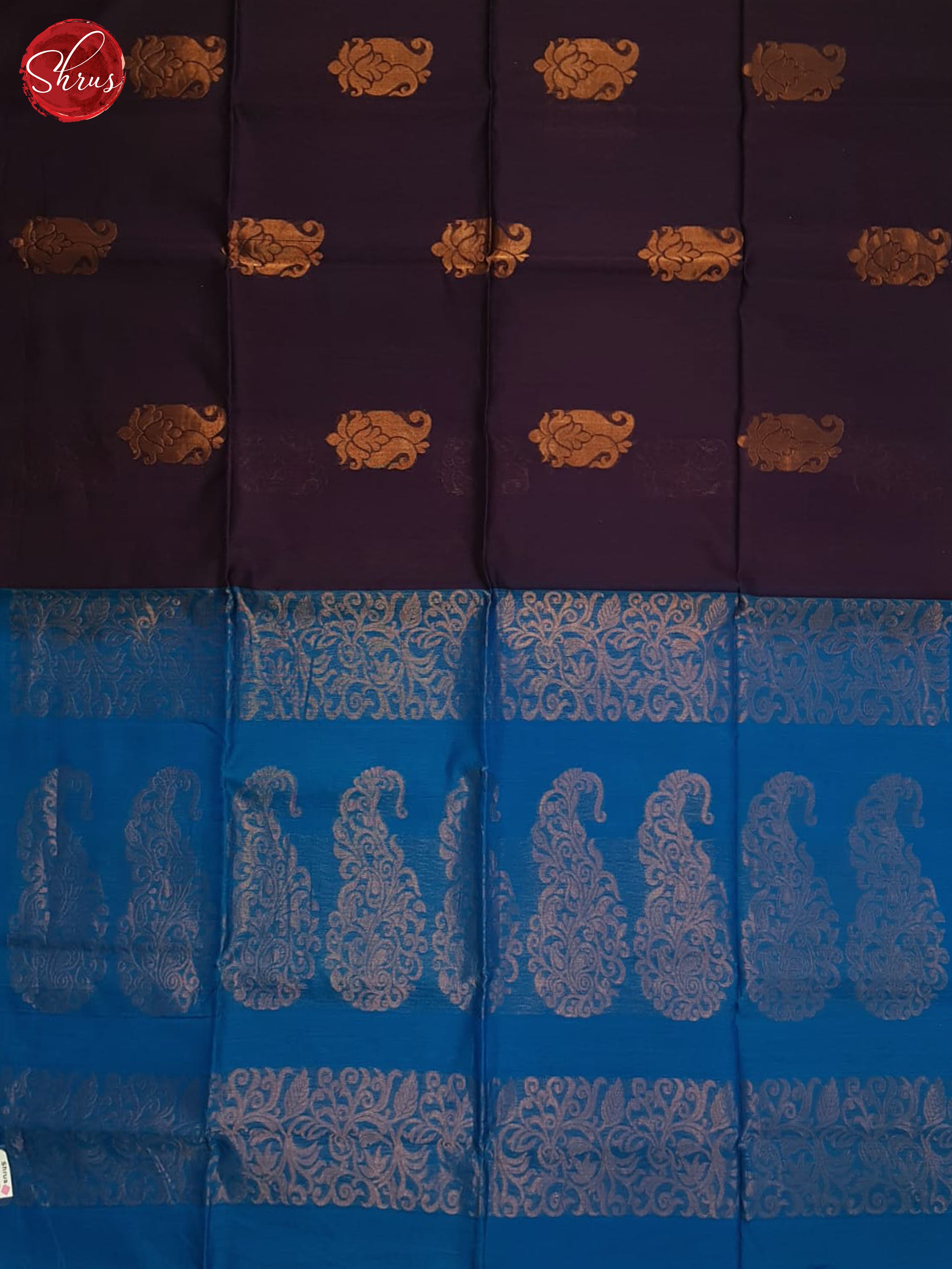 Elegant Wine Silk Cotton Saree enchants with gold zari floral motifs on the body . The contrast Blue Pallu with zari brocade And plain Blue Blouse gives a chic twist