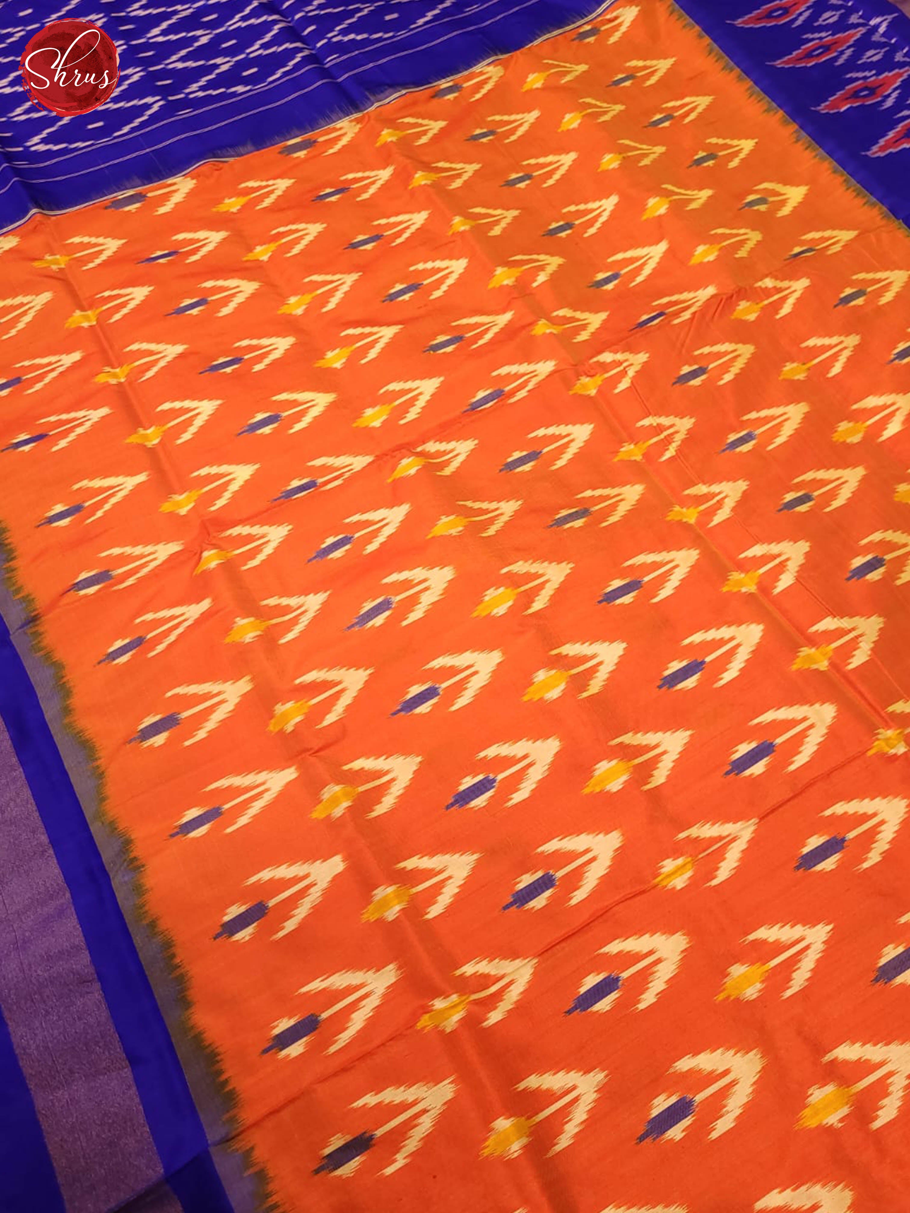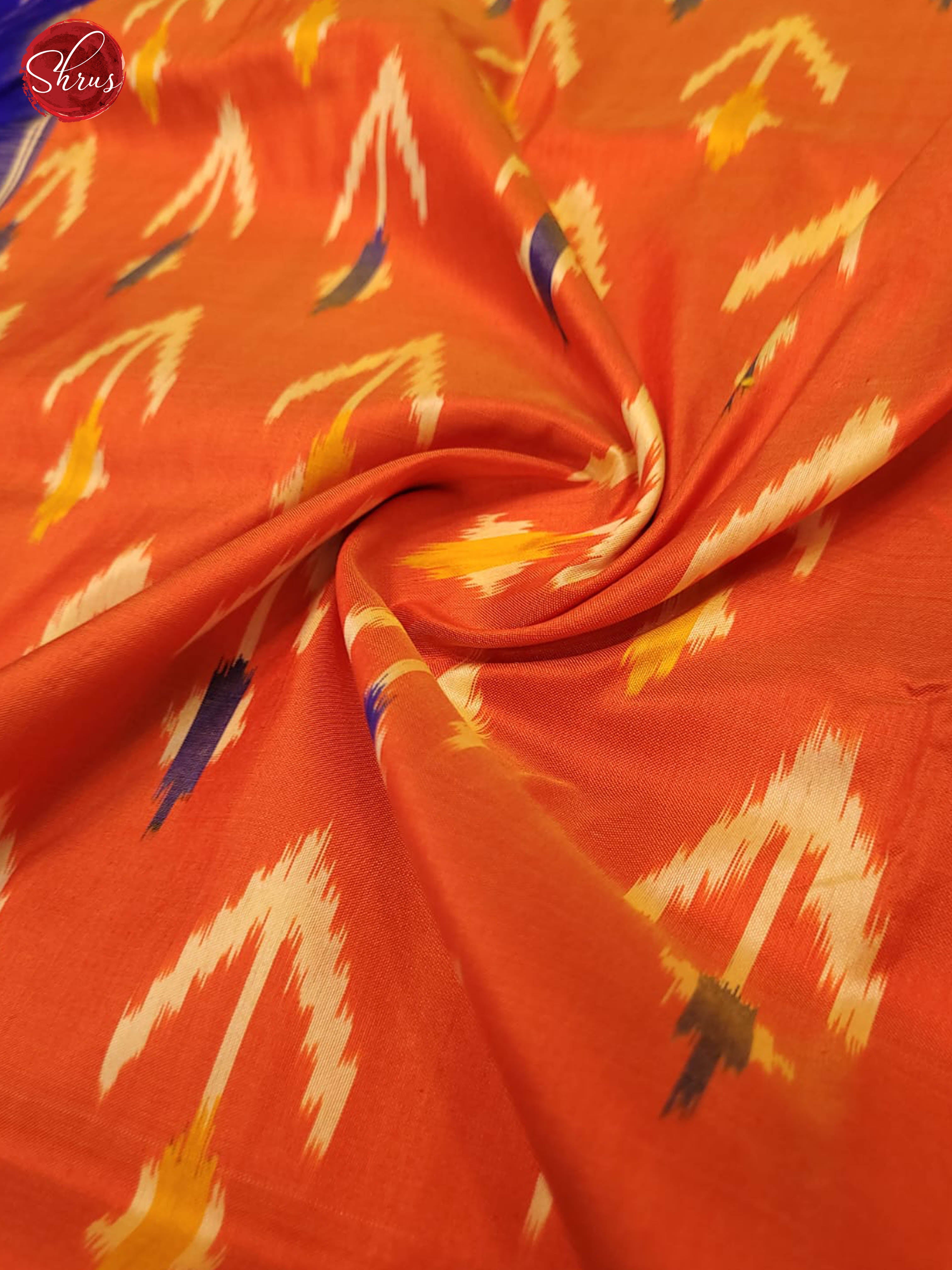 Exquisite Orange Ikkat Silk Saree enchants with ikkat floral buttas on the body . The contrast MS Blue border charms with ikkat pattern. The resplendent MS Blue ikkat woven pallu complements. The plain MS Blue blouse with zari border is a beautiful finish.