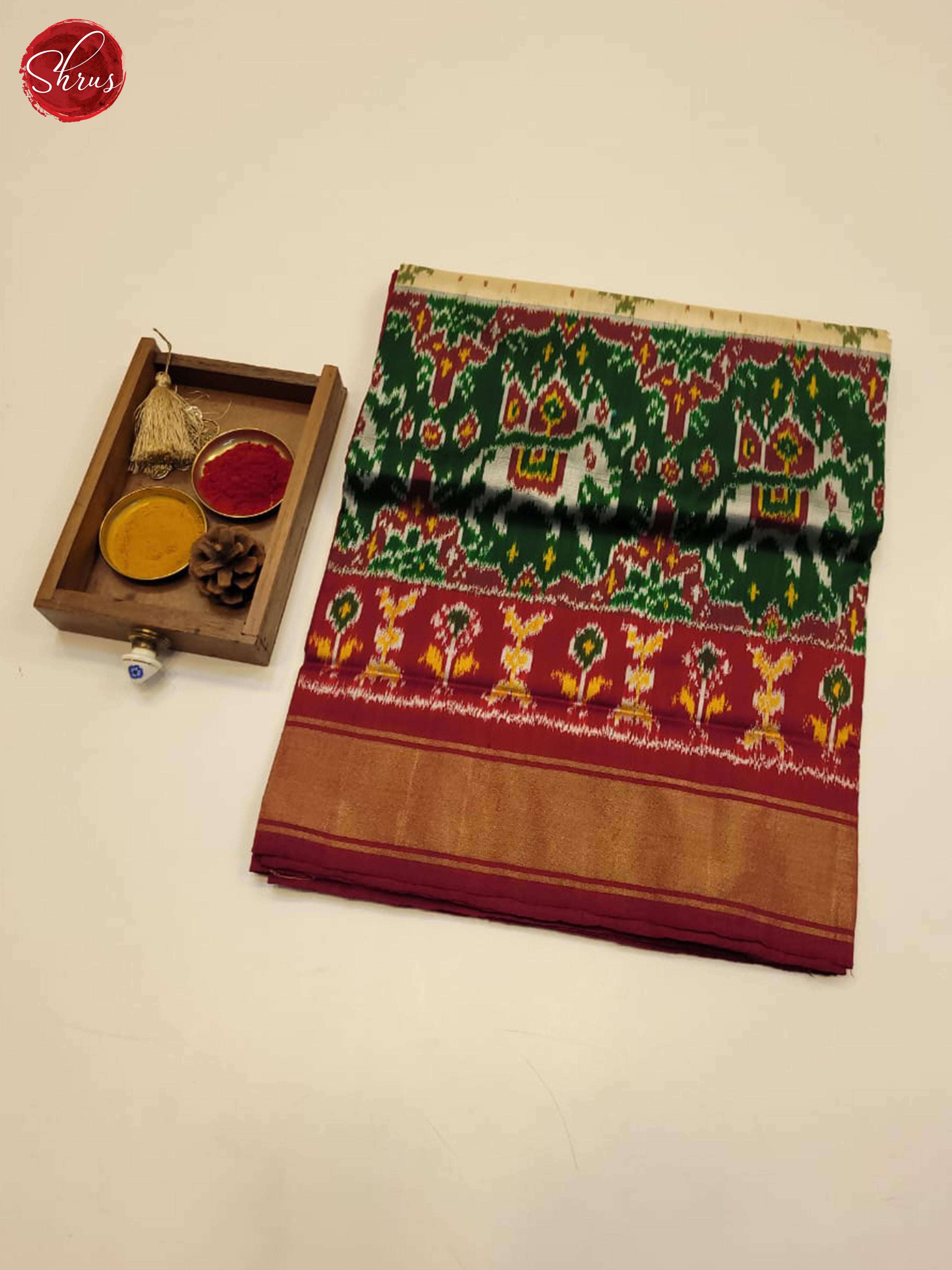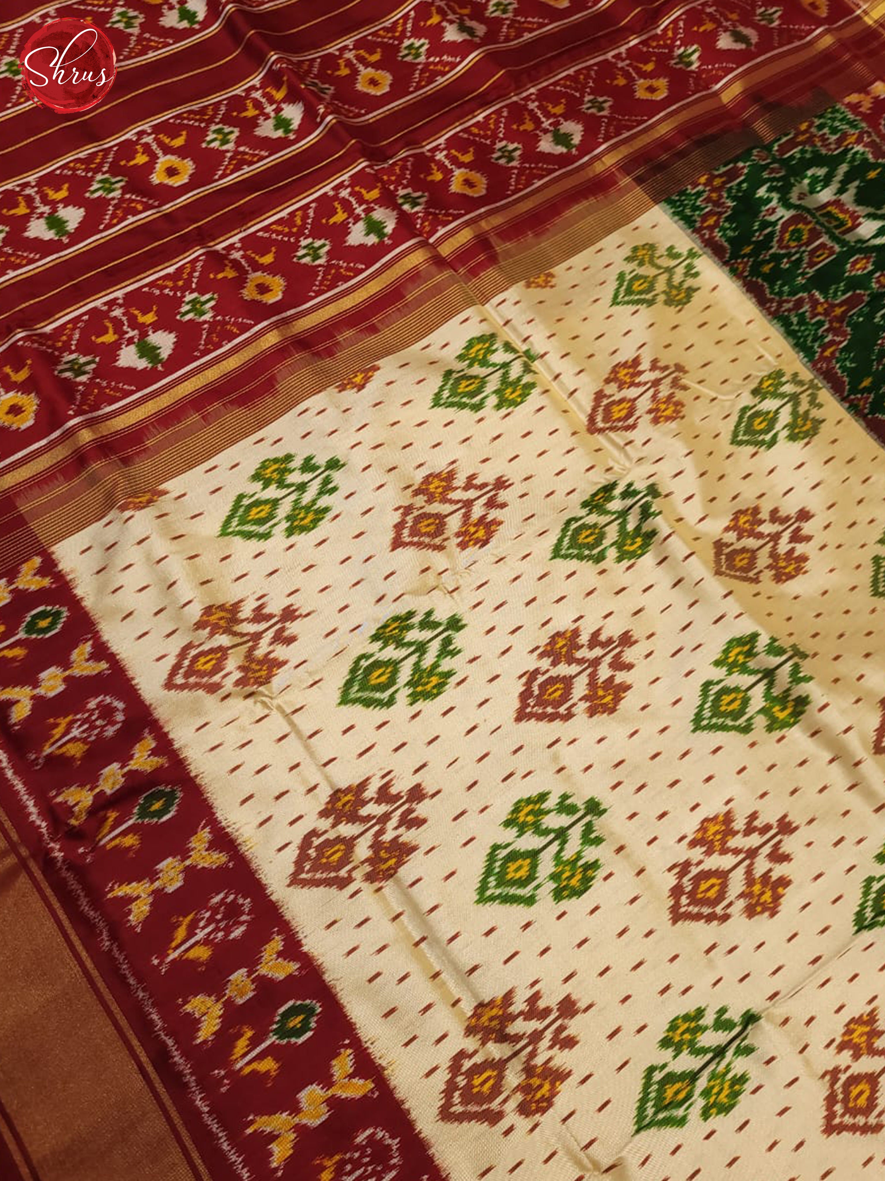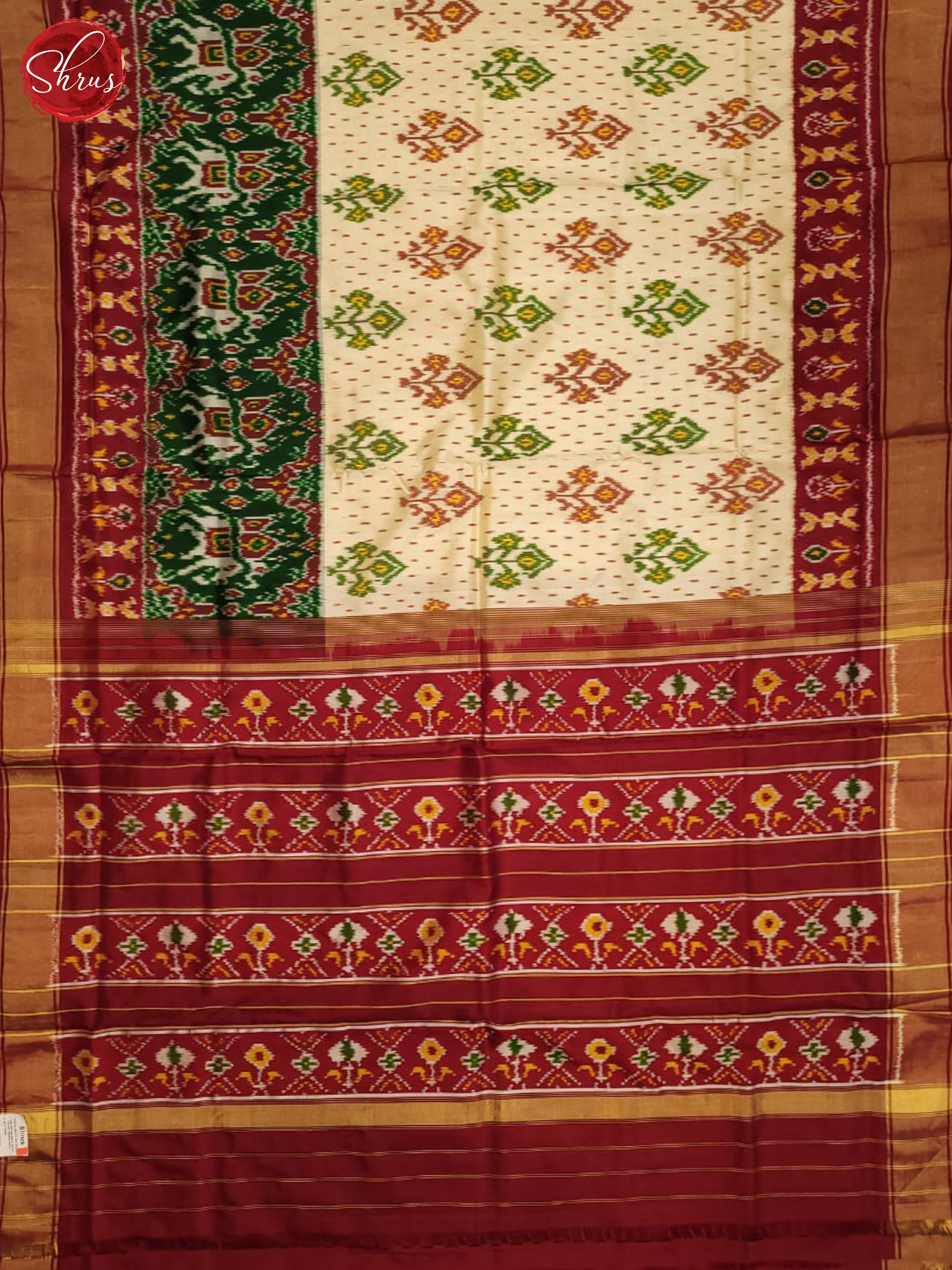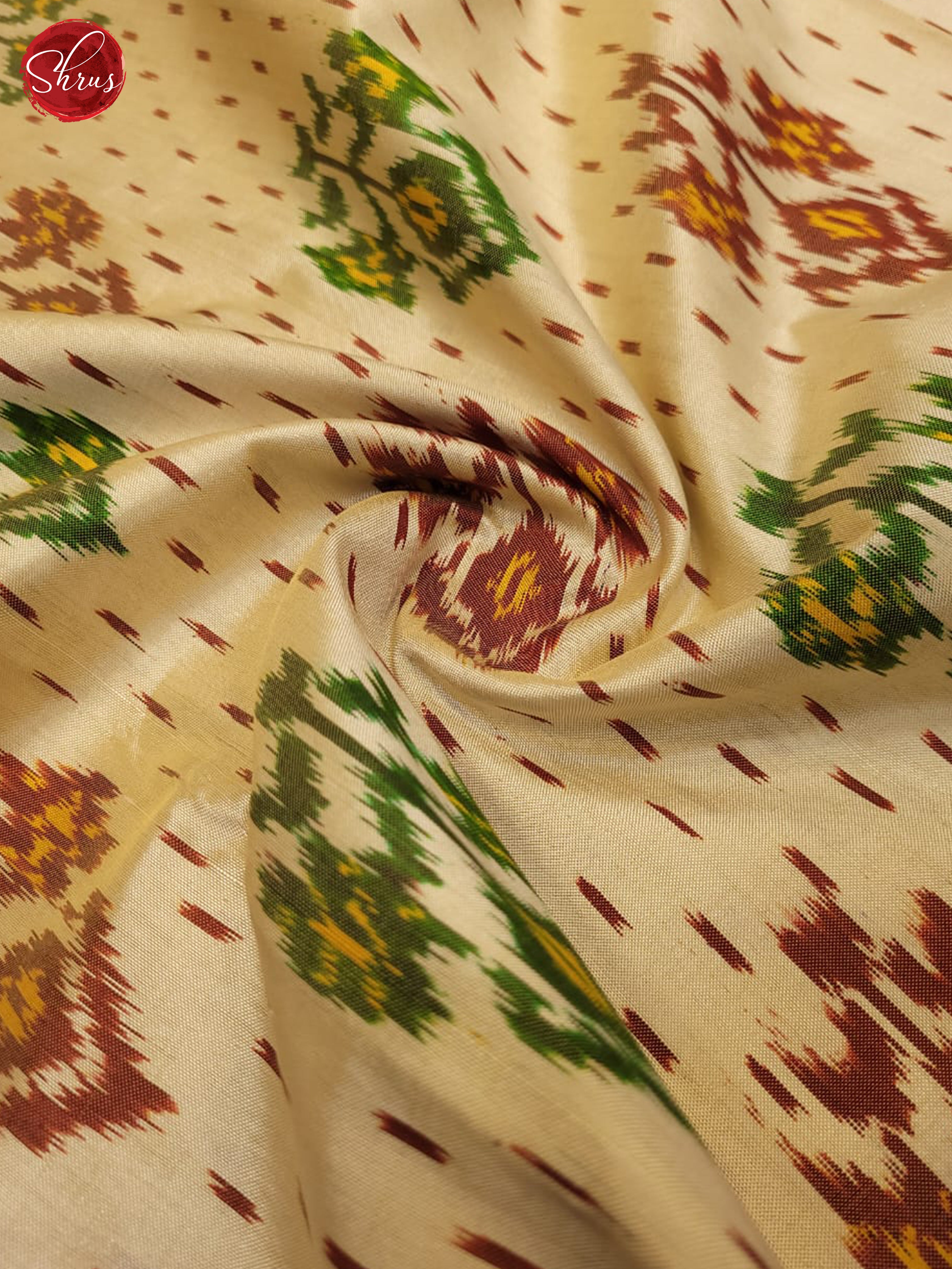 Charming Cream Ikkat Silk Saree gleaming with ikat floral motifs on the body . The contrast zari Red border and ikkat woven pallu enhance the classy appeal. The plain Red blouse with zari border complements beautifully.