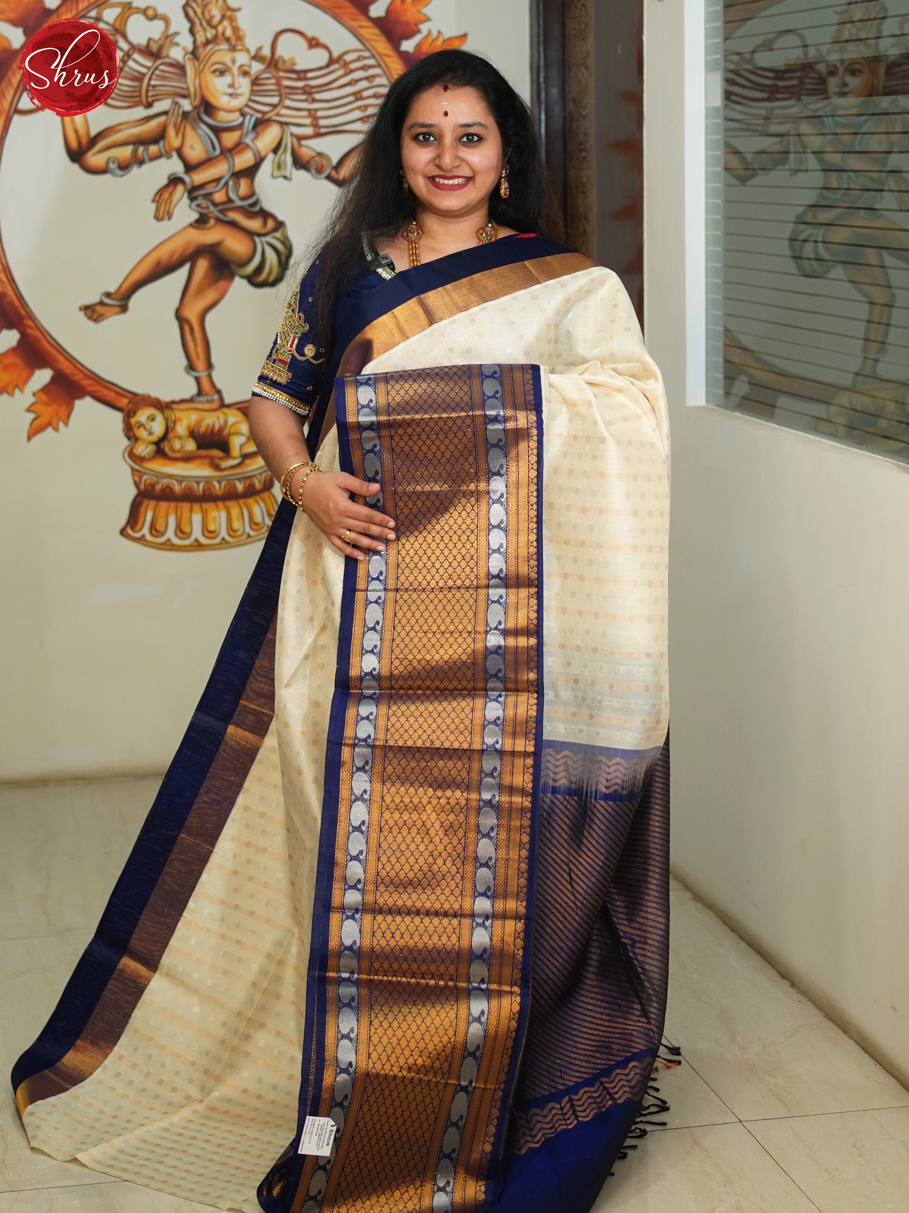 cream and Navy blue- Silk Cotton Saree