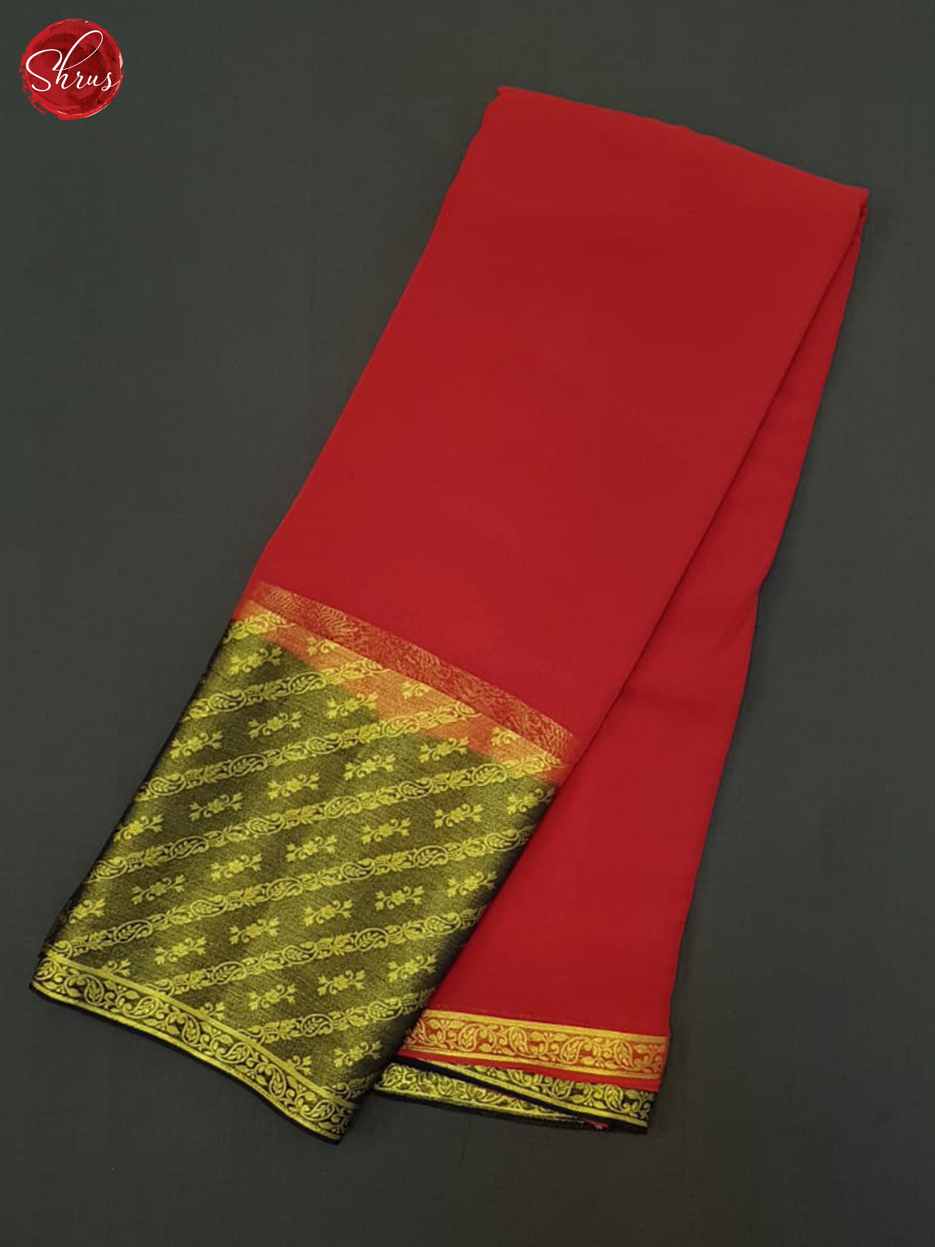 Elegant Red Semi Mysore Silk Saree, enchants with plain body . The contrast Blue zari Border with floral vines adds to the allure The rich Blue Zari striped Pallu and Plain blouse with Zari Border gives a chic twist