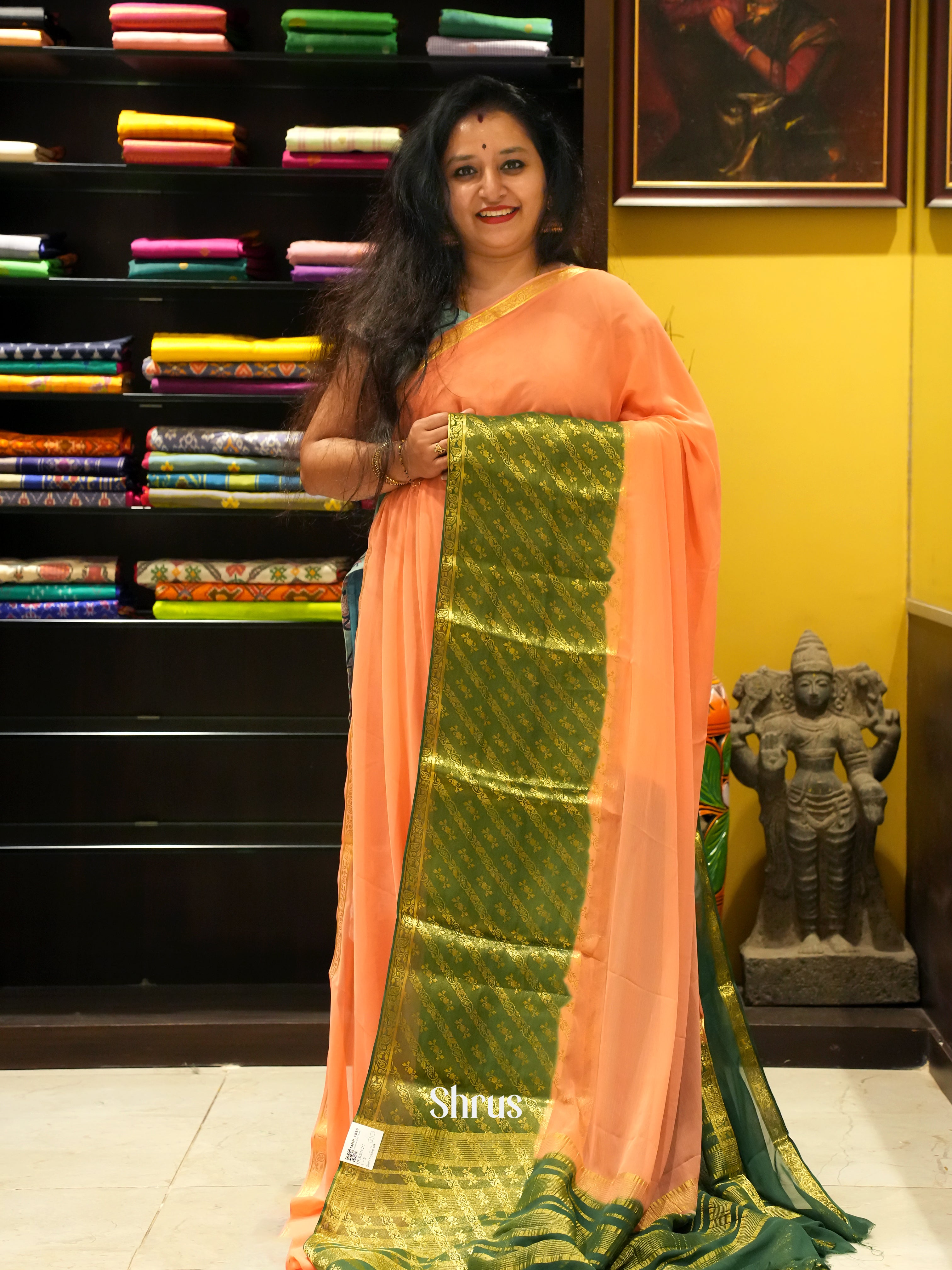 Elegant Peach Mysore Silk Saree, enchants with plain body . The contrast Green zari Border with floral vines adds to the allure The rich green Zari striped Pallu and Plain blouse with Zari Border gives a chic twist