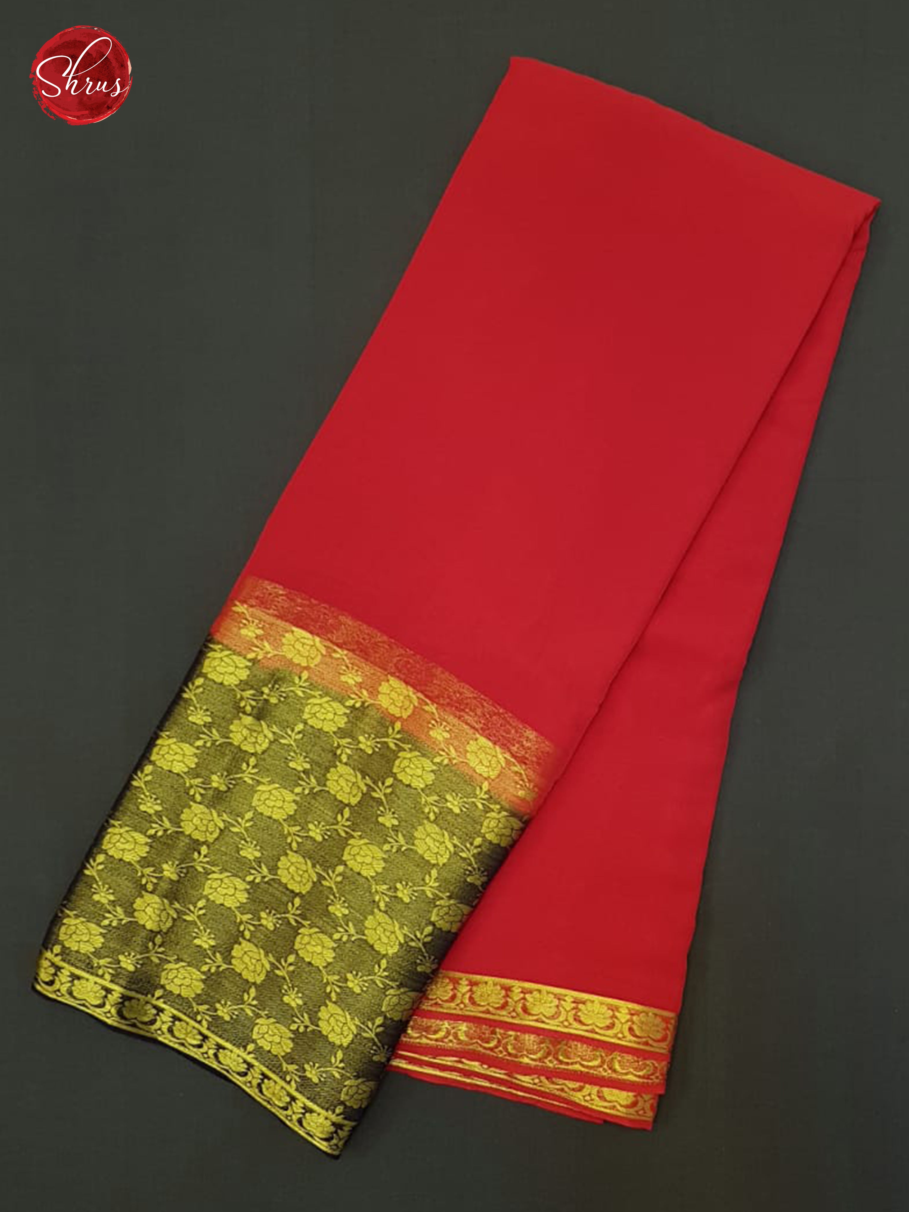 Bright Red Semi Mysore Silk Saree, enchants with plain body . The contrast Blue zari Border with floral vines adds to the allure The rich Blue Zari striped Pallu and Plain blouse with Zari Border gives a chic twist