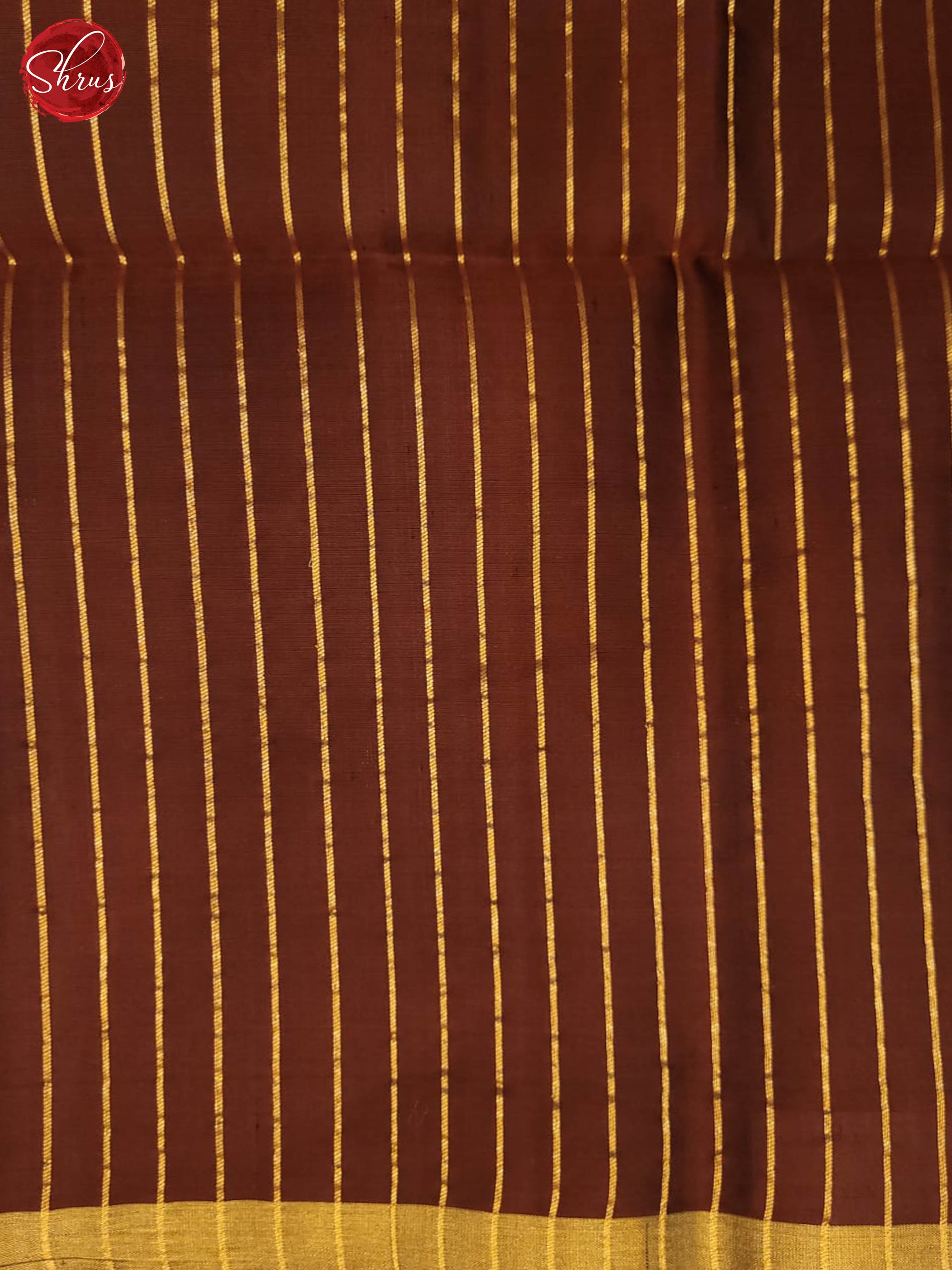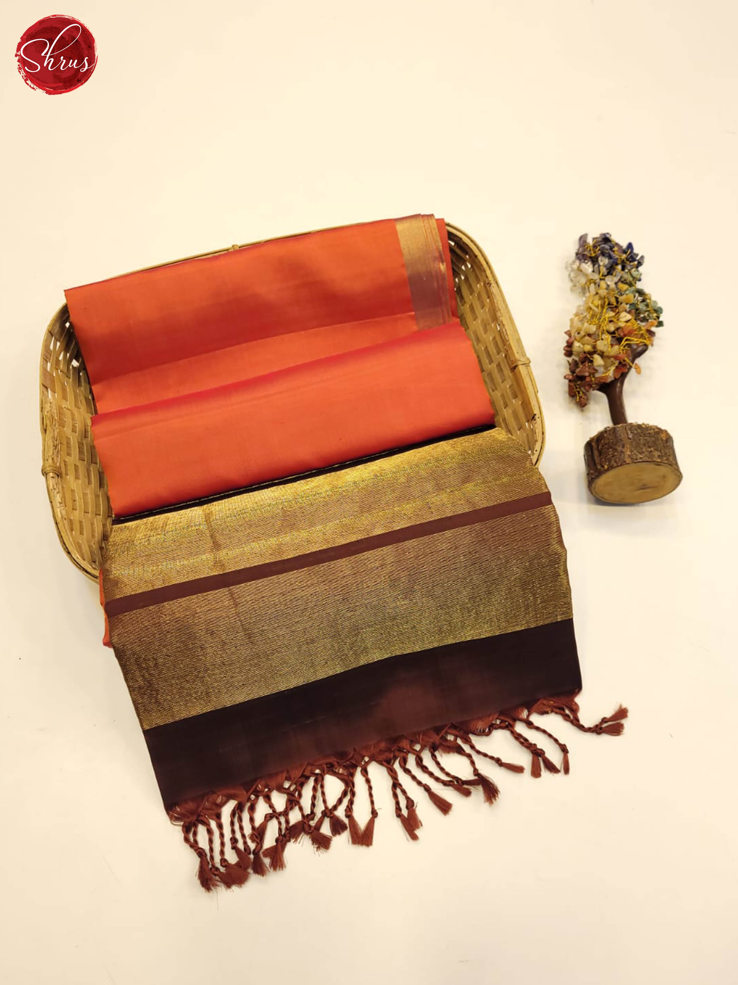 Elegant Orange Soft Silk half-pure Saree enchants with plain body . The delightful weave is beautifully complemented with a Brown zari woven pallu . The contrast zari striped brown Blouse is a perfect finish.