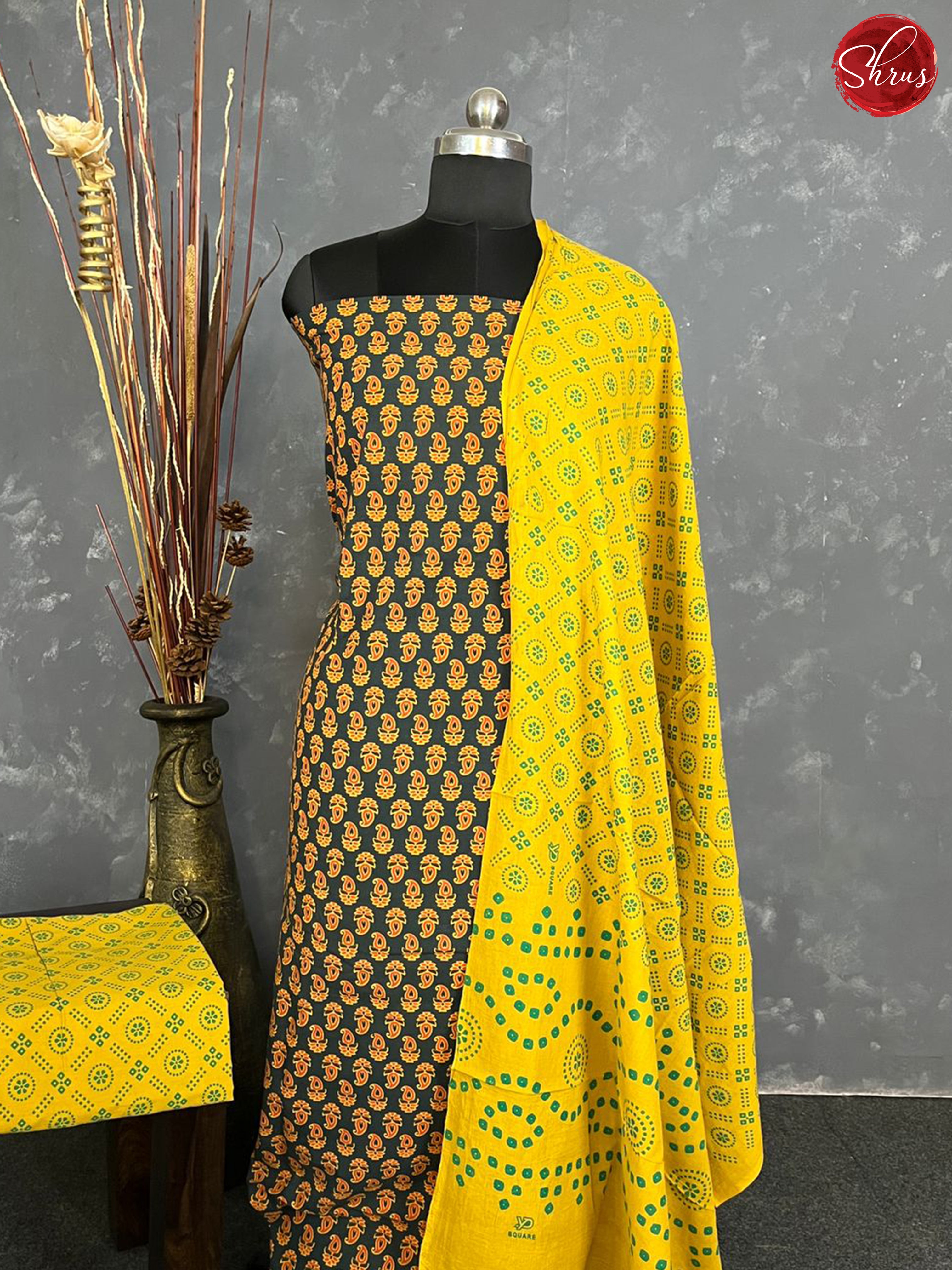 Pretty Green Ajrakh Salwar Unstitched Suit with floral block print work on the Top . Paired with lovely contrast Mustard printed bottom & dupatta completes the ensemble