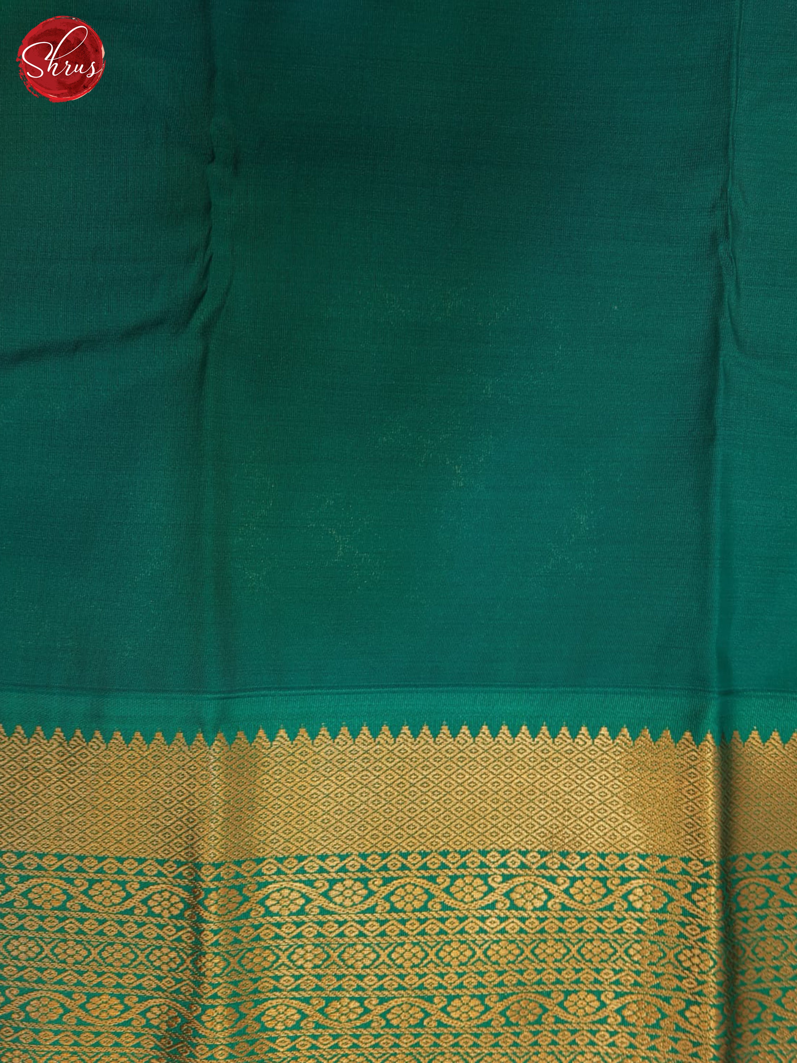 Elegant Peach Semi Kanchipuram Silk Saree gleams with gold Zari floral buttas on the body . The contrast Green Zari woven border & Pallu lends a gorgeous complement. The Green blouse with zari border completes this ensemble