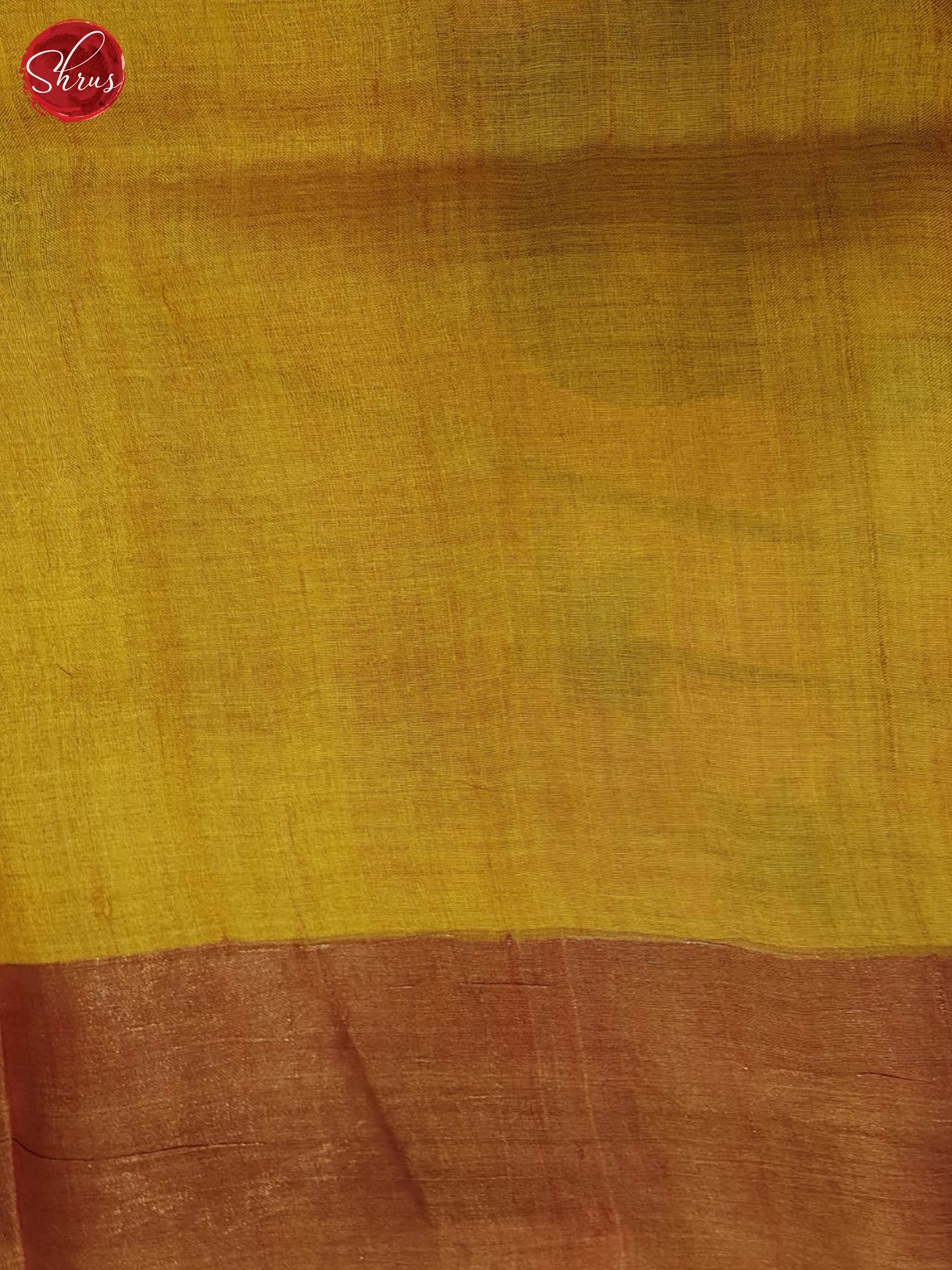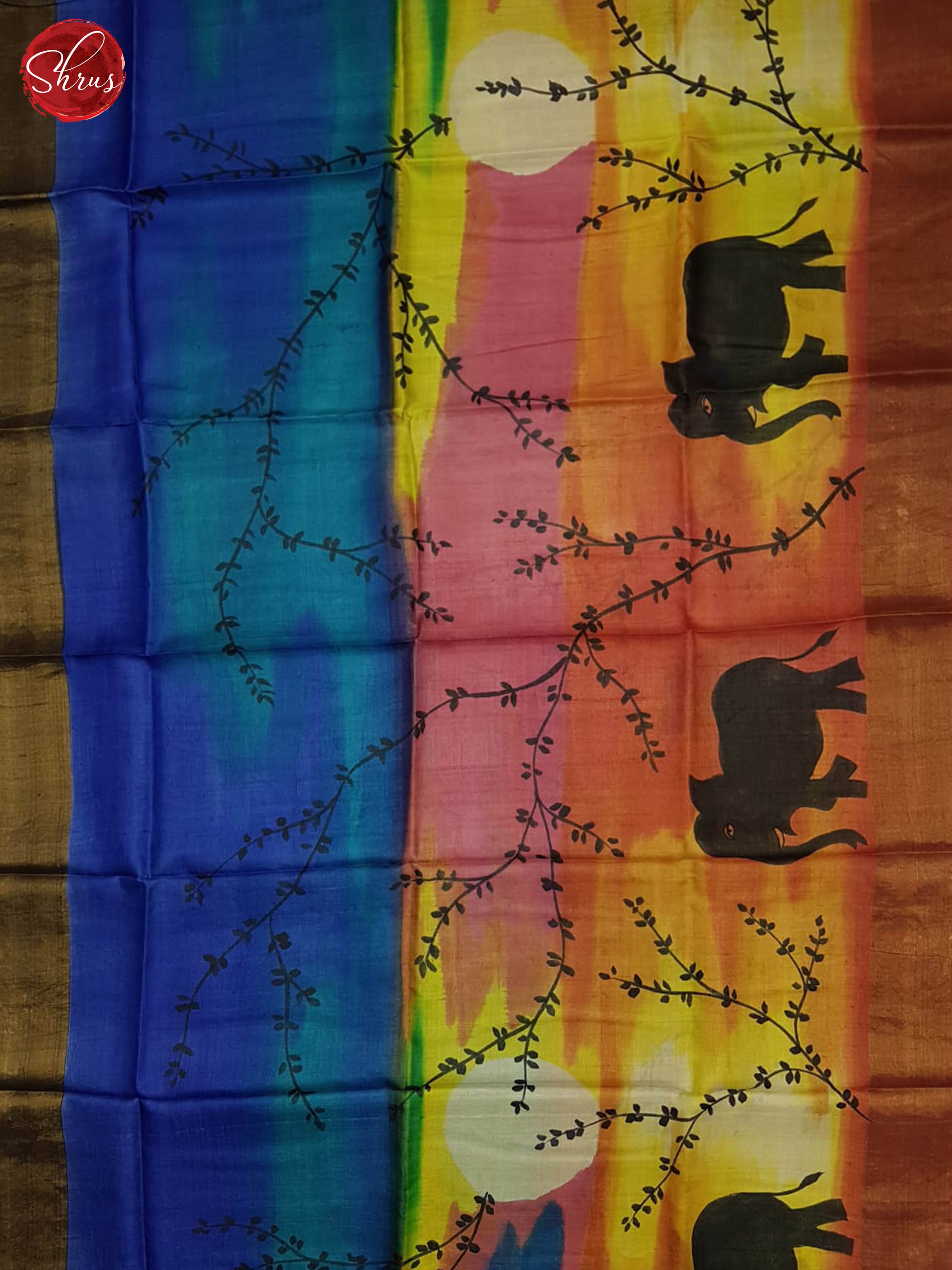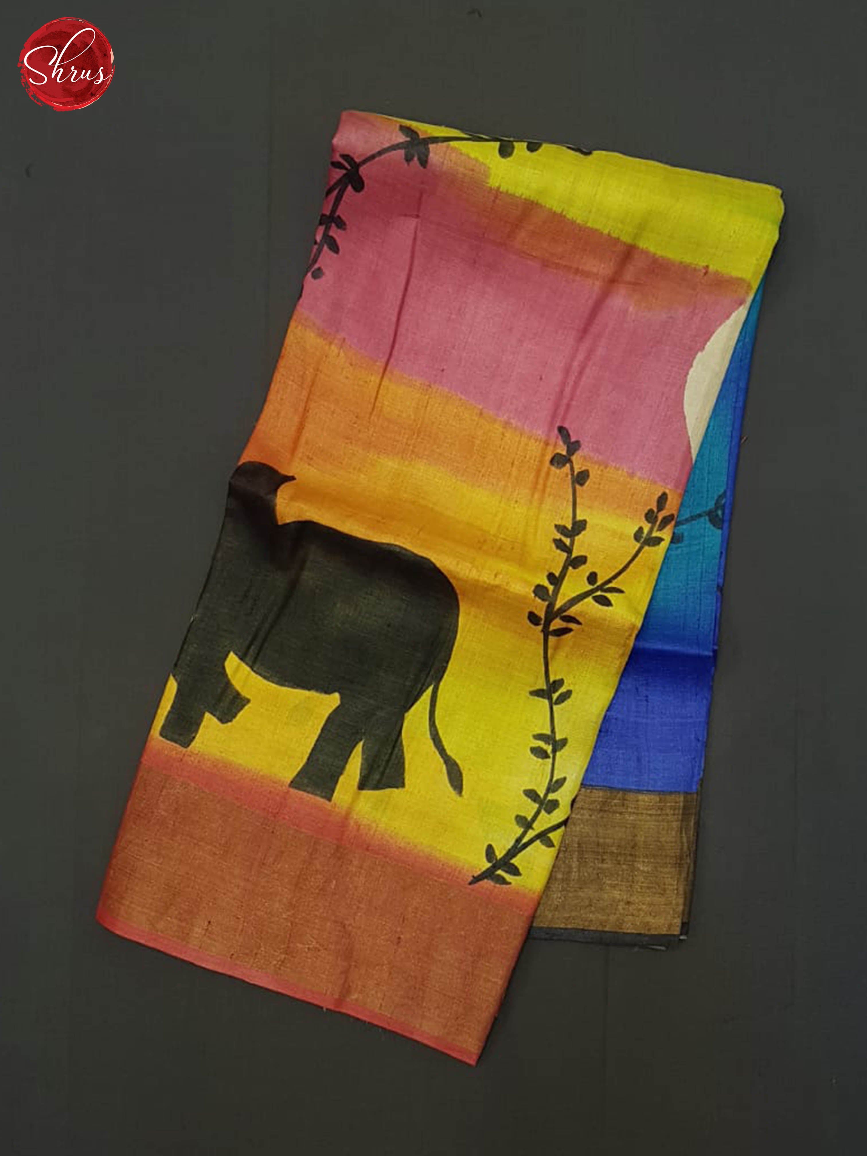 Elegant Yellow & Blue Tussar silk Saree enchants with elephant art print on the body . The contrast Pink zari woven border and the Pink pallu with stripes accentuate the timeless enamor. The plain Yellow blouse with zari border completes this ensemble.