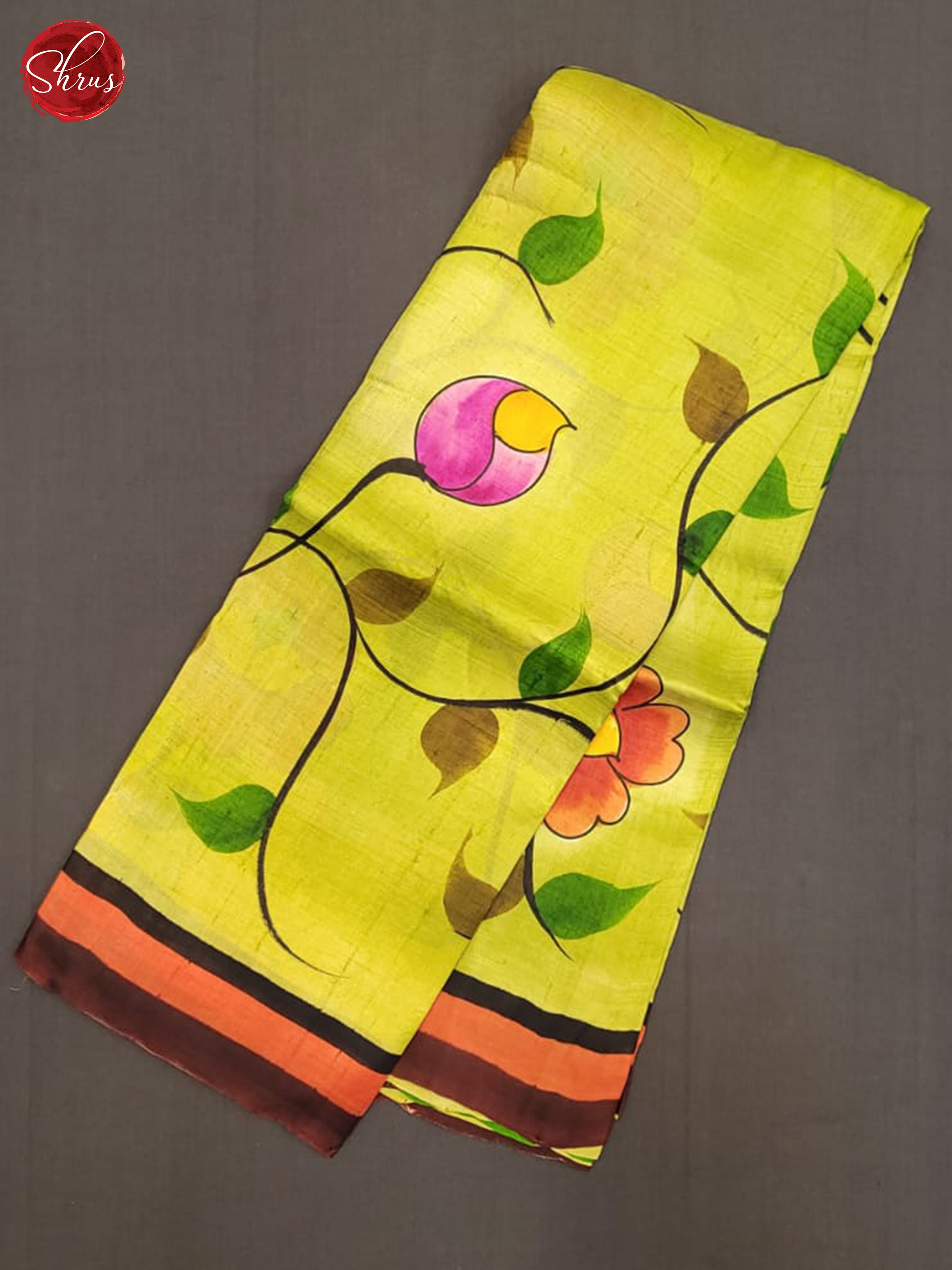 Very pretty Lime Green Murshidabad Silk Saree with hand painted floral Design & floral hand painted pallu impress a lot. The saree is teamed up with plain Green blouse with border gives a perfect fit.