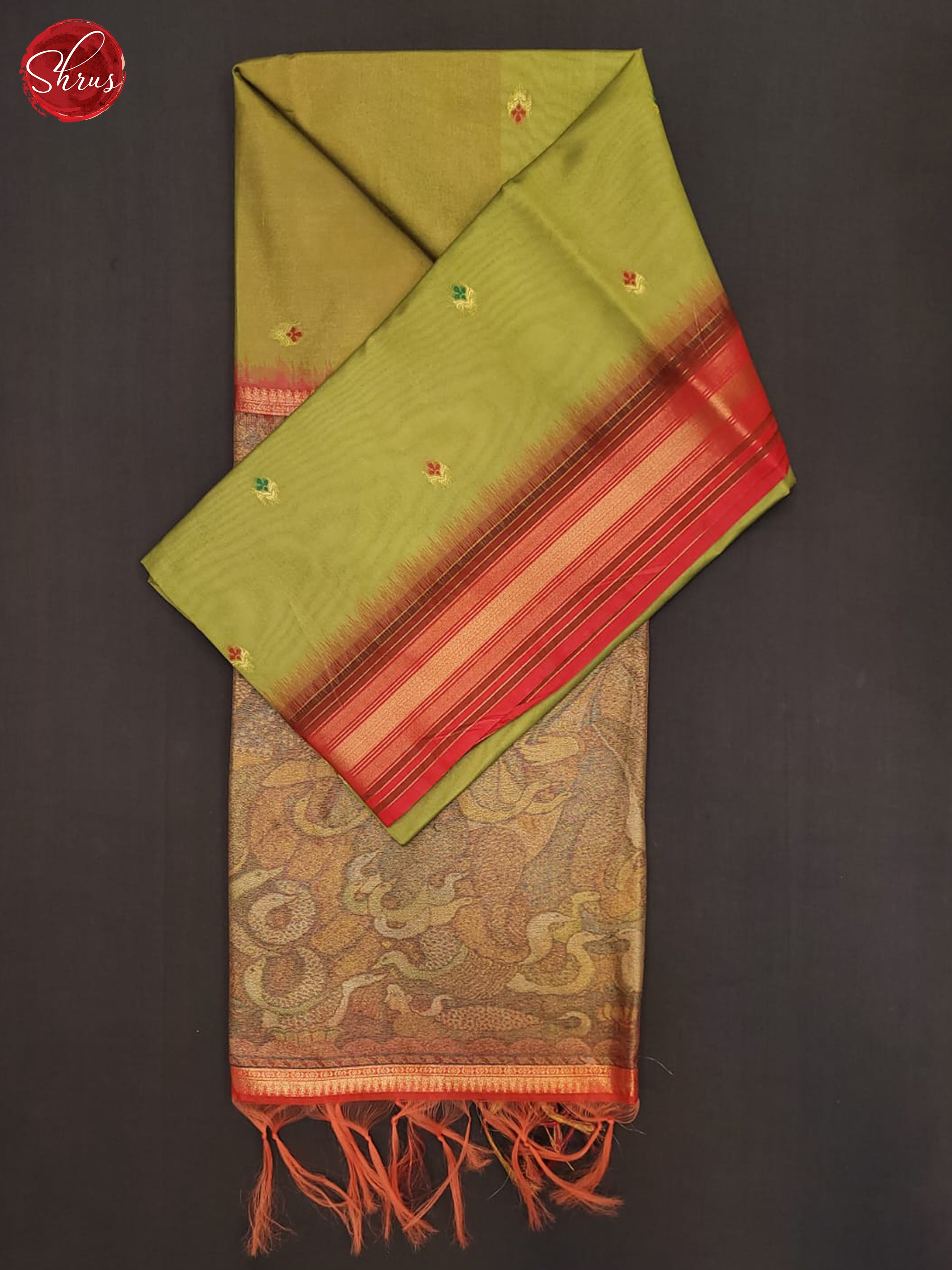Pretty Green Semi Tussar saree enchants with floral buttas on the body & bounded with contrast Red border .The beautiful grey printed Pallu & plain Red blouse with border Completes the ensemble