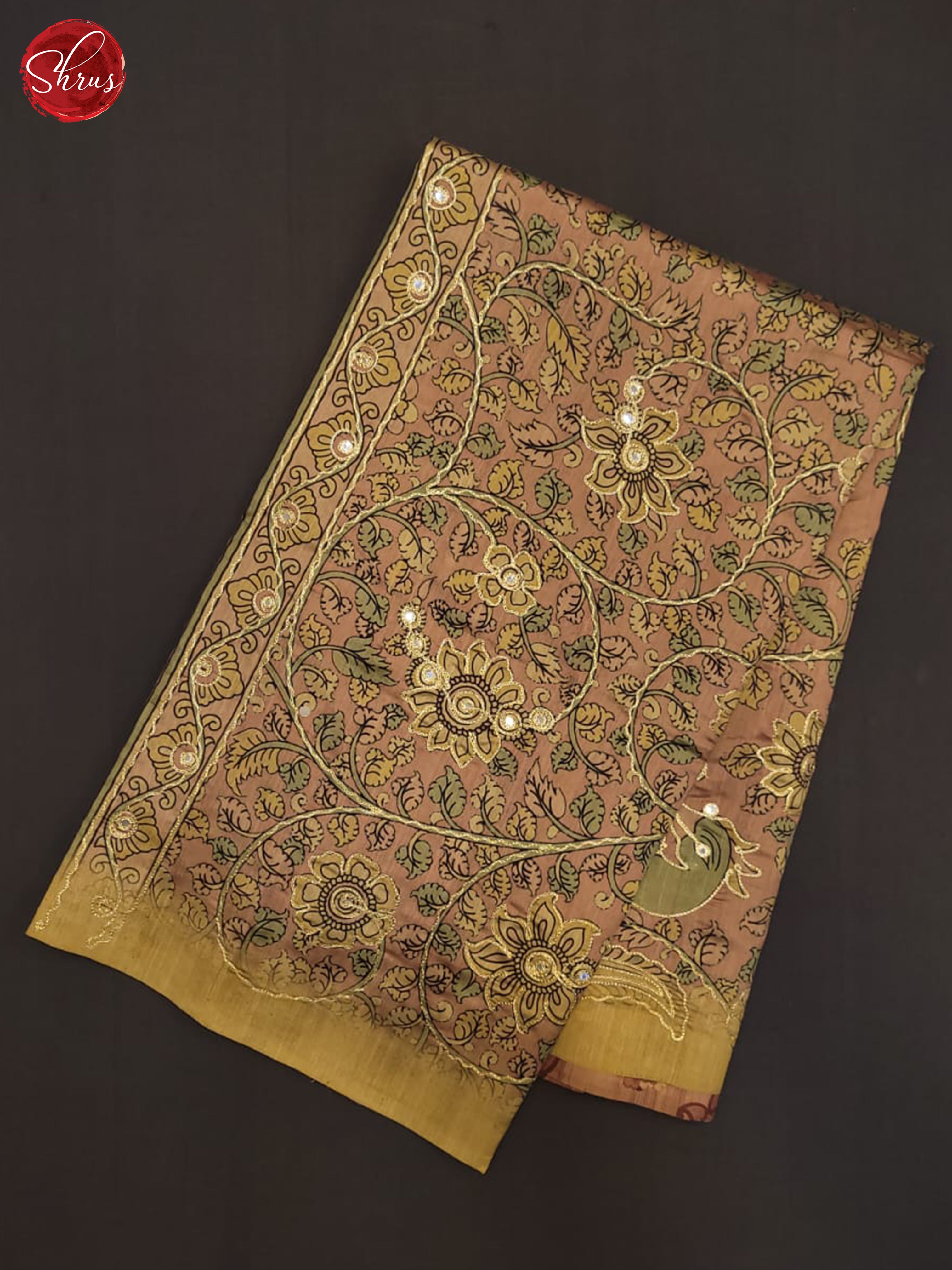Pretty Onion Pink Semi Tussar saree with mirror work on the body & bounded with contrast elachi green printed border .The contrast Kalamkari printed Pallu & comes with printed self blouse Completes the ensemble