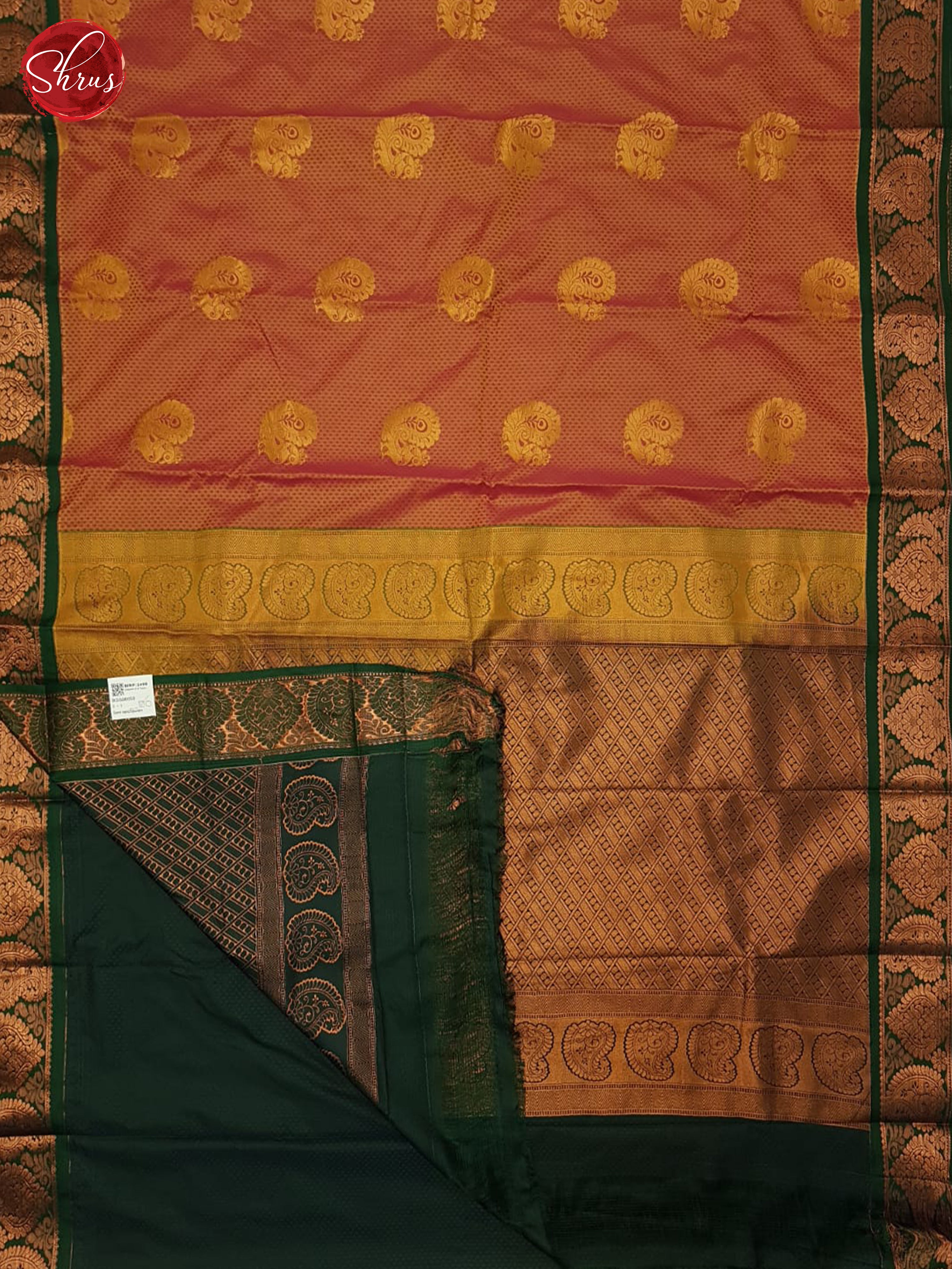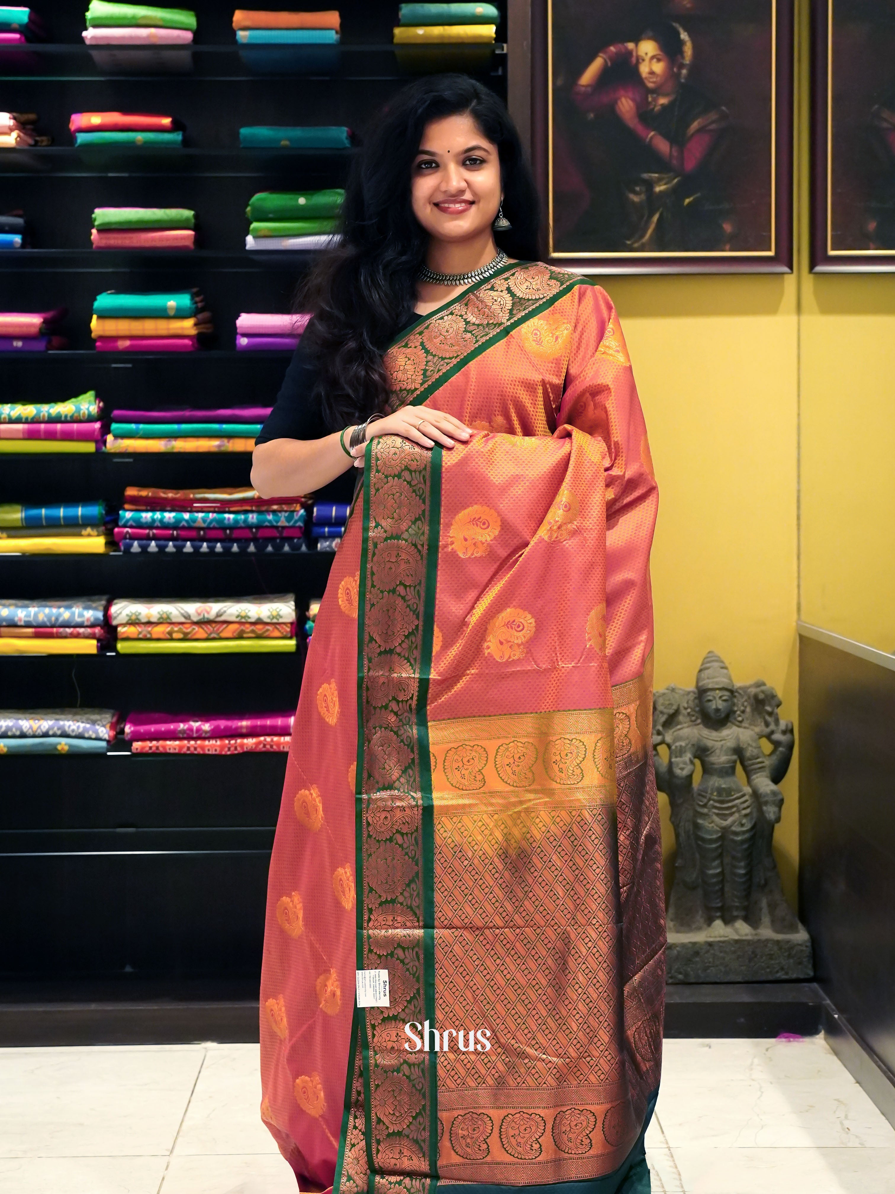 Pretty Orange Semi Kanchipuram Silk Saree gleams with gold Zari Peacock motifs on the body . The contrast Green Zari woven border & Pallu lends a gorgeous complement. The plain Green blouse with zari border completes this ensemble