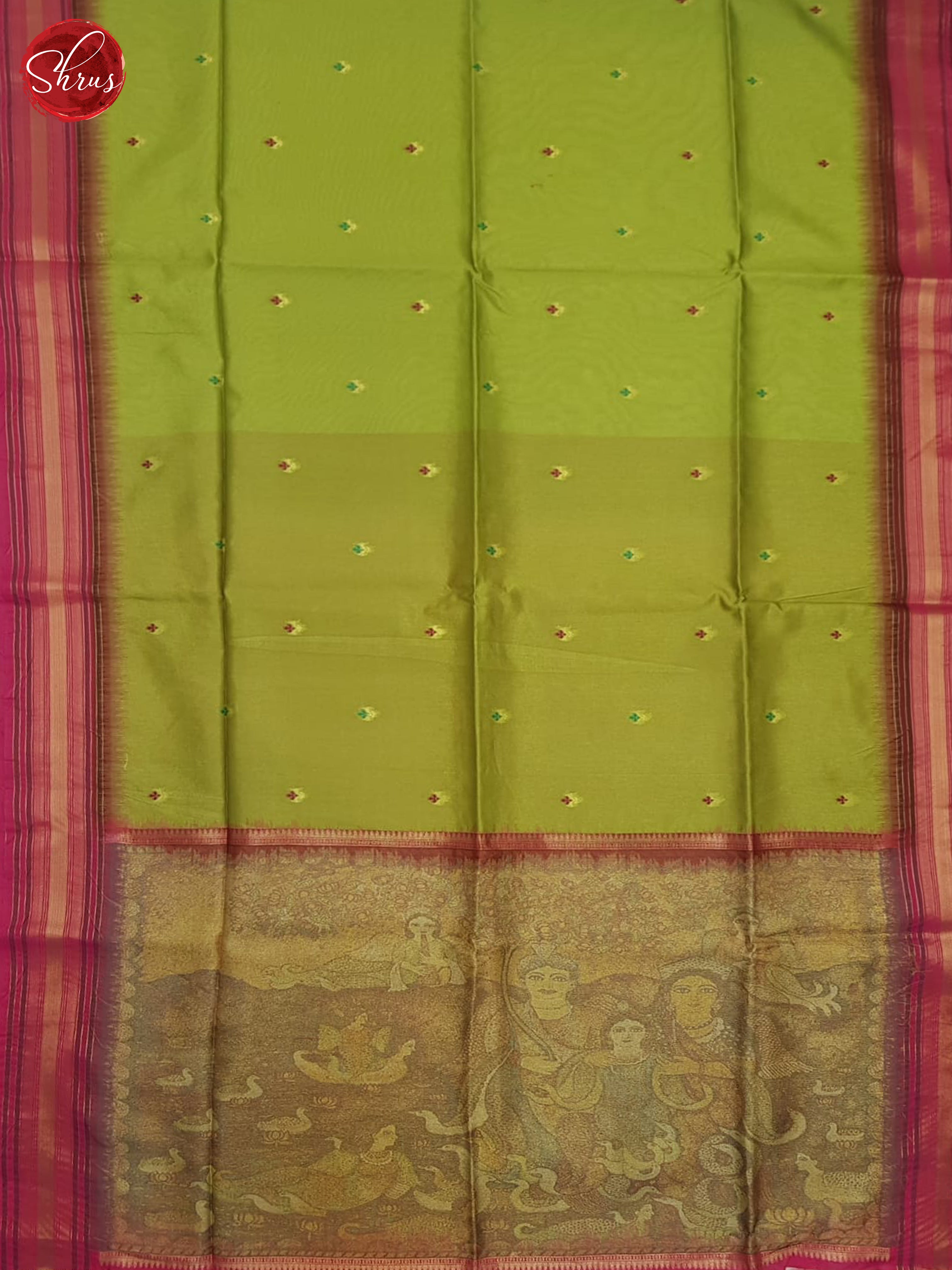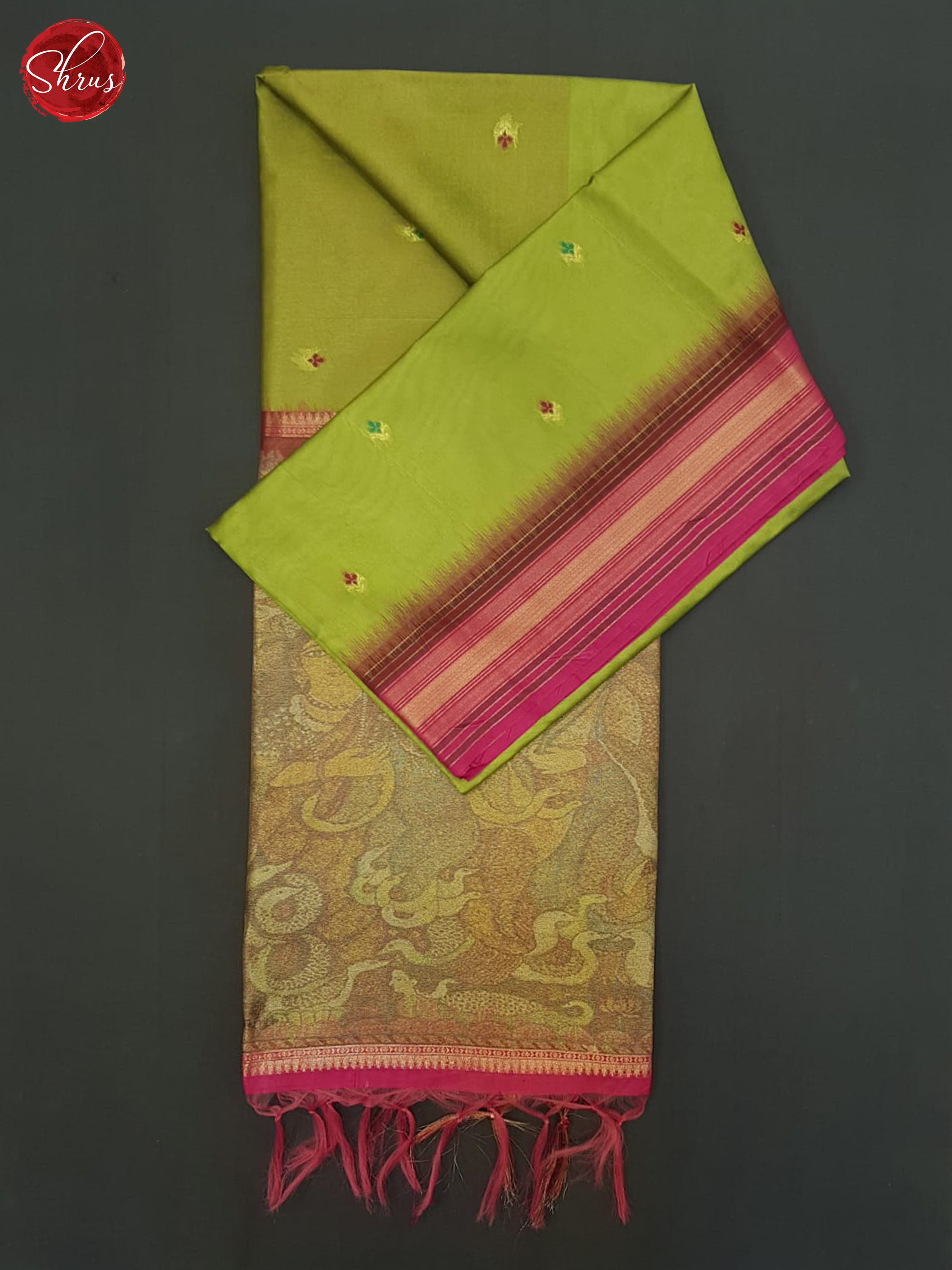Pretty Green Semi Tussar saree enchants with floral buttas on the body & bounded with Pink zari woven border & printed Pallu & comes with Plain Pink blouse with border completes the ensemble