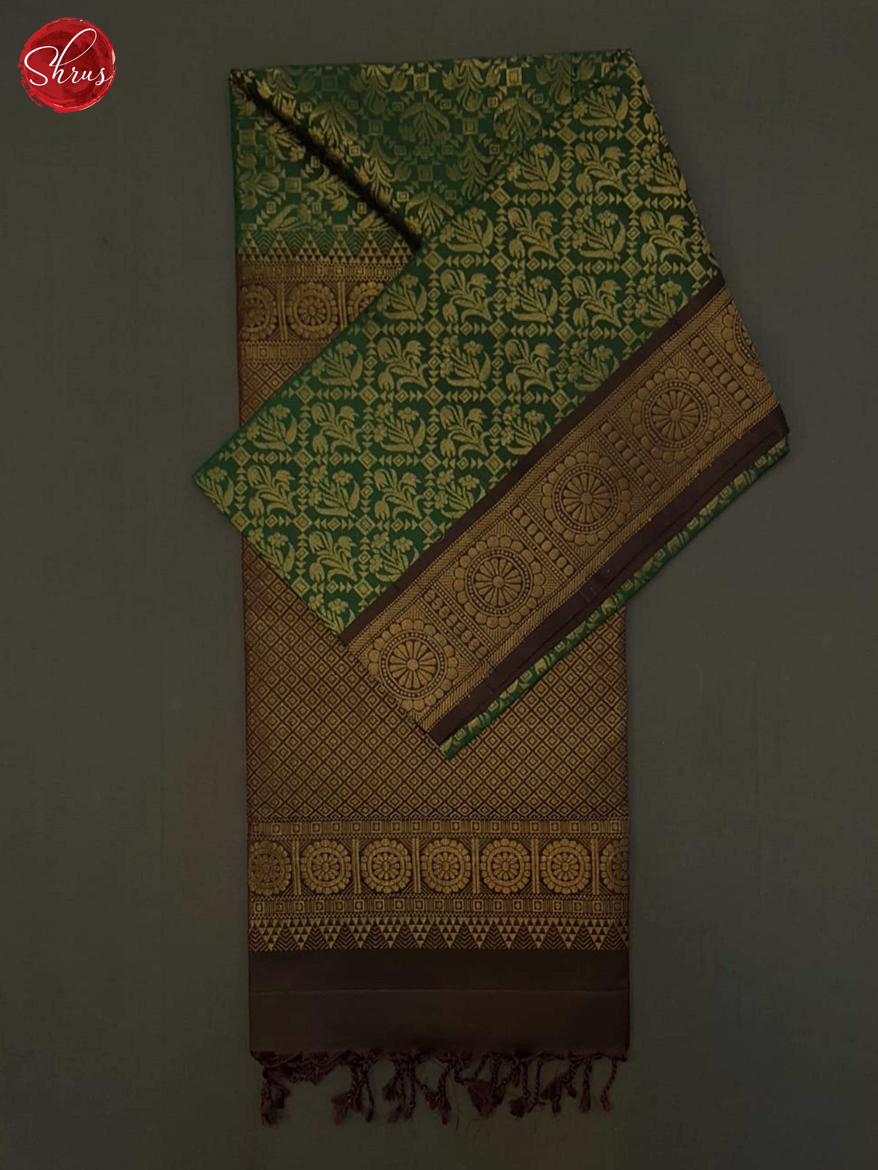 Very Pretty Green Silk (Half Pure) Saree enchants with zari woven floral nestling brocade on the body & Bounded with Brown border gives a classy look .The Splendid Brown pallu with zari woven floral brocade & Plain Brown blouse lends compliments