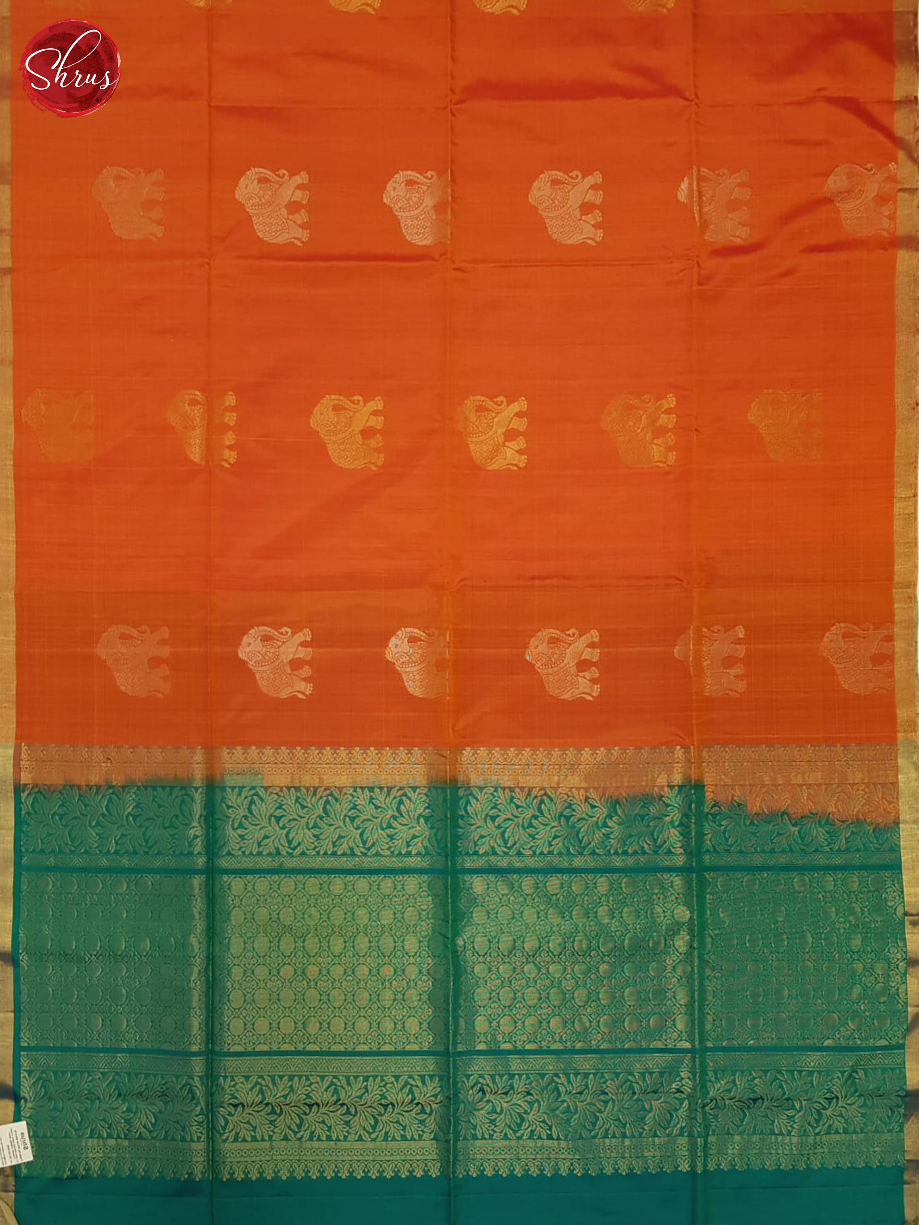 Radiant Orange Silk Cotton Saree enchants with gold zari woven elephant motifs on the Body . The delightful weave is beautifully complemented with a thin zari woven border & contrast Green Pallu with brocade . The Plain Greenk Blouse is a perfect finish