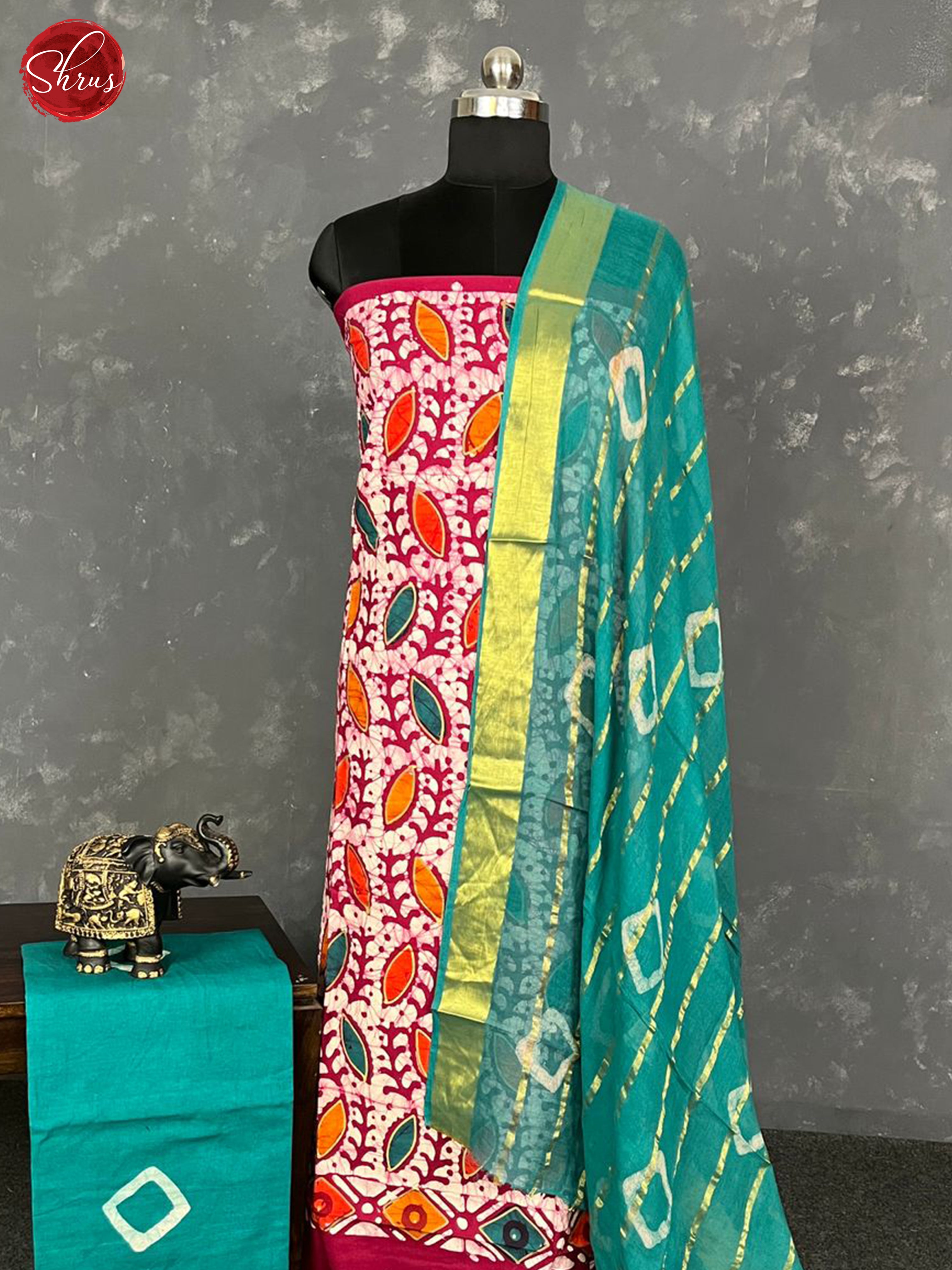 Pretty Maroon Bhatik unstitched Salwar Suit with floral pattern on the top .Paired with lovely bhatik pattern contrast Green bottom & dupatta completes the ensemble