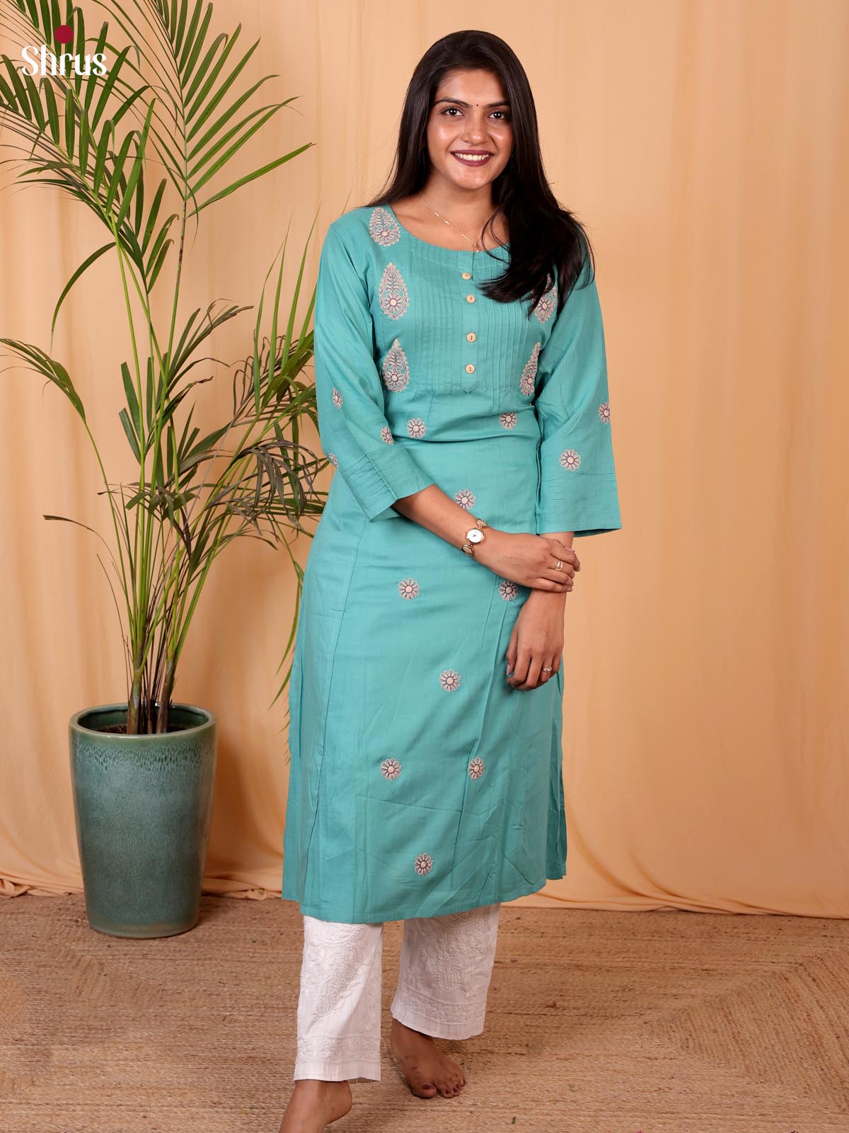 Charming Green floral embroidery straight fit Readymade kurti features with round neck & three-quarter sleeves. this elegant style is perfect for casual outings.