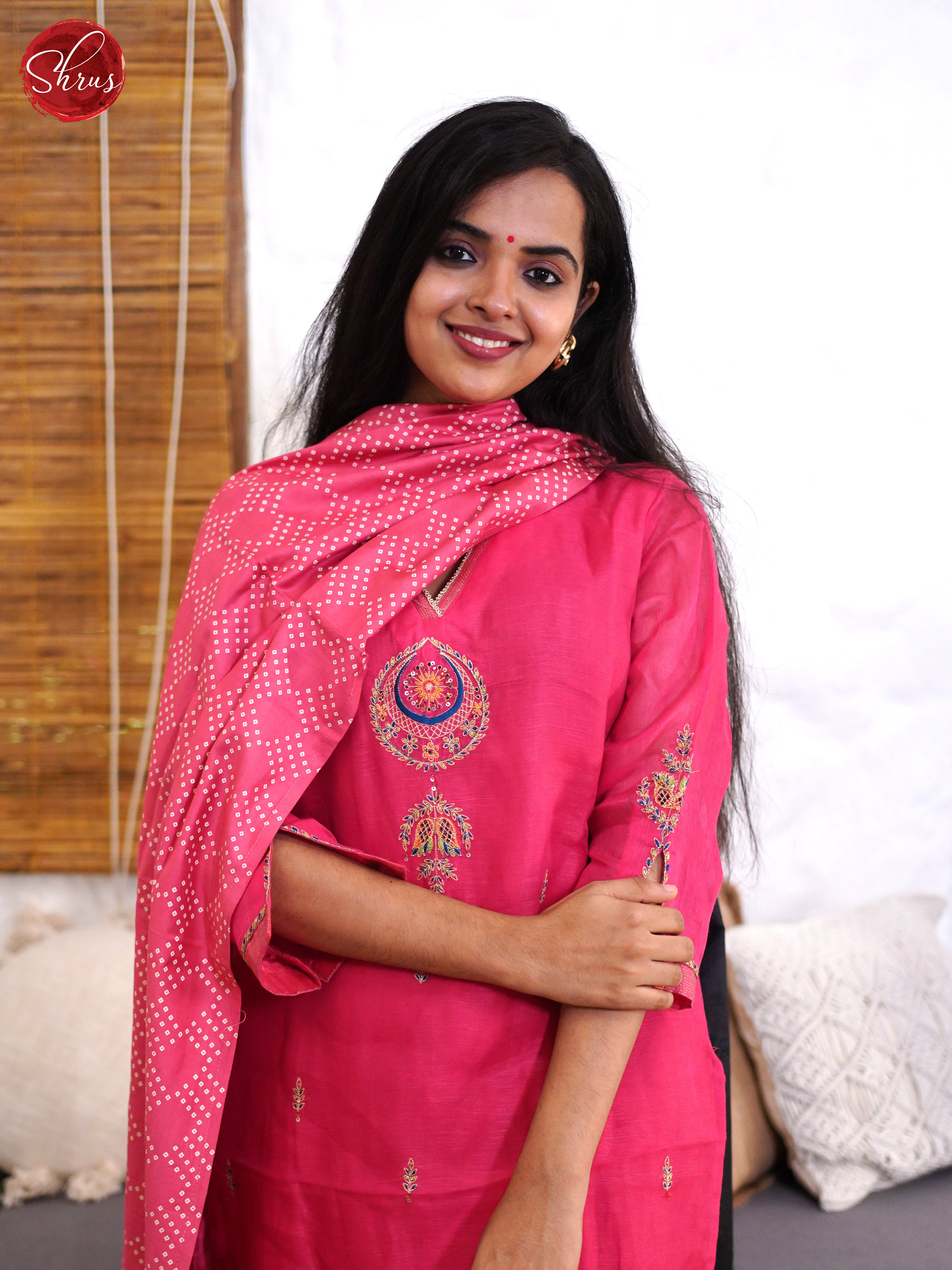 Pretty Red Tussar 3- piece V-neck Readymade Salwar Suits with embroidery work in the neck , bottom & bandhini & ajrak printed dupatta that evokes a sense of enthusiasm. . Wearable and chic, this dress is right on trend for the season.