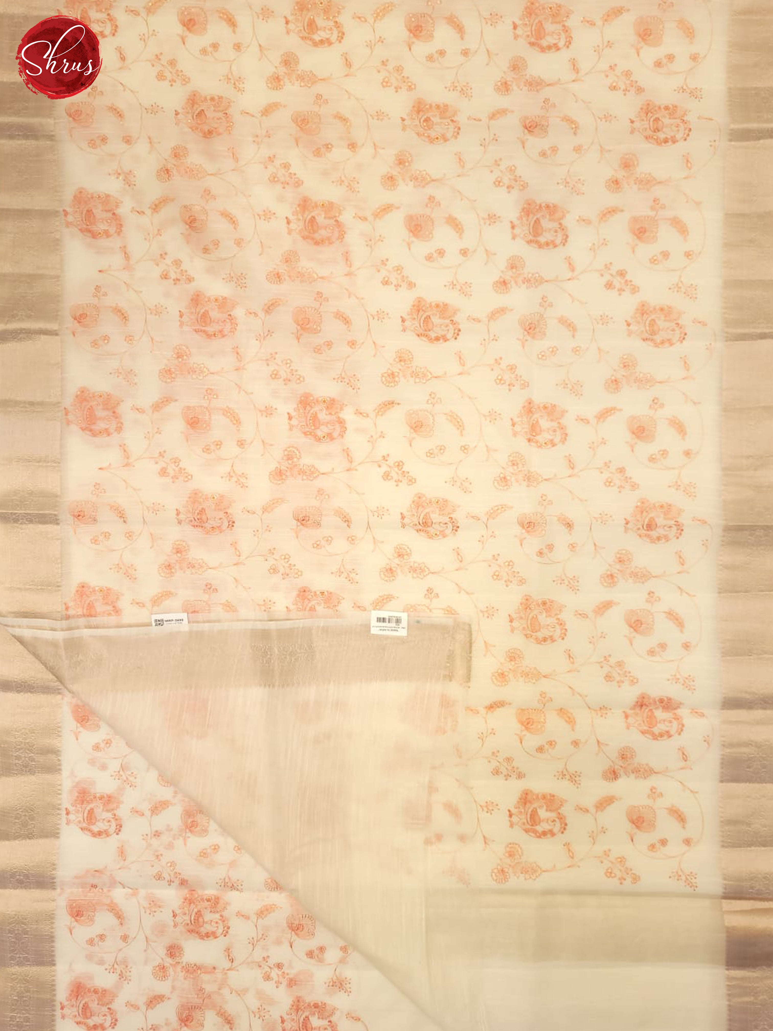 Pretty Cream & Orange semi Organza saree with floral print on the body The elegant weave is lent a mystical edge with a zari border . The self printed pallu adds to the allure. Comes with a plain Self blouse with zari border completes the ensemble