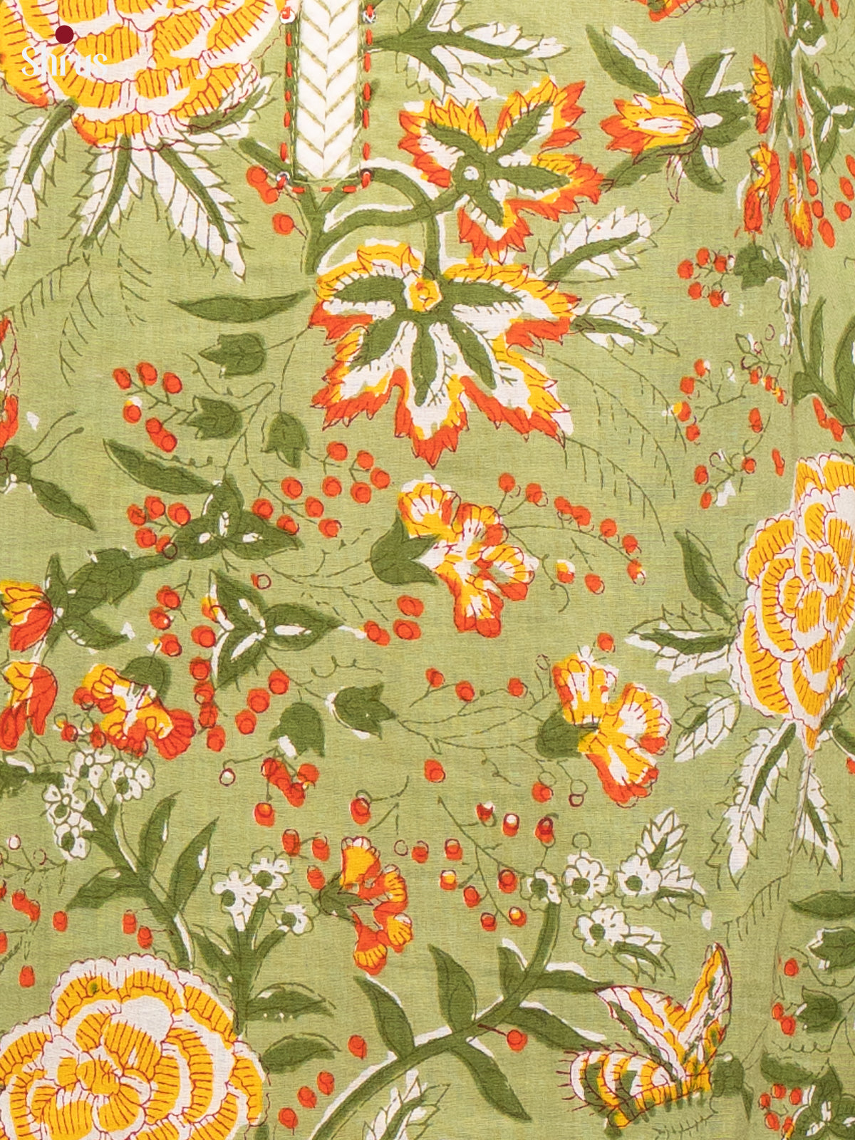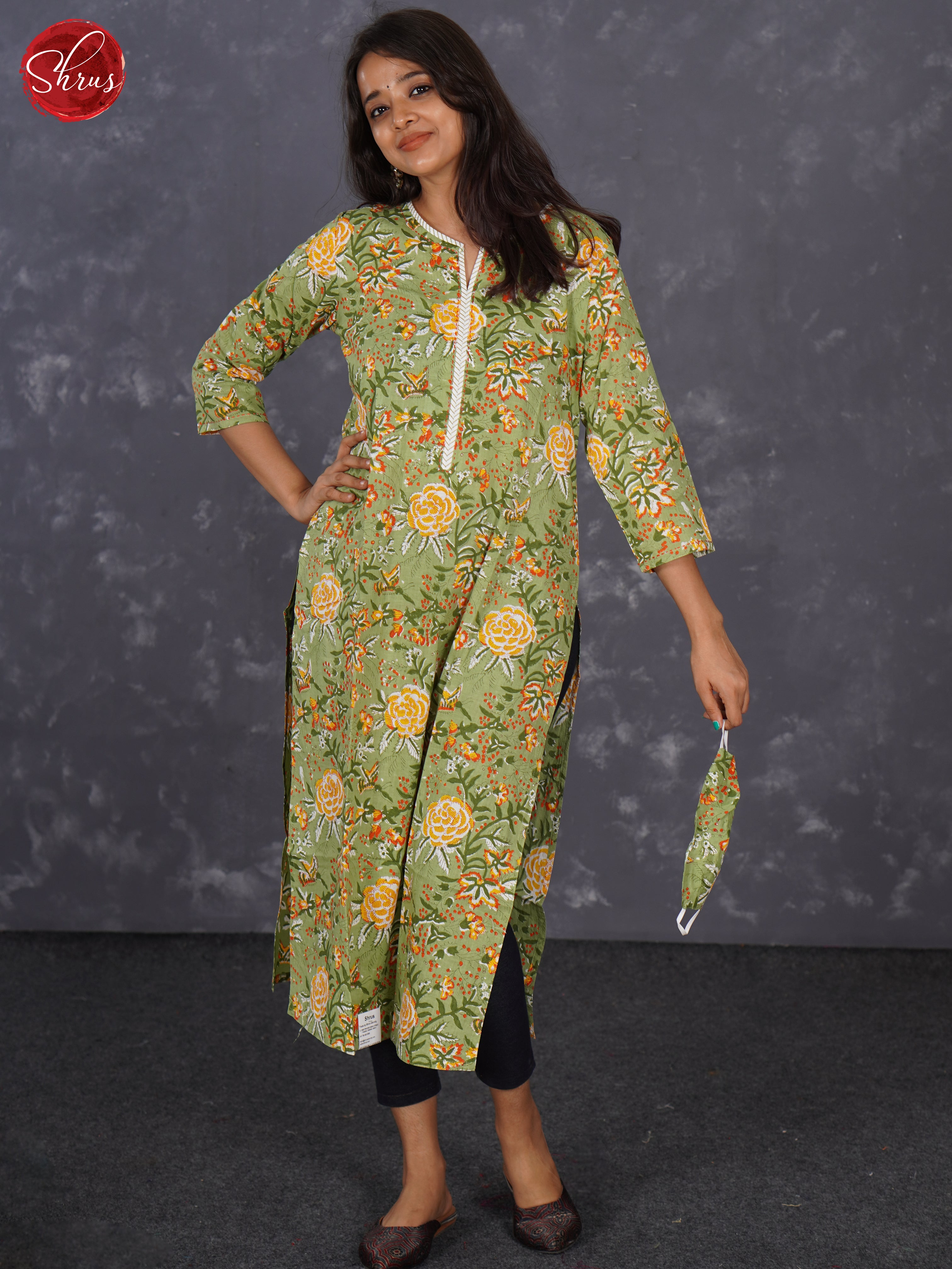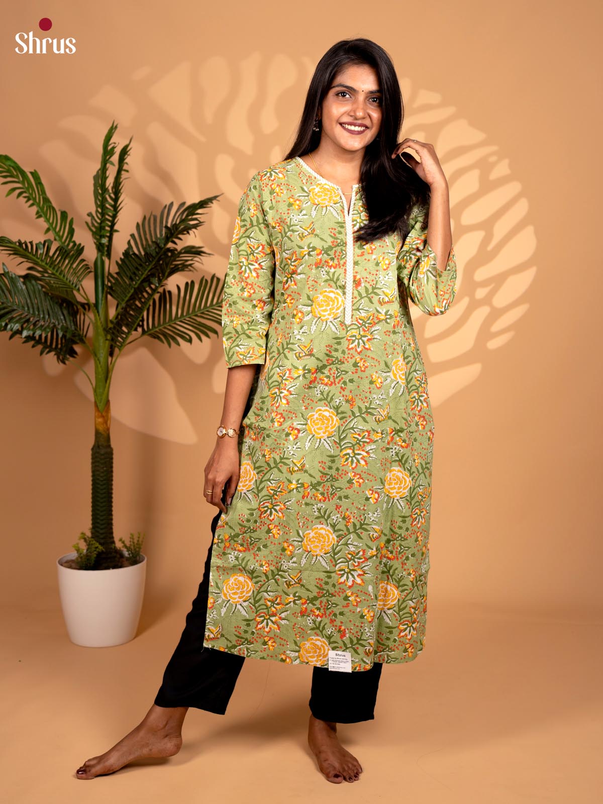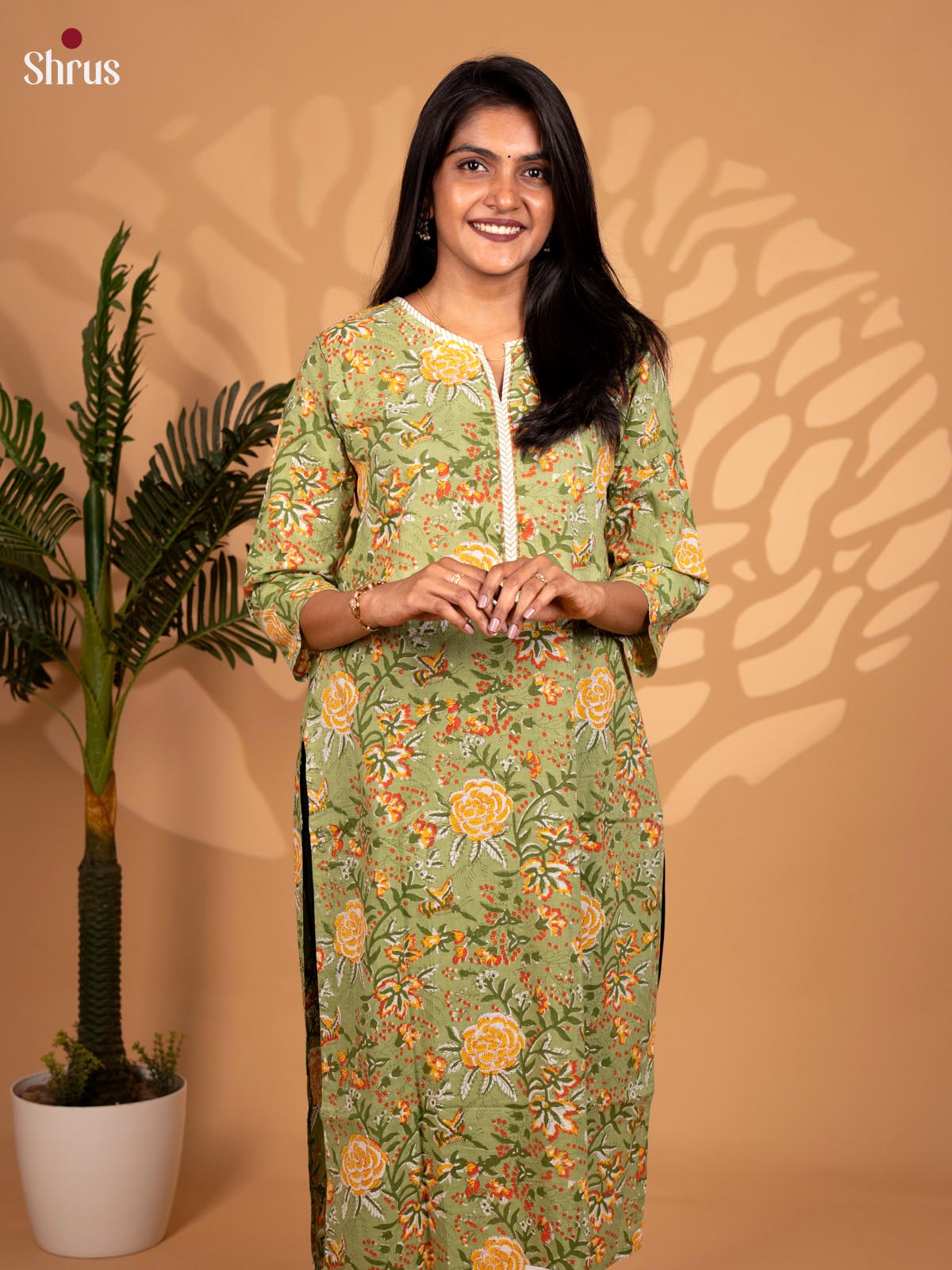 Elegant Green straight-fit Readymade kurti, features a round neckline, three-quarter sleeves, and a lace work in the neck . this elegant style is ideal for everyday wear .