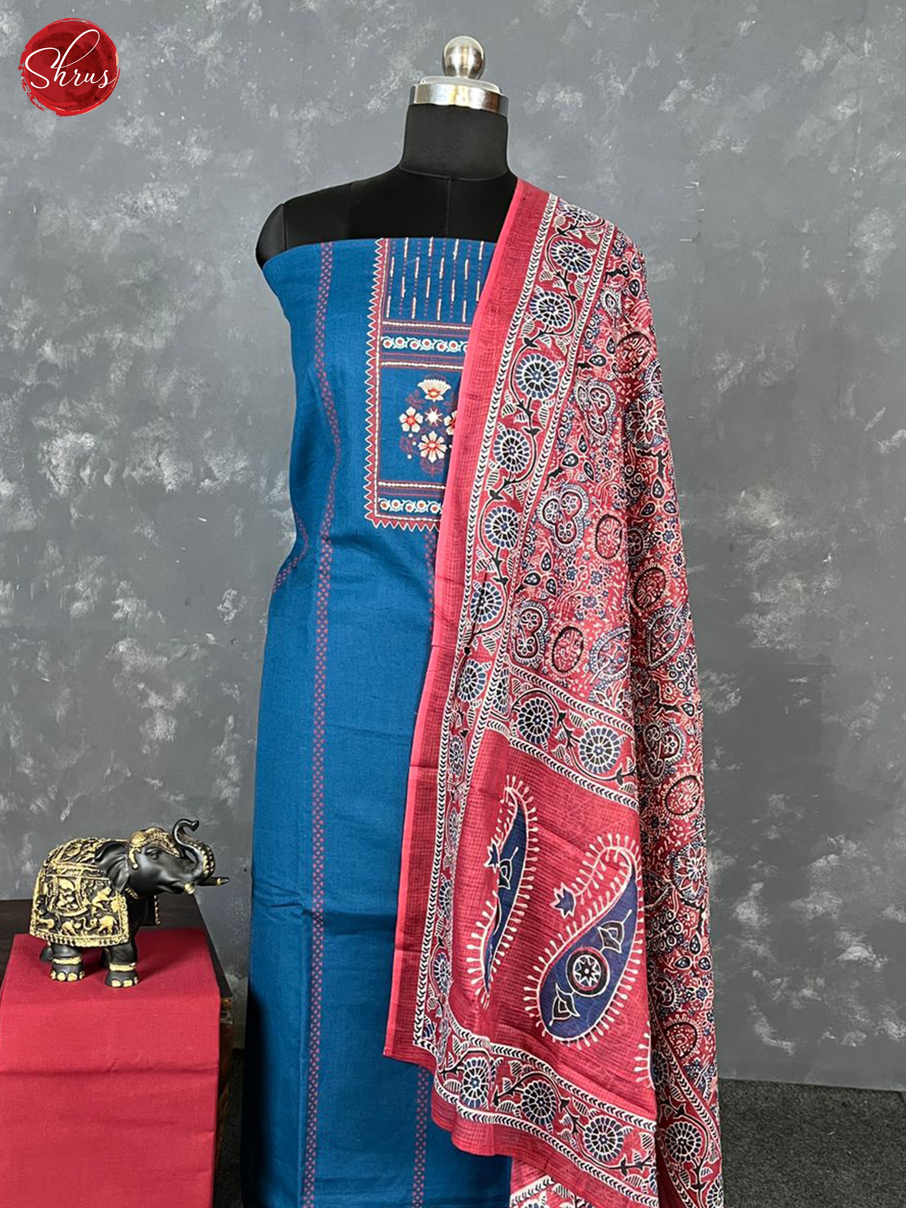 Beautiful Blue Unstitched Salwar suit with floral print neck pattern on the top . Paired with lovely Maroon bottom & printed dupatta completes the ensemble
