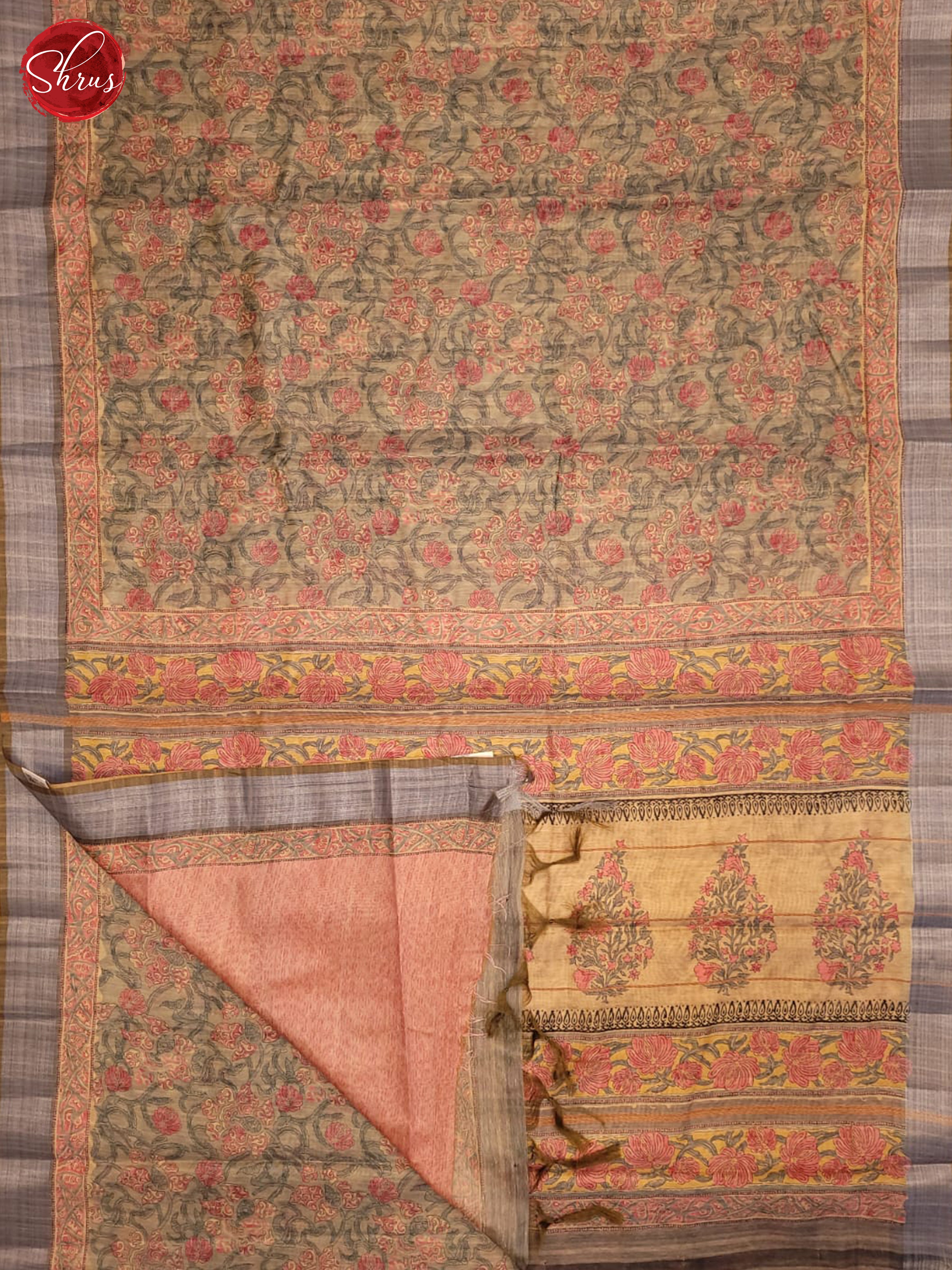 Pretty Chickoo Semi Gicha Saree enchants with floral printed body , & bounded with zari border , contrast beige printed pallu lends a beautiful compliment . Comes with pink blouse with border completes the ensemble