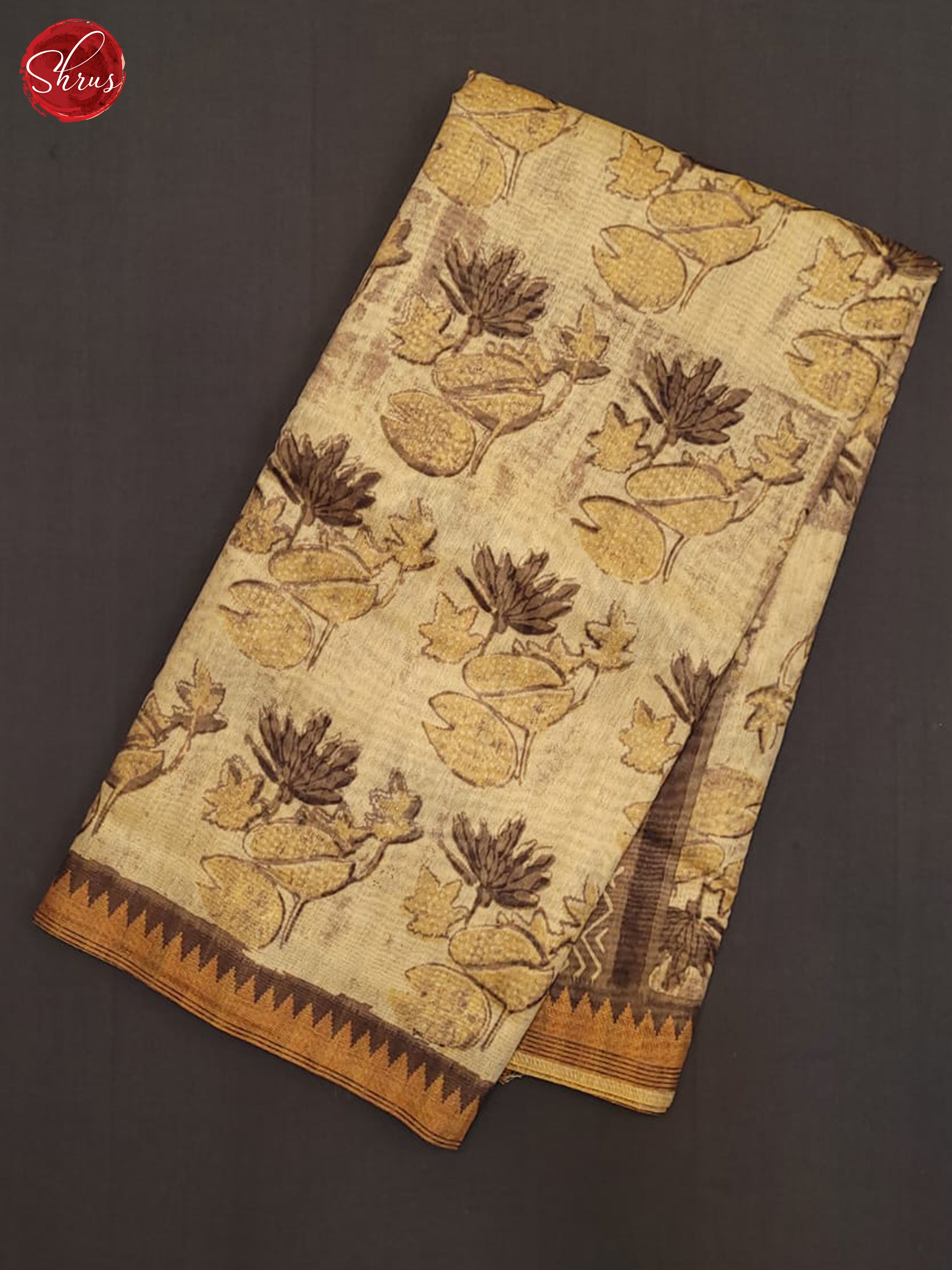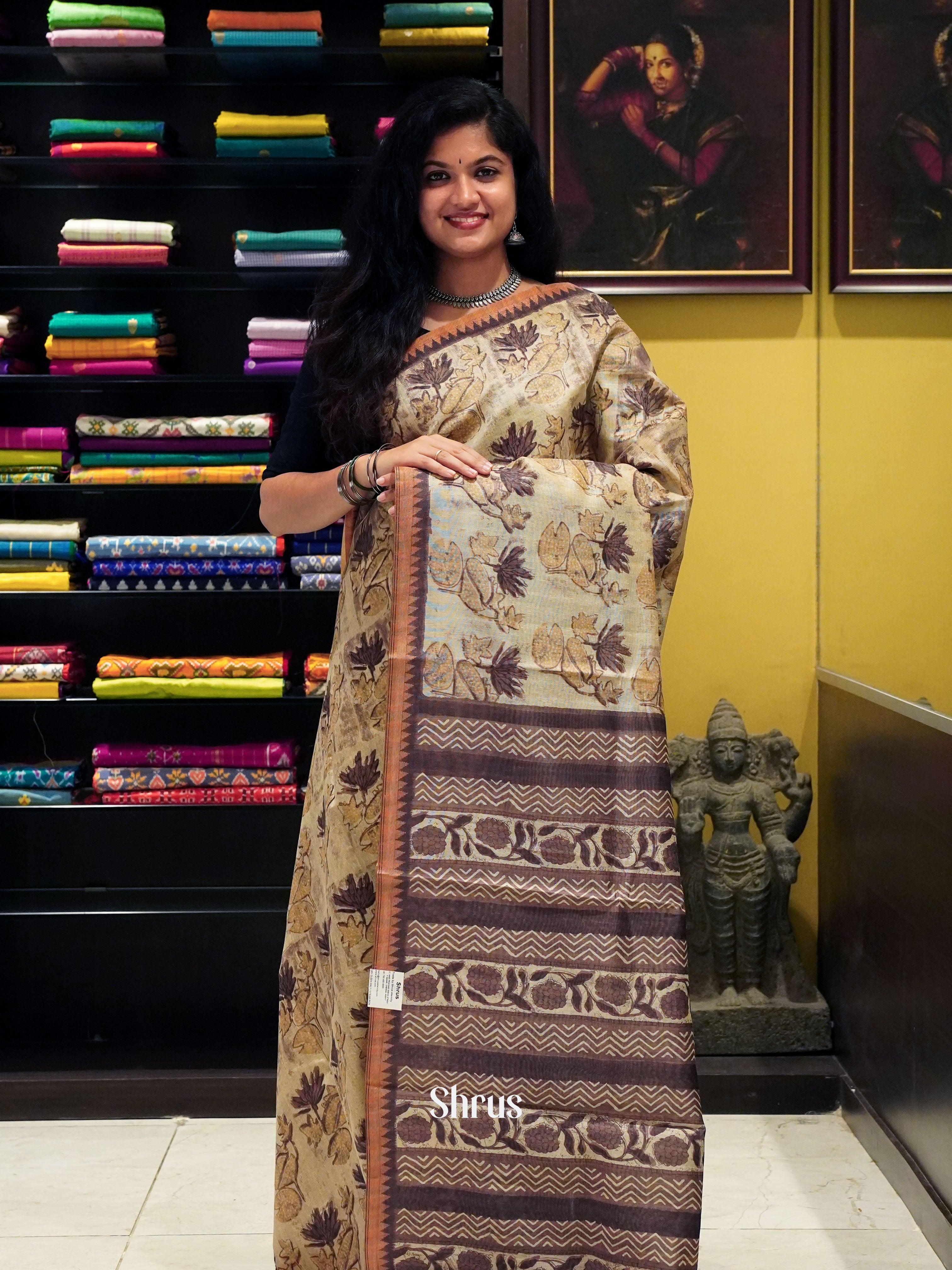 Pretty Light Brown Semi Gicha Saree enchants with floral printed body , & bounded with thin zari border , printed pallu lends a beautiful compliment . Comes with printed brown blouse completes the ensemble