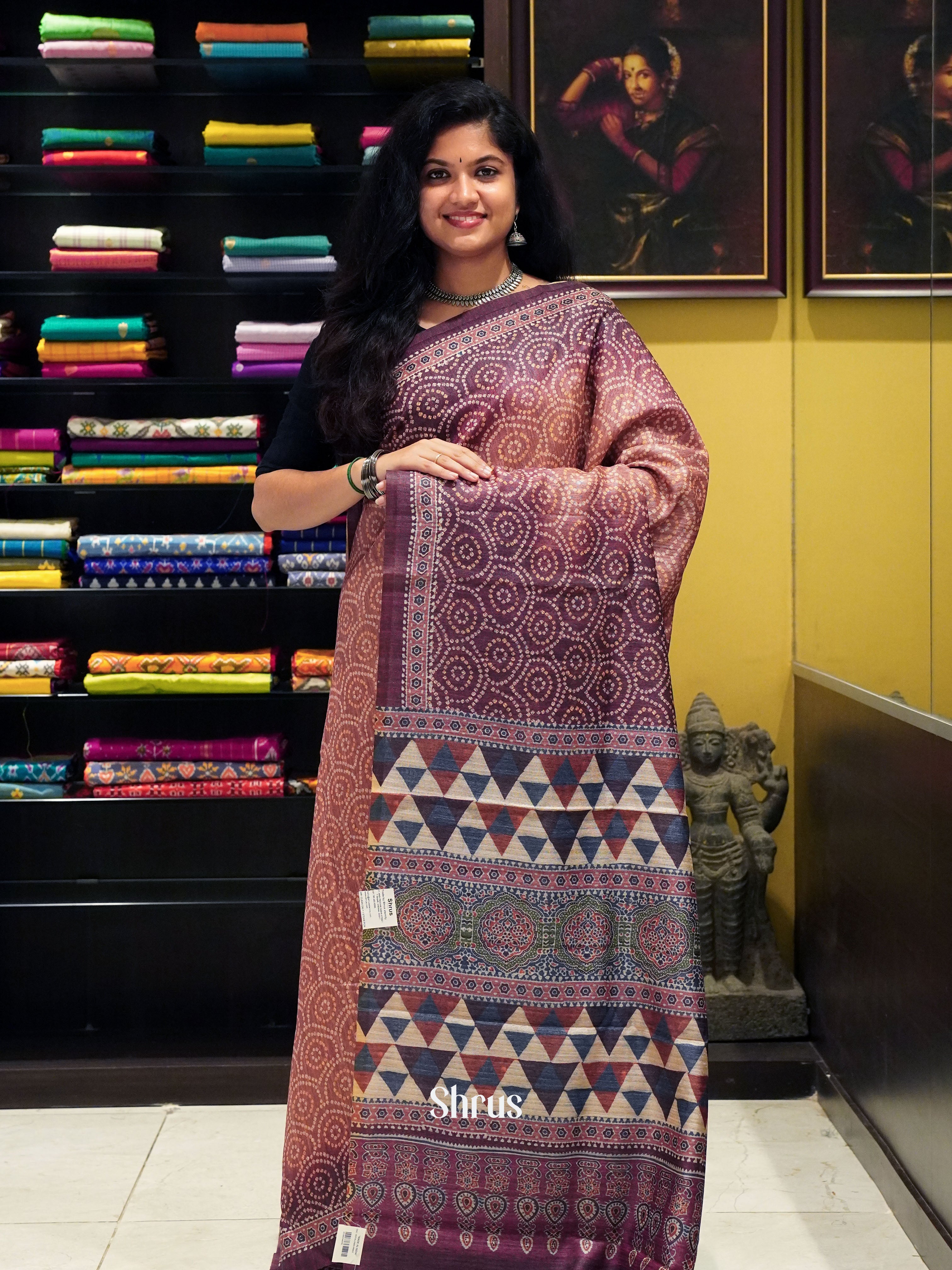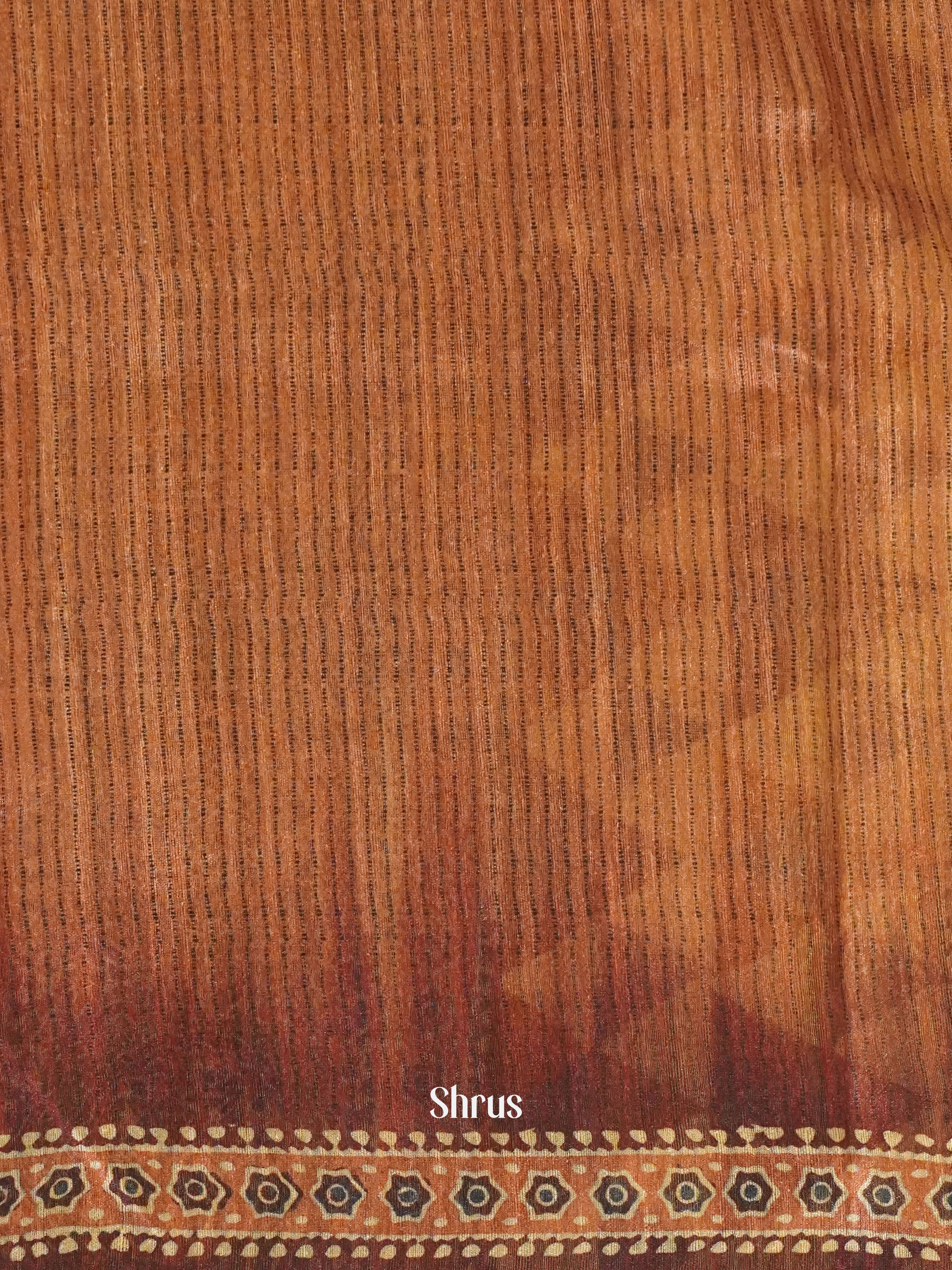 Pretty Onion Peel Semi Gicha Saree enchants with printed body , & bounded with Brown printed border , pallu lends a beautiful compliment . Comes with self blouse with border completes the ensemble