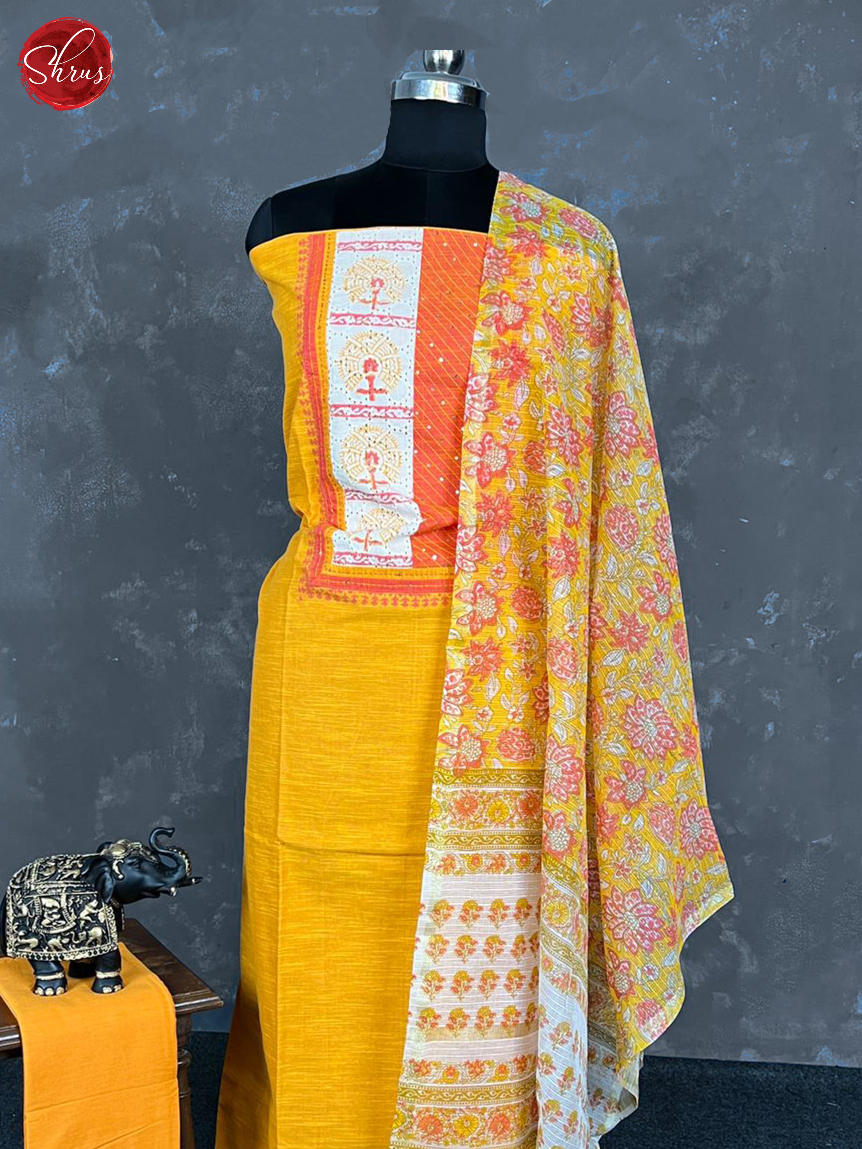 Pretty Yellow Unstitched Salwar suit with neck yoke on the top . Paired with lovely self plain bottom & printed dupatta completes the ensemble