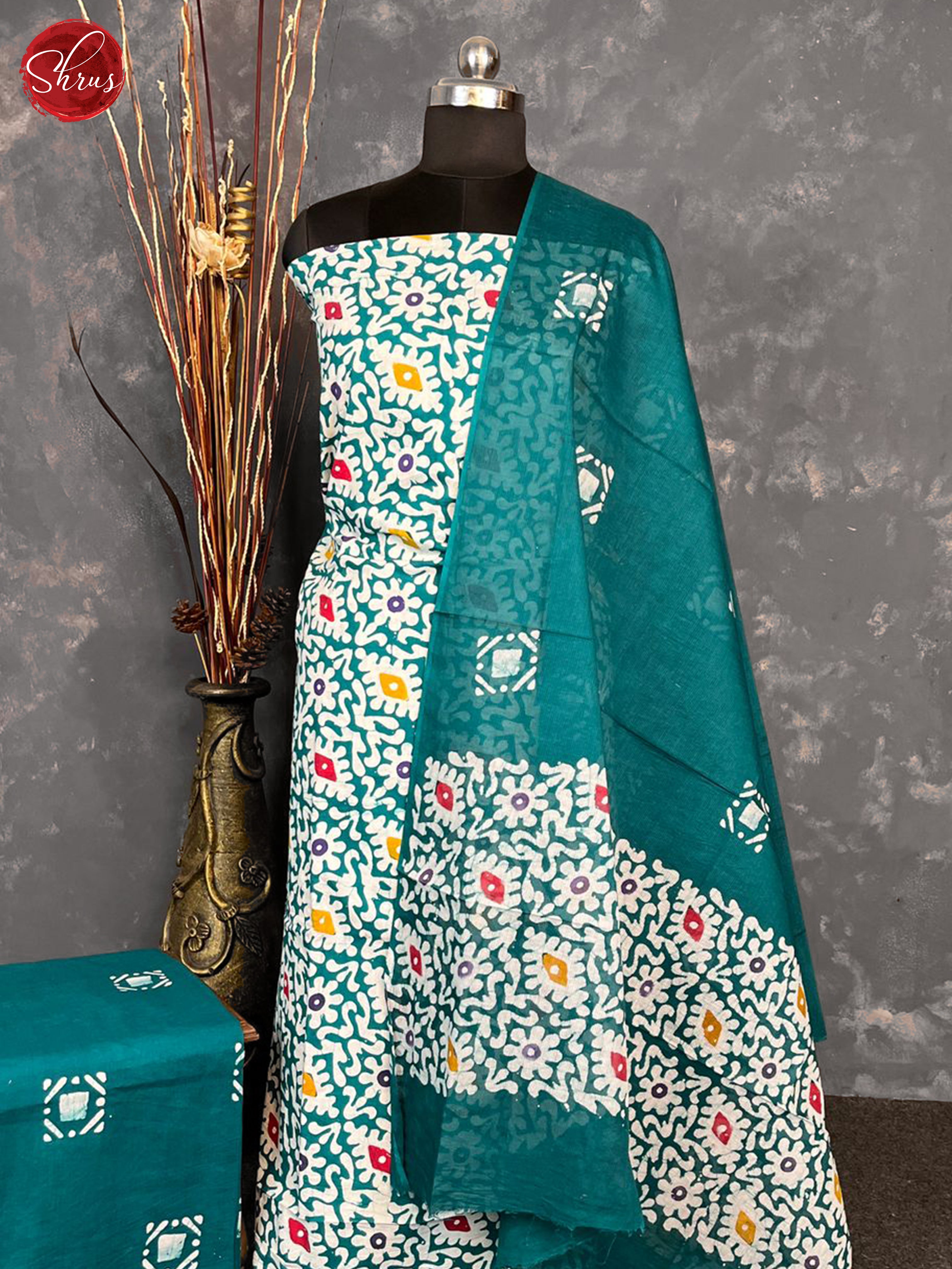 Elegant Peacock Neck Bhatik unstitched Salwar Suit with floral pattern on the top .Paired with lovely bhatik pattern self bottom & dupatta completes the ensemble