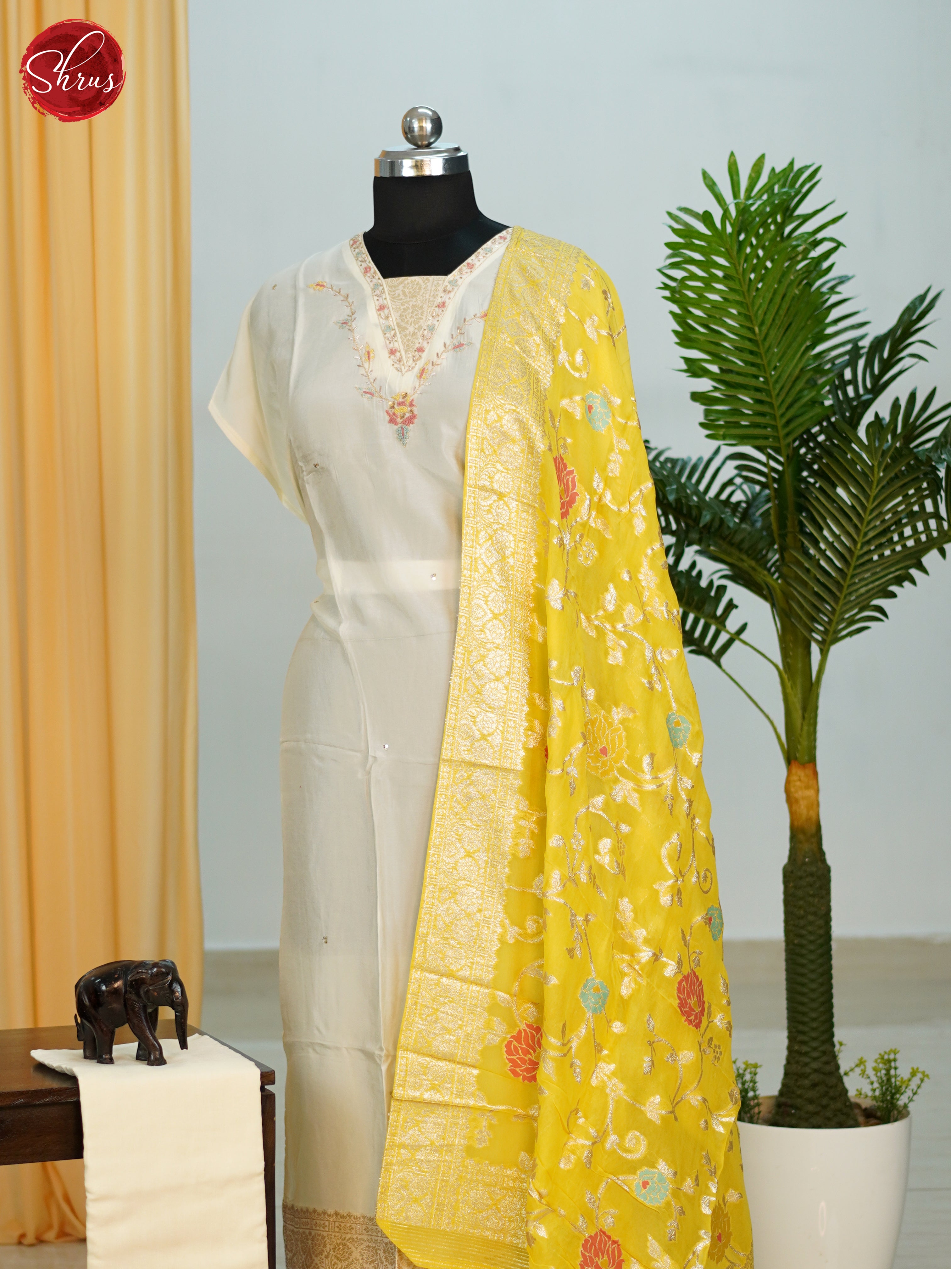 Charming Cream Unstitched Salwar suit with neck yoke on the tops . Paired with lovely self plain bottom & yellow embroidery floral dupatta completes the ensemble