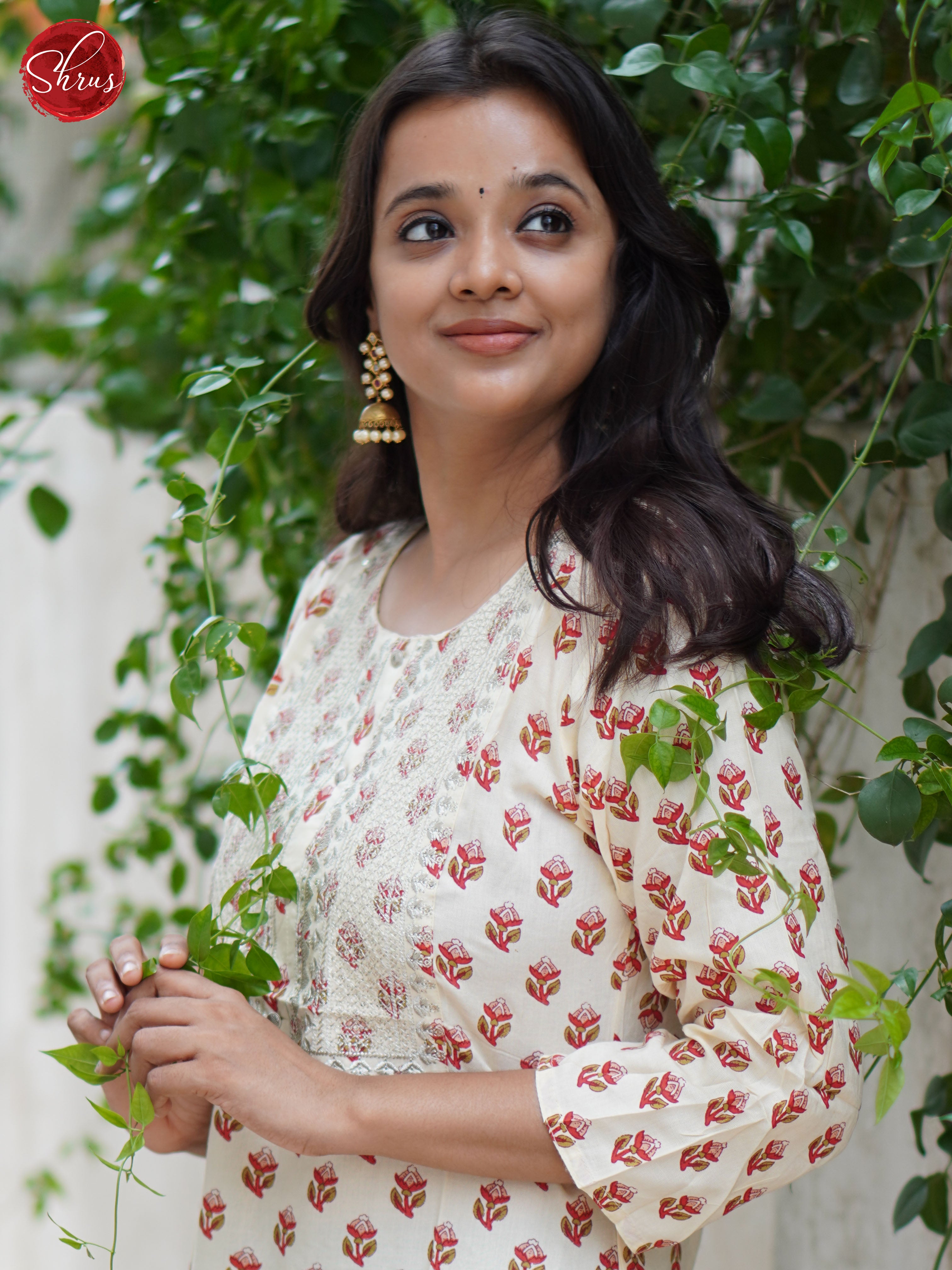White - Printed Cotton Readymade Kurti with thread work in neck yoke