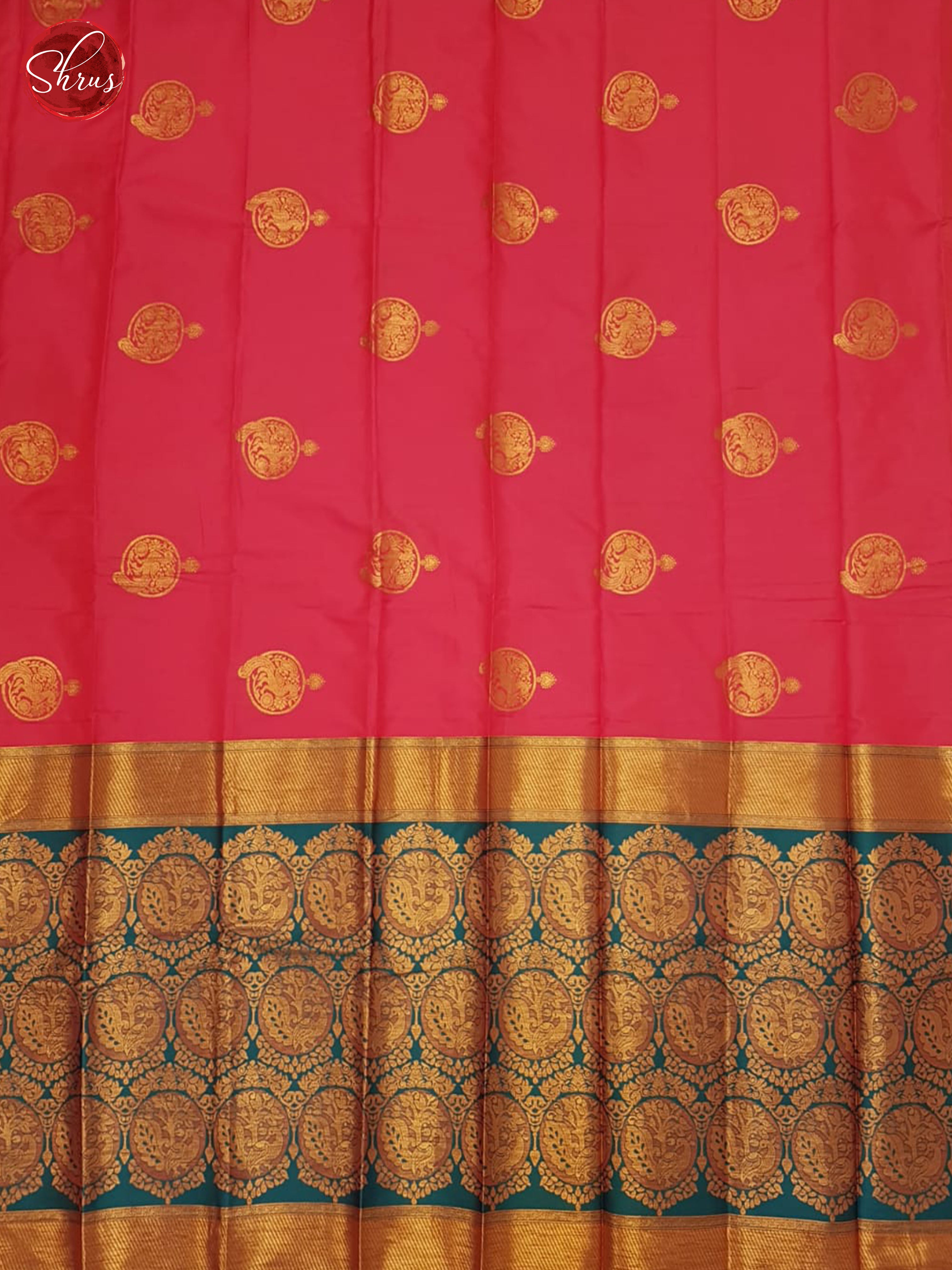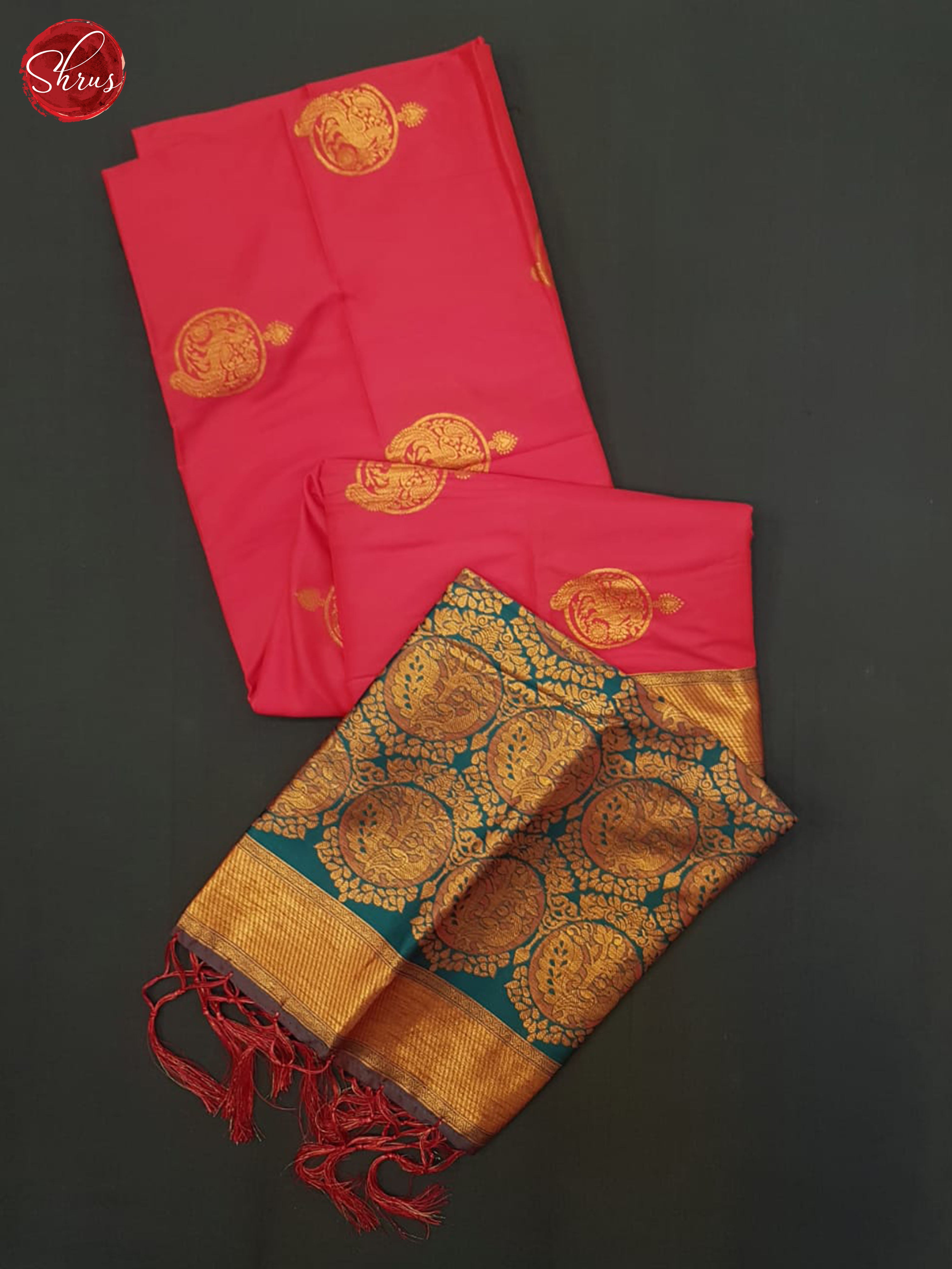 Charming Pink Semi Soft Silk gleams with gold zari woven yellis motifs on the body The chic weave is complemented with a contrast Blue zari woven pallu with zari brocade . The contrast zari brocade Blue blouse is a beautiful finish