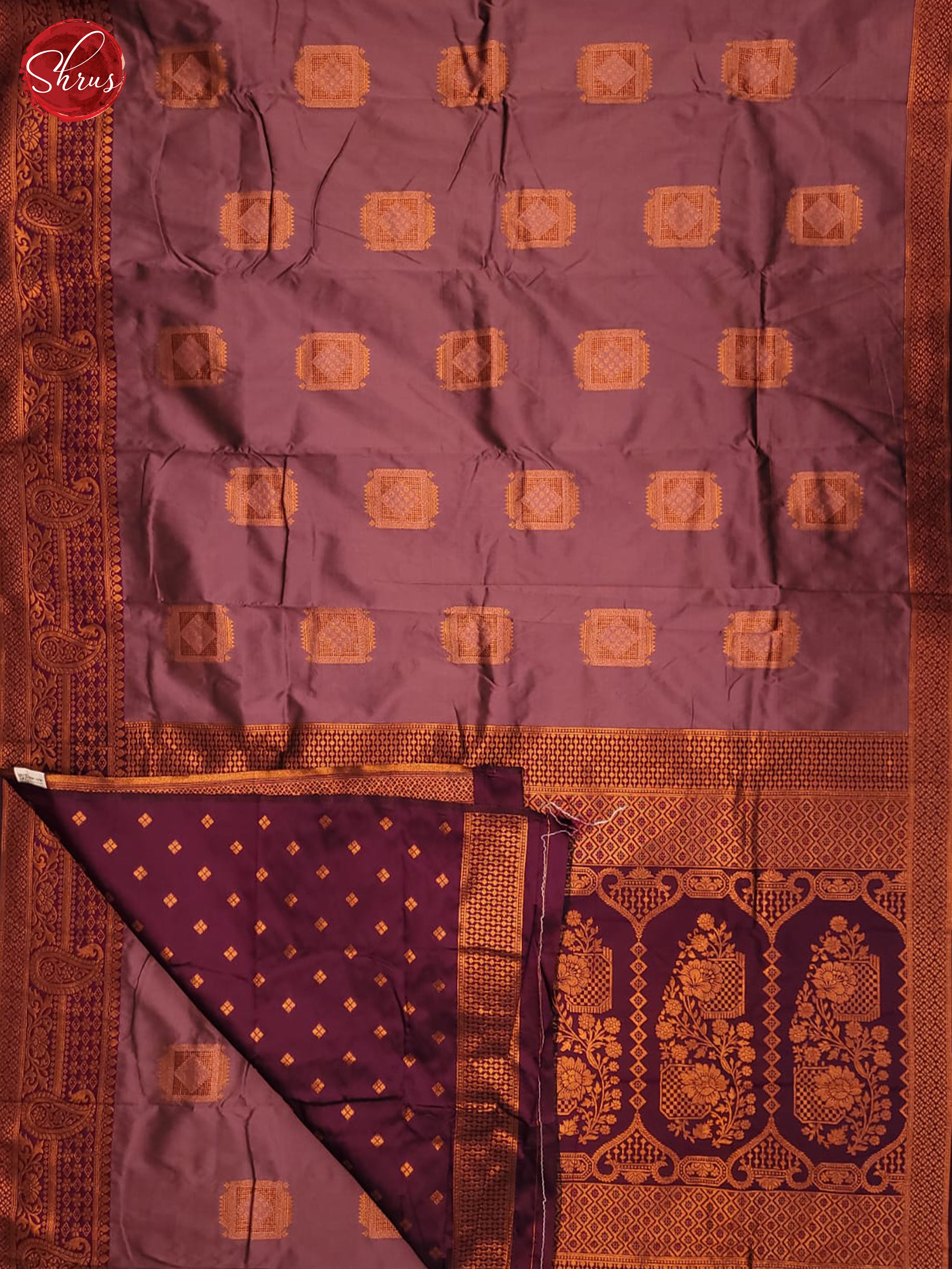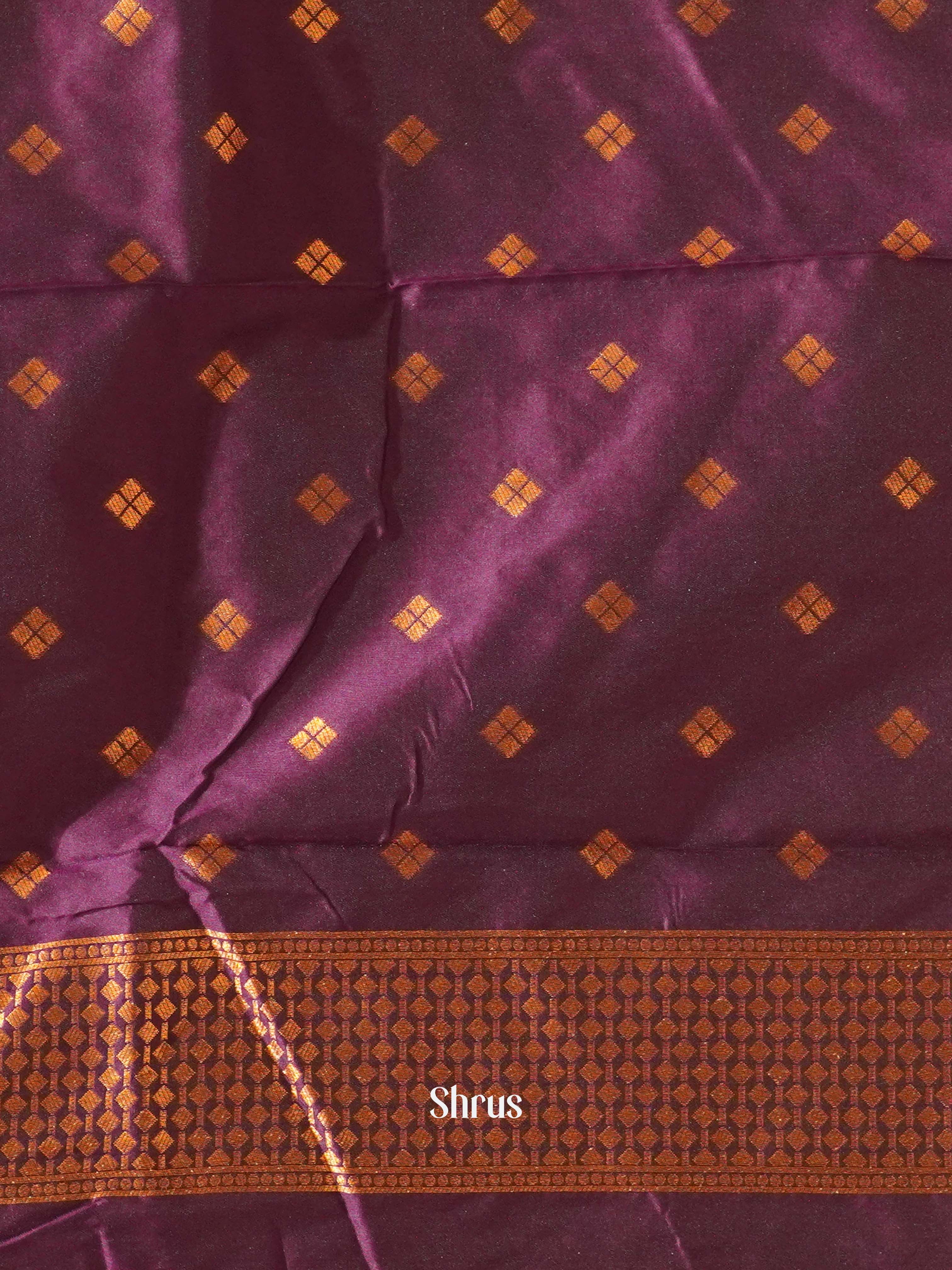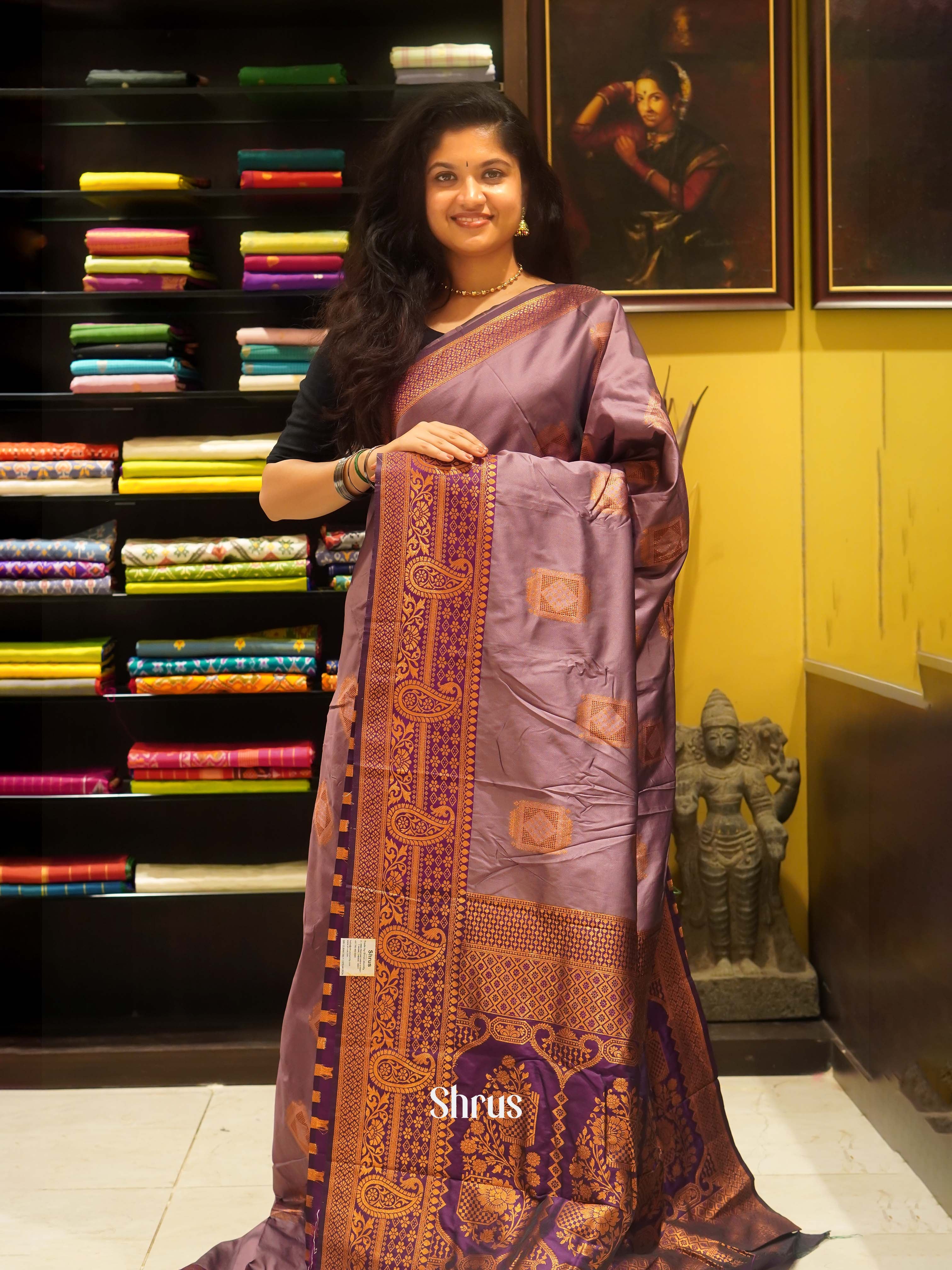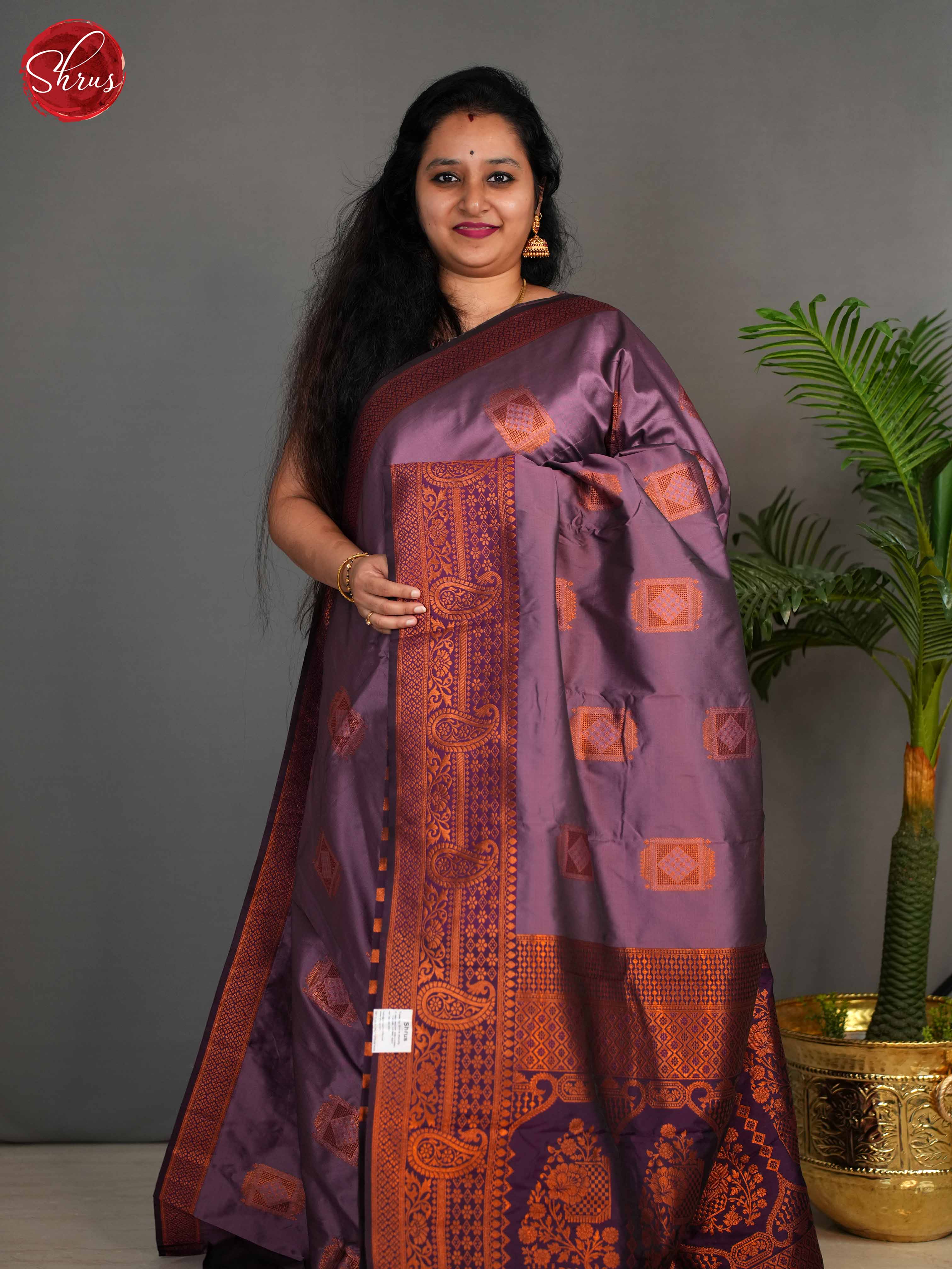 Charming Lavender Semi Kanchipuram Silk saree enchants with zari block motifs brocade on the body .The rich contrast Wine gold zari woven border & brocade pallu adds prettiness Comes with zari butta Wine blouse with zari border looks enchantingly pretty