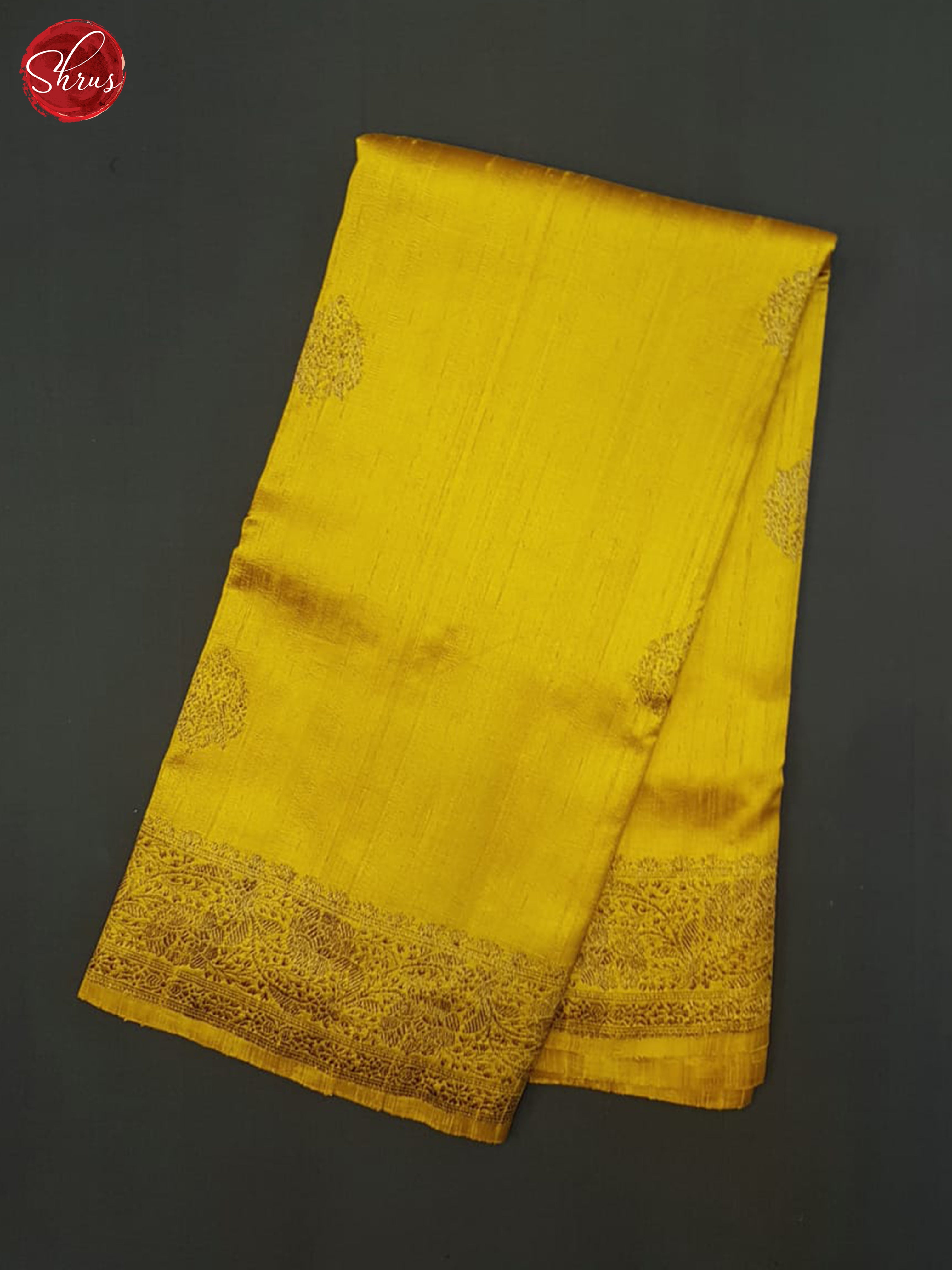 A Lustrous Mustard Dupion Silk Saree gleams with gold zari floral motifs on the body . The spellbinding self zari border enchants with floral brocade . The resplendent self zari brocade pallu with floral brocade , Kaddi lends a gorgeous complement. The plain self blouse with zari border is a classy finish!