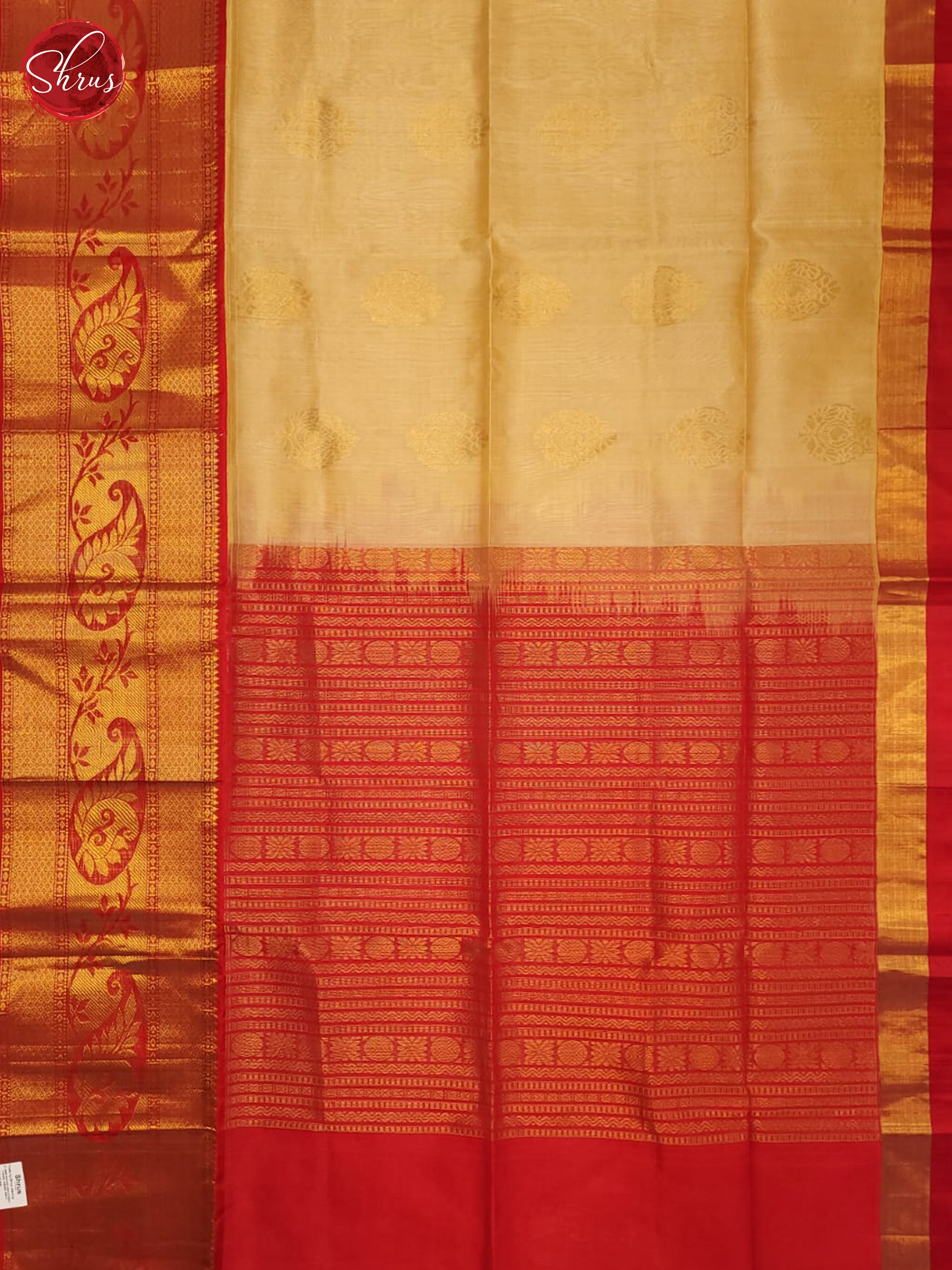 Pretty Sandal Silk Cotton Saree enchants with gold zari woven floral motifs on the Body & bounded by a Contrast Red Zari Border with floral vines . The splendid Red Contrast zari woven brocade Pallu And plain Red Blouse with zari border gives a chic twist