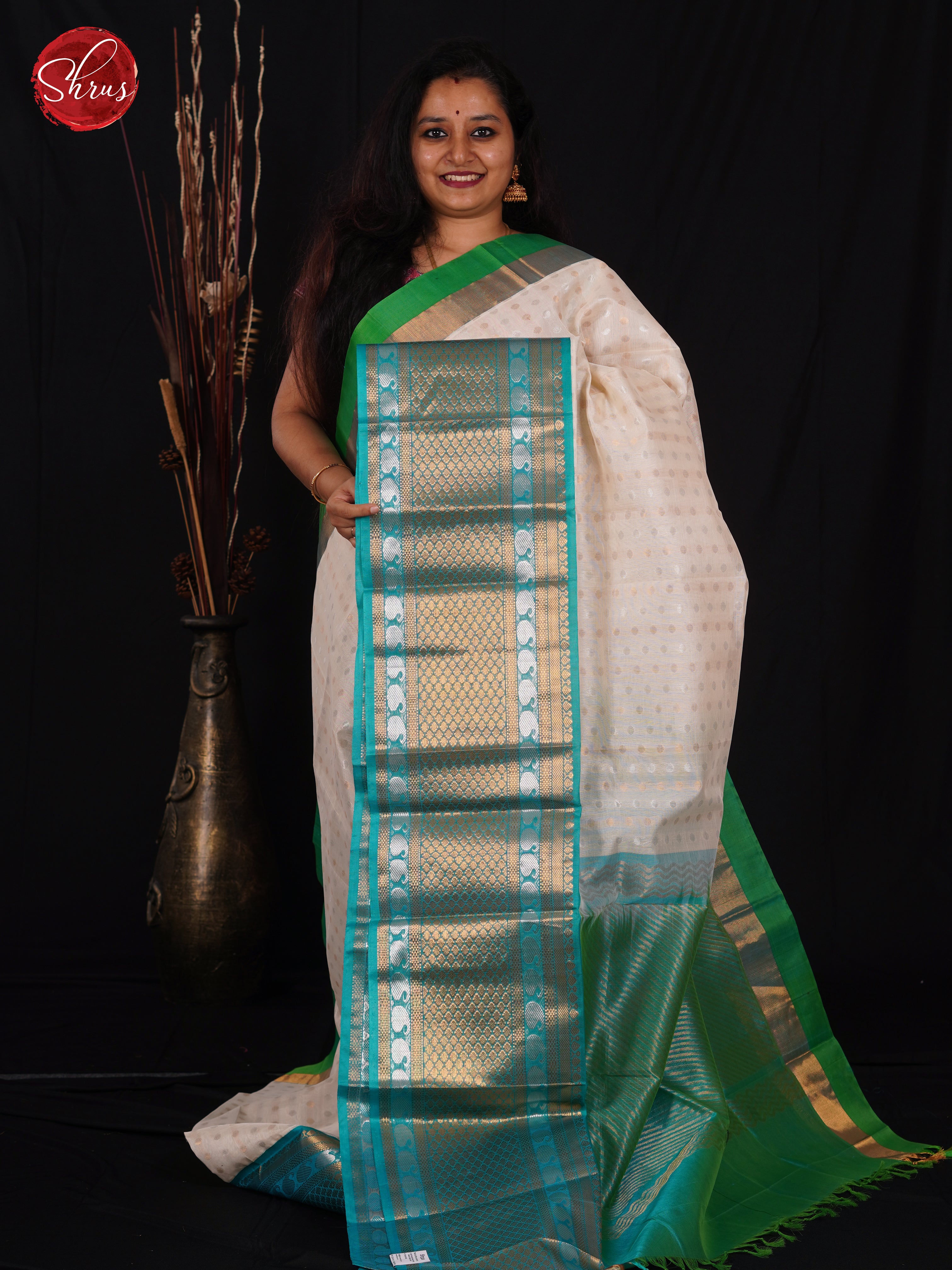 Charming Cream Silk Cotton Saree enchants with gold zari woven floral buttas on the Body & bounded by a Contrast Green Zari Border . The splendid Green Contrast zari woven brocade Pallu And plain Green Blouse with zari border gives a chic twist