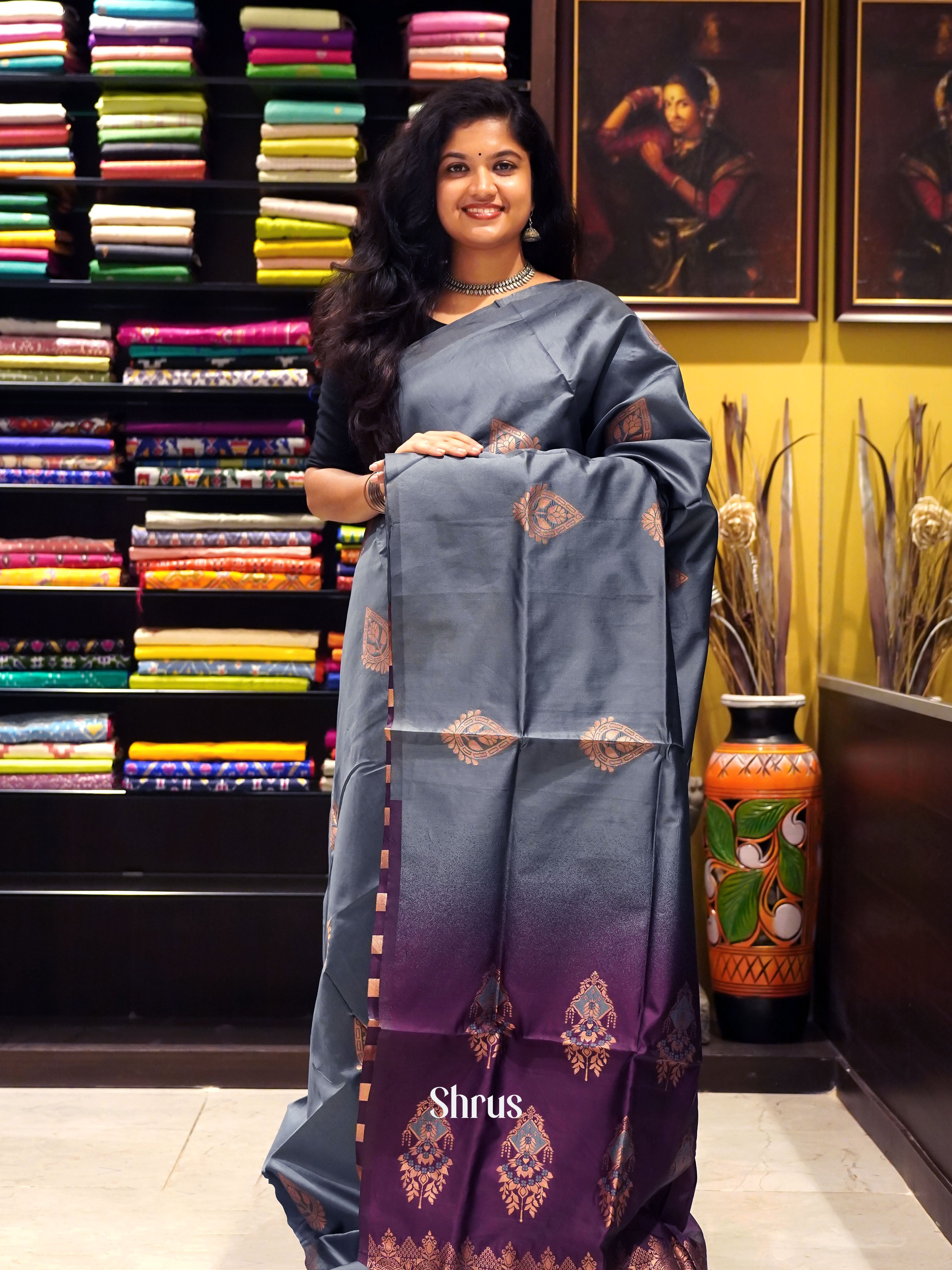 Beautiful Grey Semi Silk saree enchants with zari woven floral motifs on the body .The rich contrast Wine zari woven brocade Pallu adds elegance . Attached with butta Wine blouse with border completes The ensemble