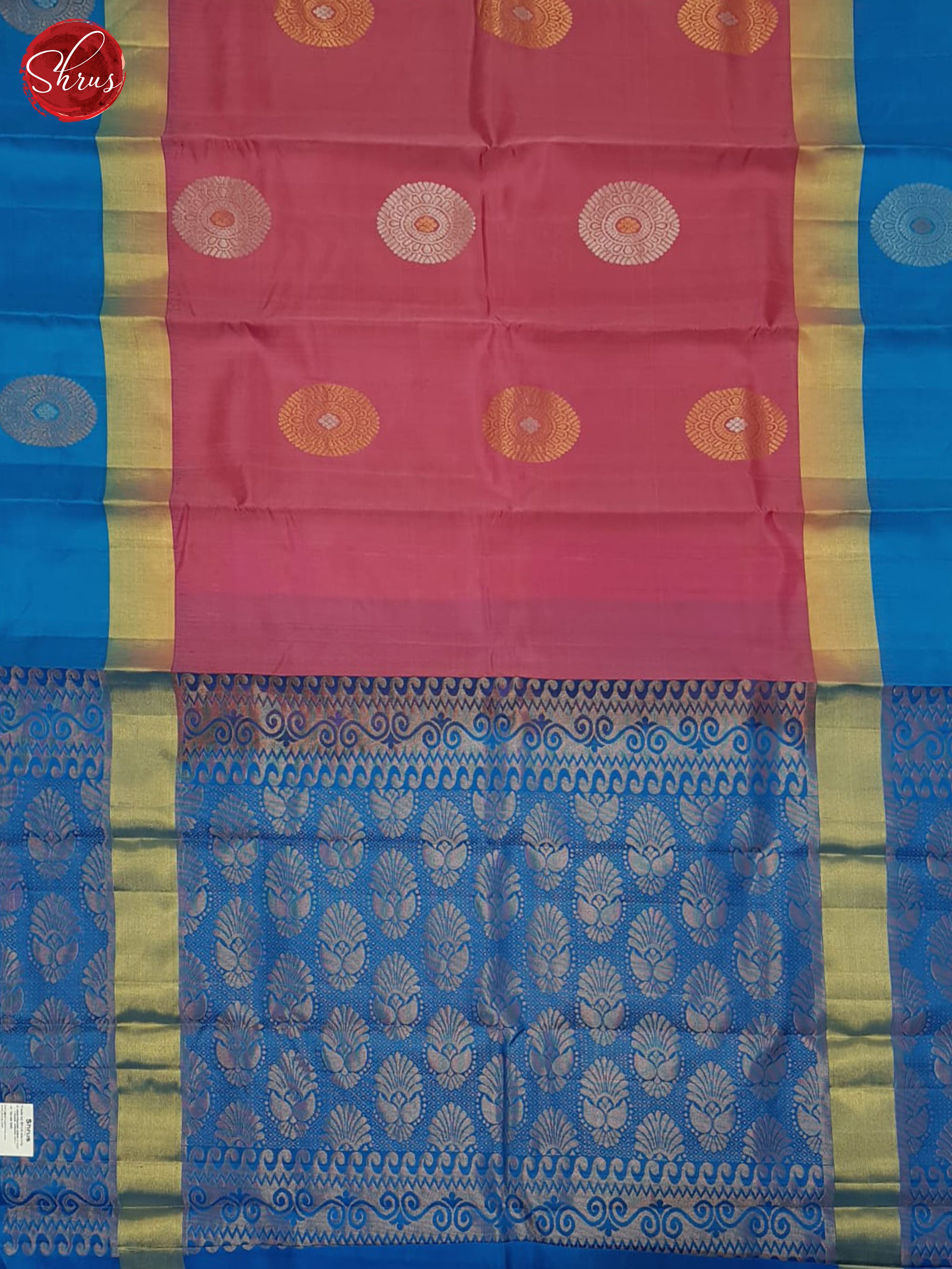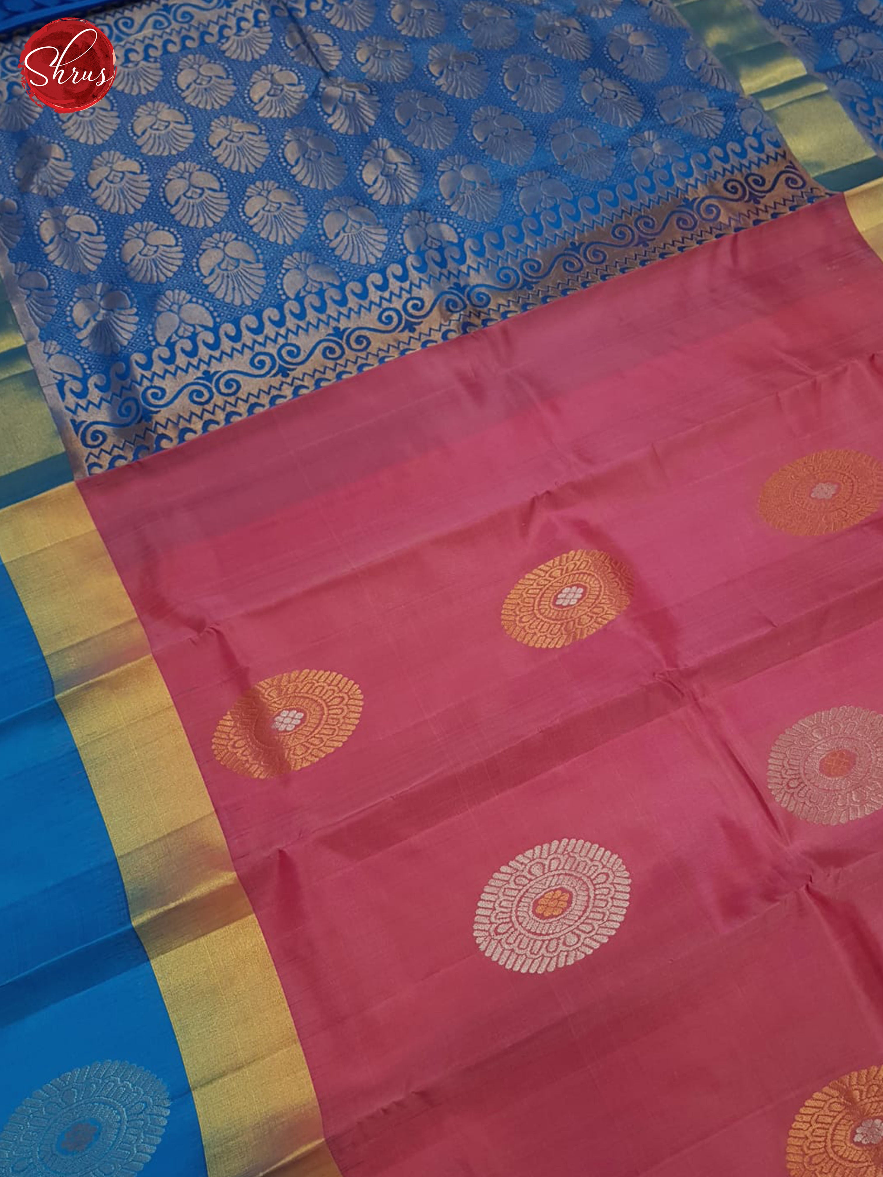 Elegant Pink Soft Silk Saree gleams with gold, silver zari woven floral motifs on the body . The rich contrast Blue zari border & pallu with gold zari brocade accentuate the classy weave. A plain Blue blouse with border renders a pretty finish.