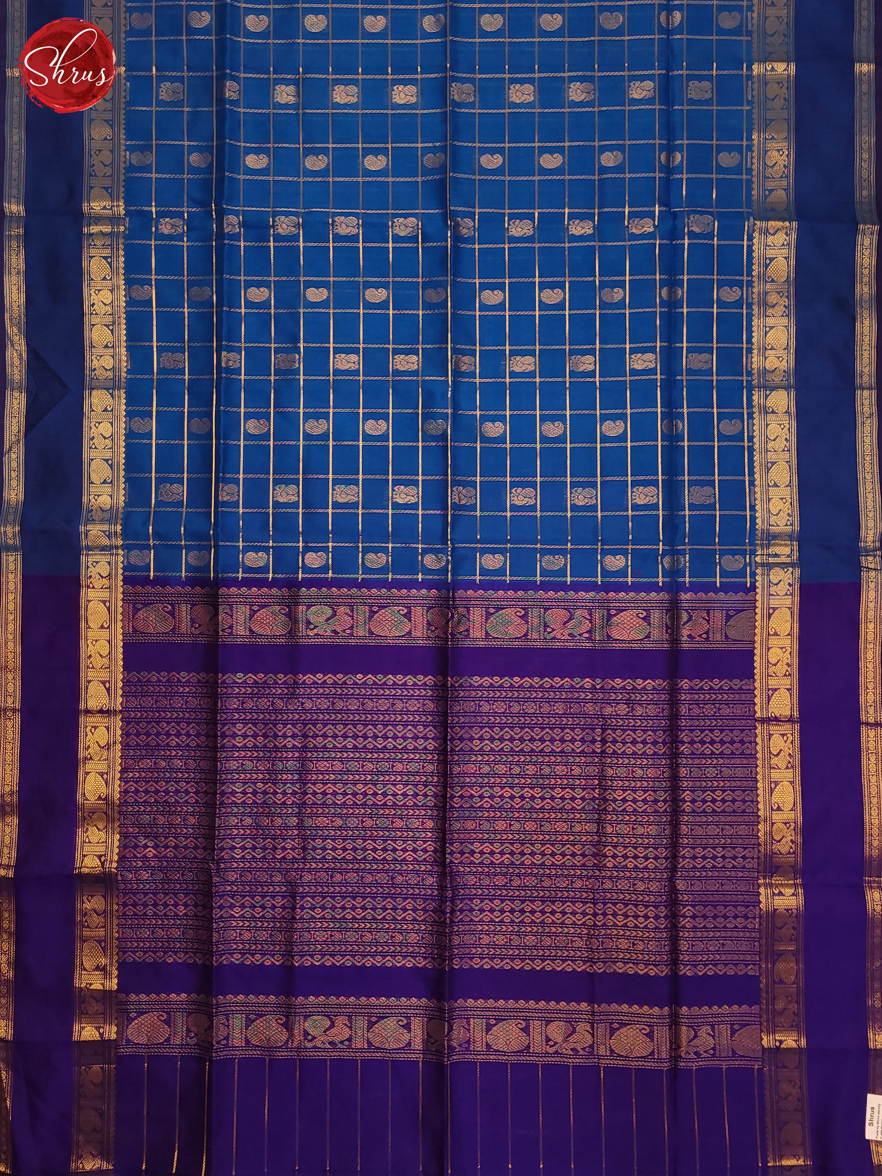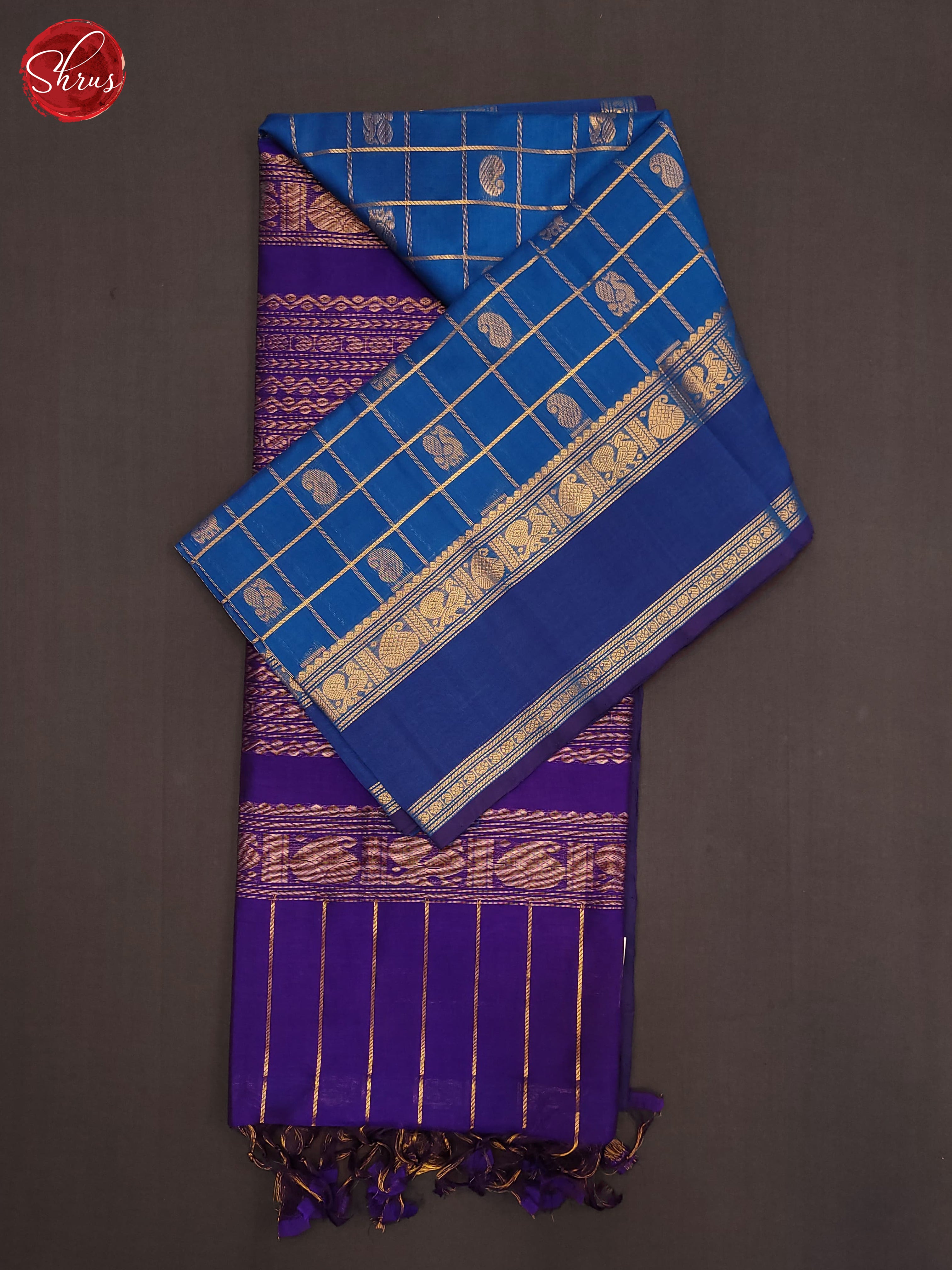 Beautiful Blue Silk Cotton Saree enchants with zari woven checks , buttas on the Body & bounded by a self Zari Border . The splendid Violet Contrast zari woven brocade Pallu And plain Blouse with border gives a chic twist