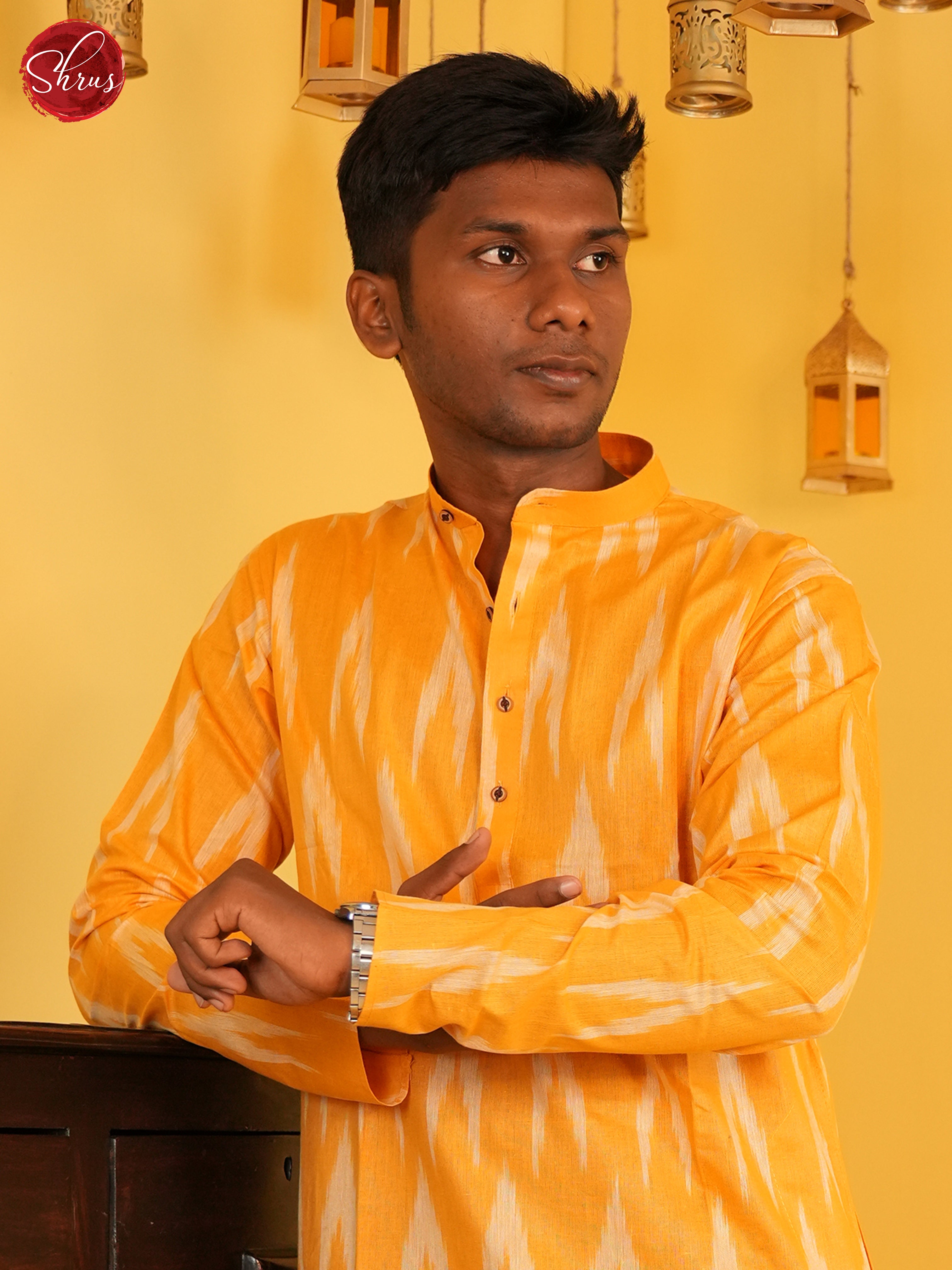 Add an ethnic touch to festivities with this Orange Ikkat full sleeves kurta for men. Simple yet striking, the full-length men's kurta can be paired with jeans and just rolled up the sleeves for a more relaxed look.