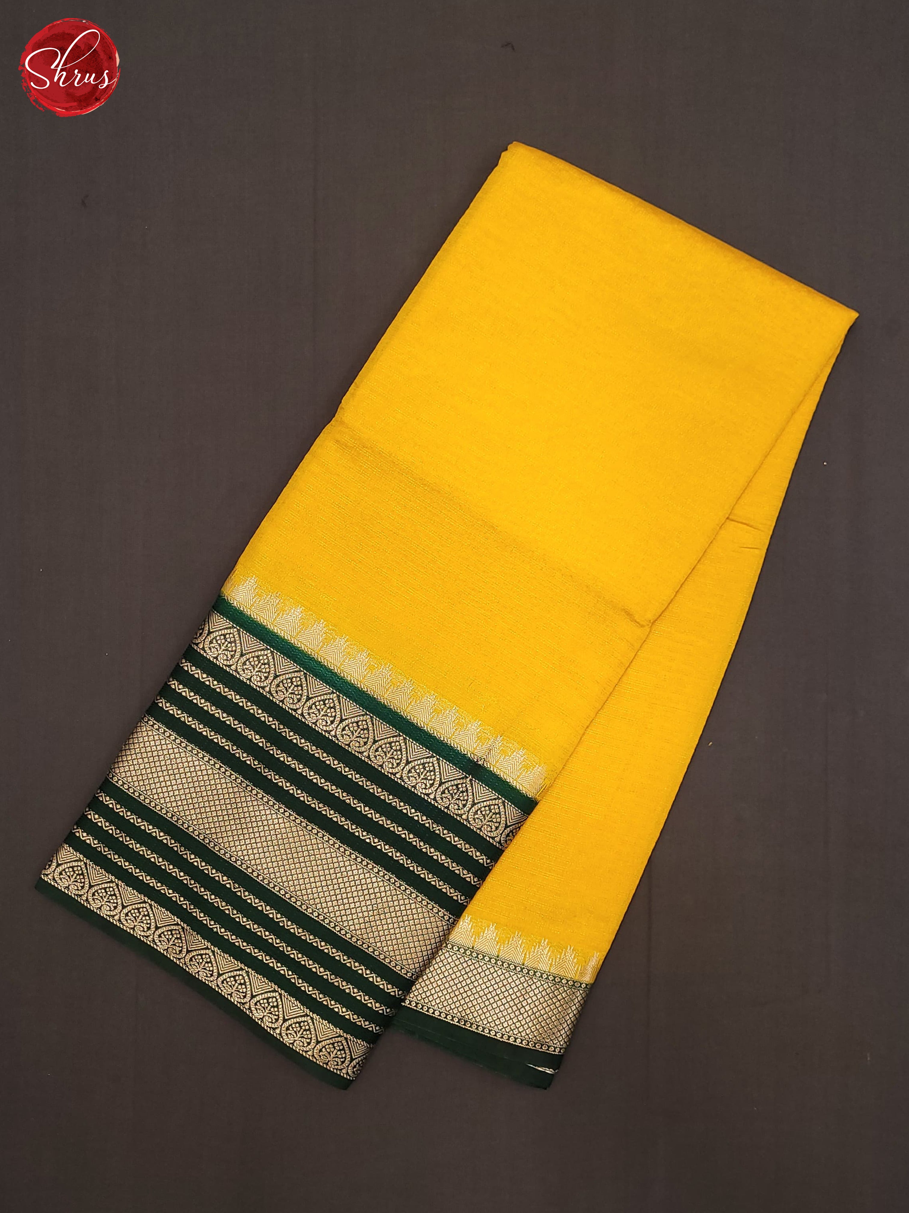 Bright Yellow Semi dupion saree with plain body & bounded with Green zari woven border .The contrast Green zari woven Pallu & blouse with zari border completes the ensemble