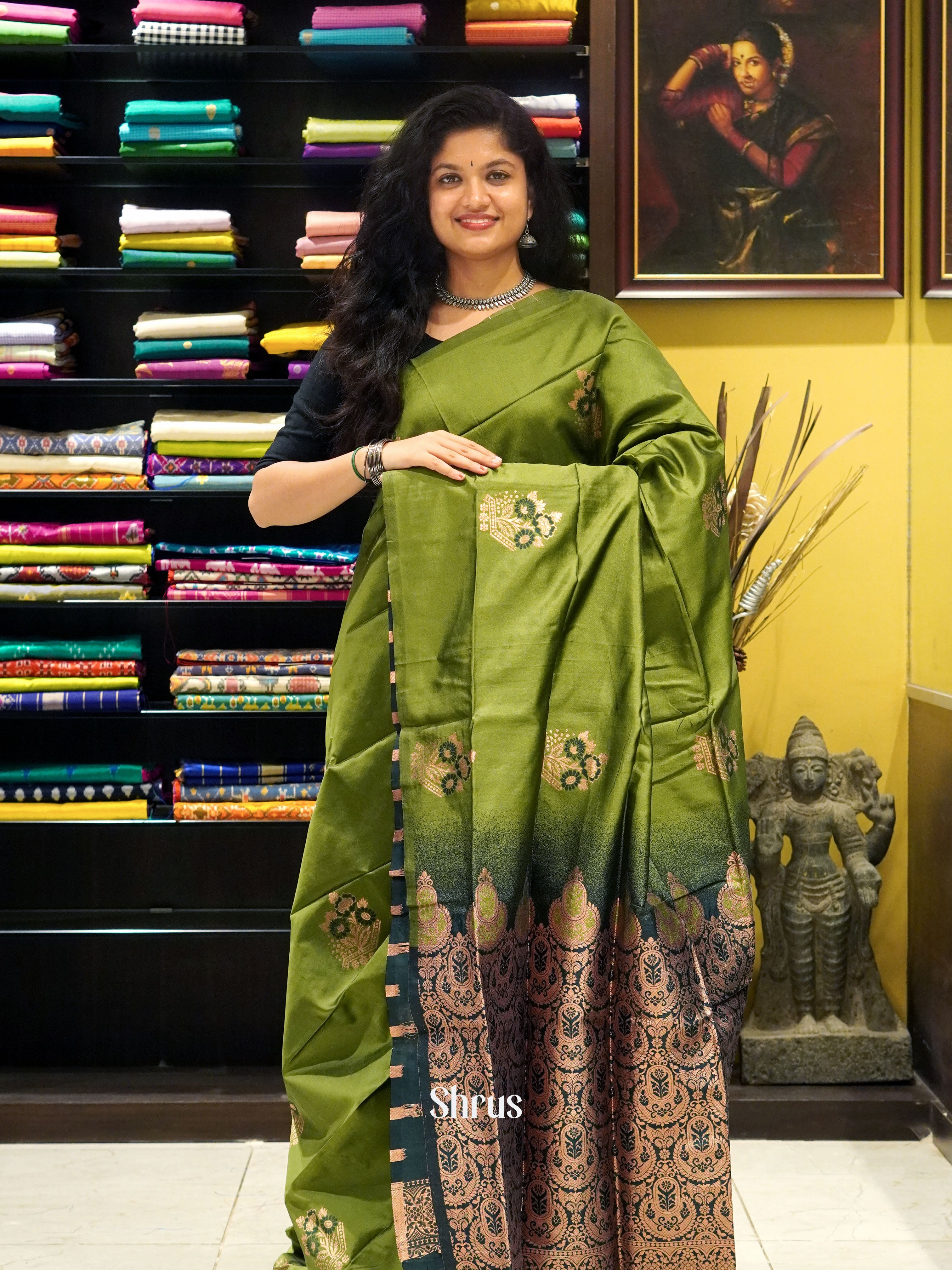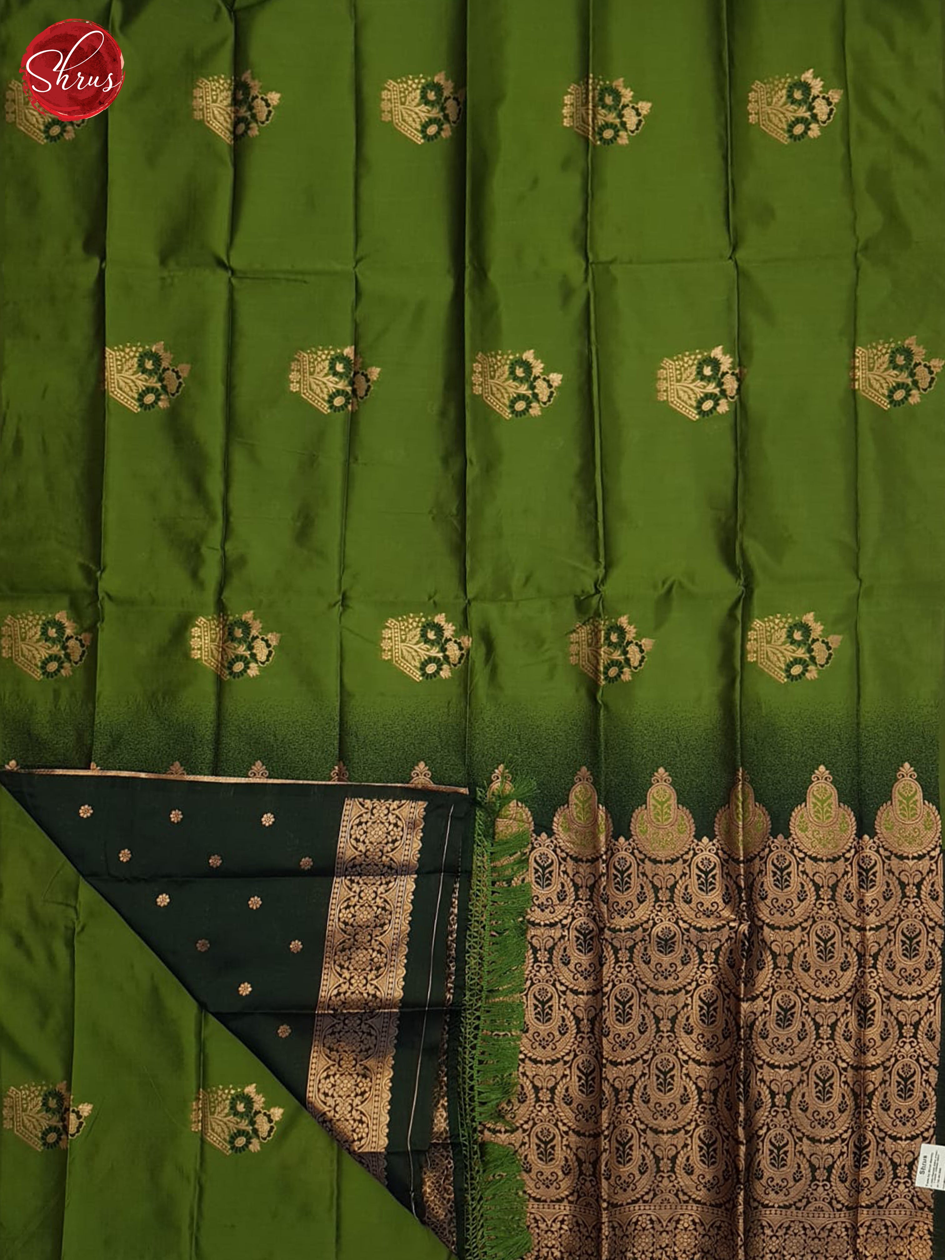 Pretty green Semi soft Silk saree enchants with zari woven floral motifs on the body .The rich dark green zari woven brocade Pallu adds elegance . Attached with zari butta dark green blouse with border completes The ensemble