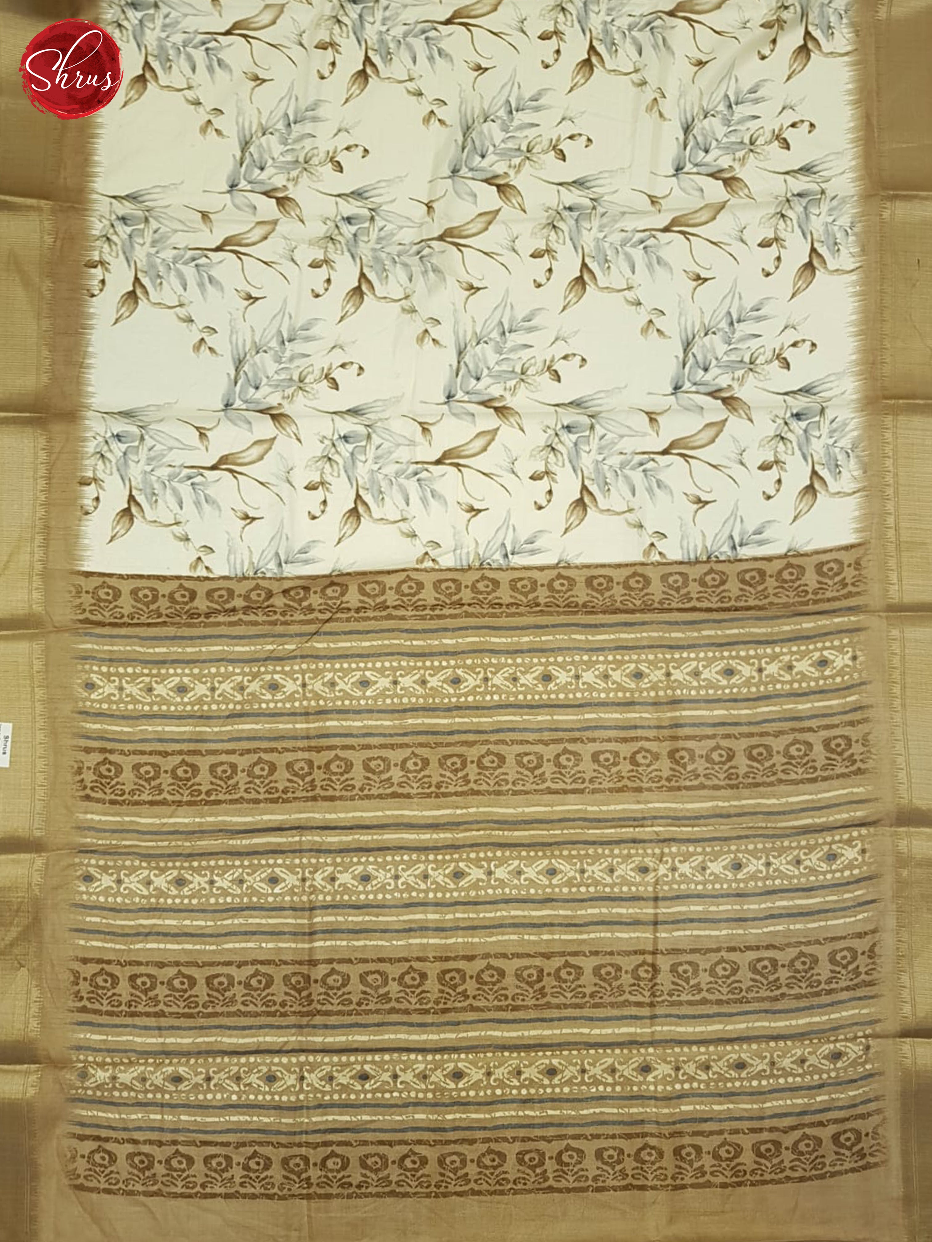 Pretty Cream Semi Crepe Saree enchants with floral print on the body & bounded with brown zari border & pallu compliments beautifully Comes with brown blouse with zari border gives a perfect finish
