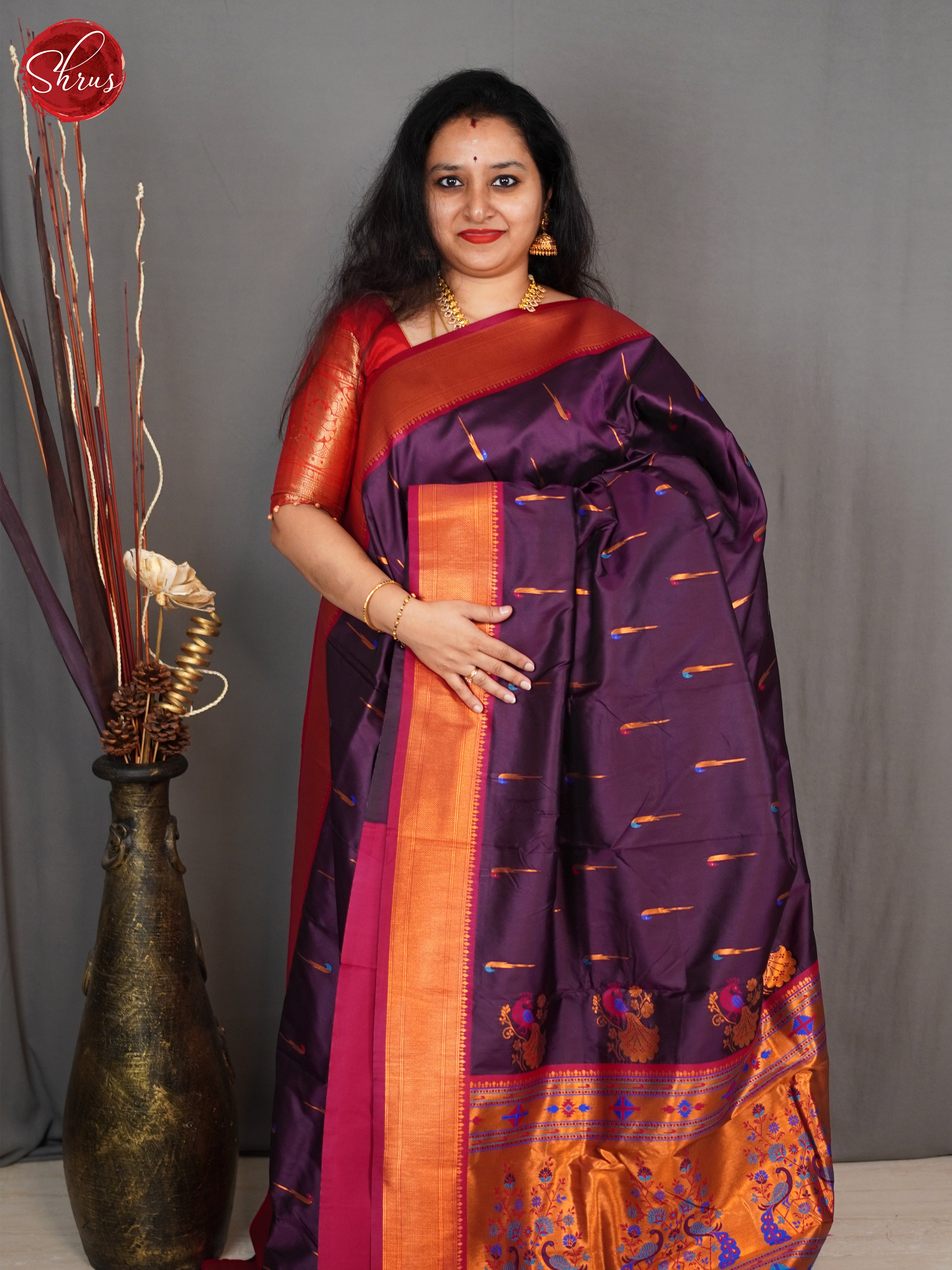 Pretty Wine Semi Paithani saree gleams with zari woven buttas on the body . The Red zari border and pallu with paithani inspired floral brocade enhances the appeal. Comes with a Red blouse with zari Border gives a perfect finish